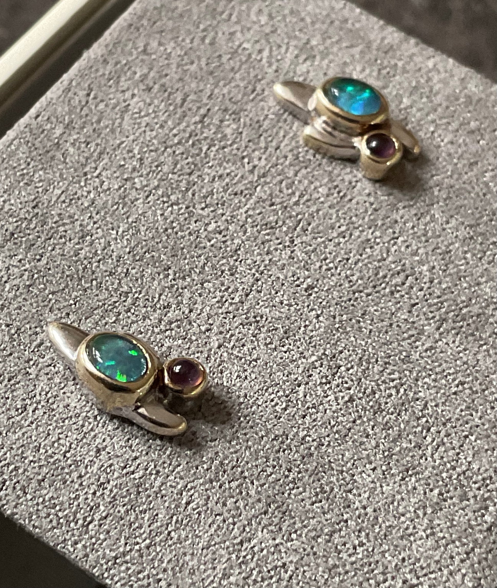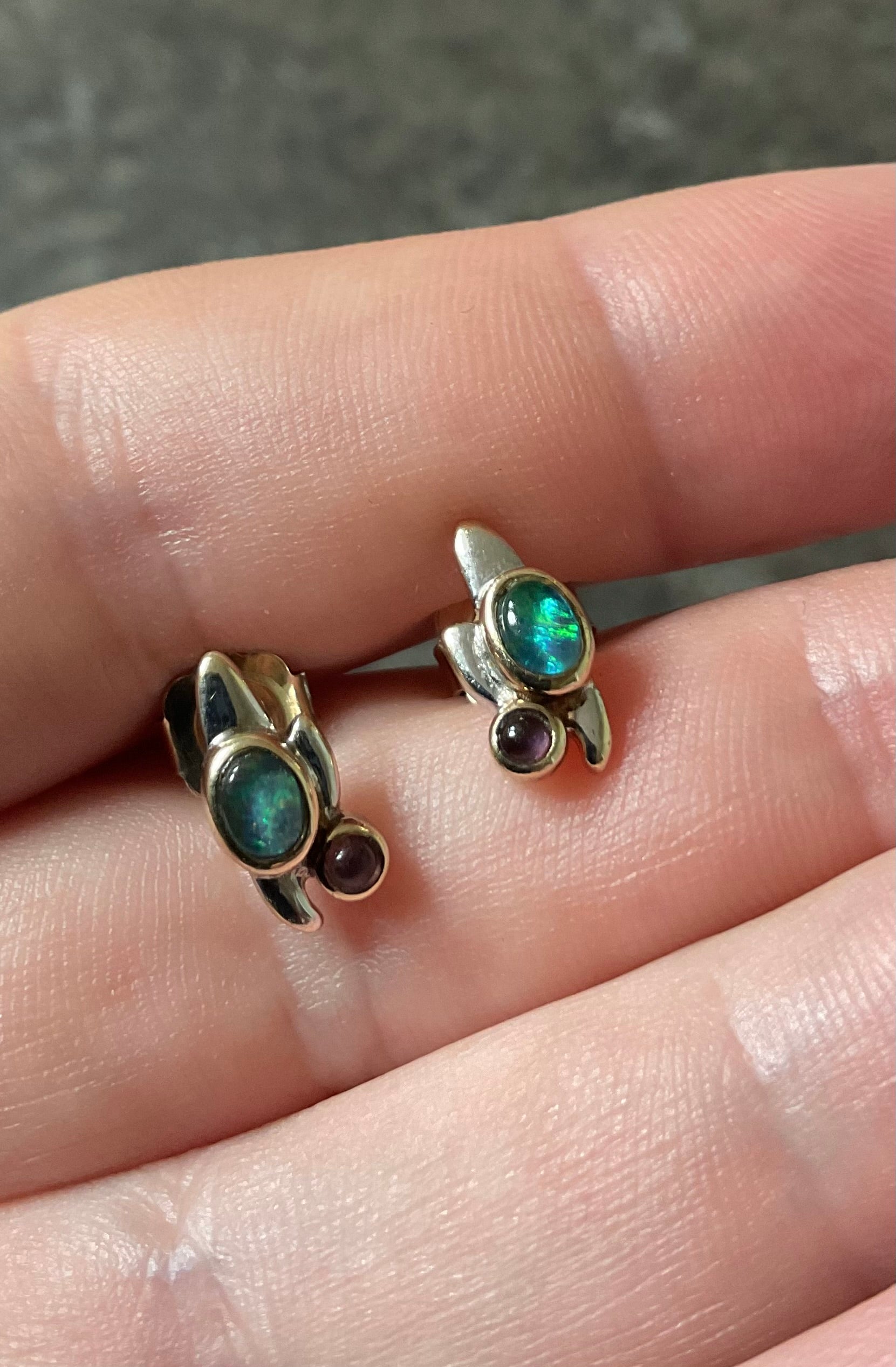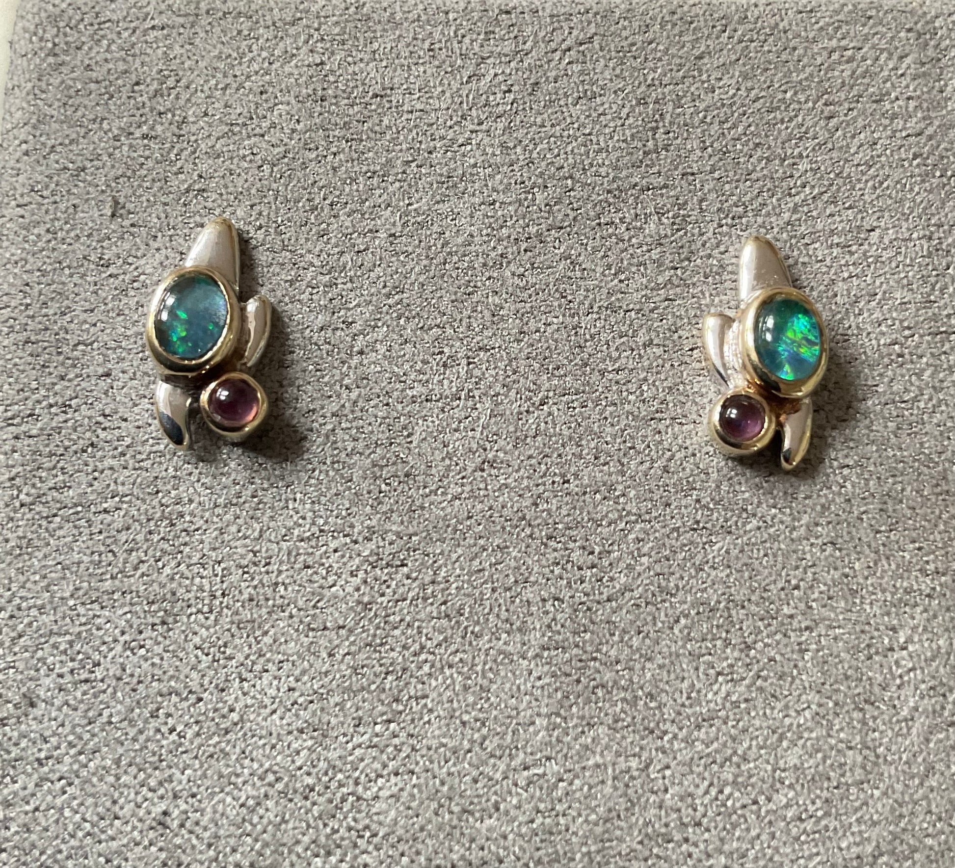 Clogau 9ct RARE Vintage Monet Water Lilies Opal and Amethyst cabochon stud earrings yellow and white gold
