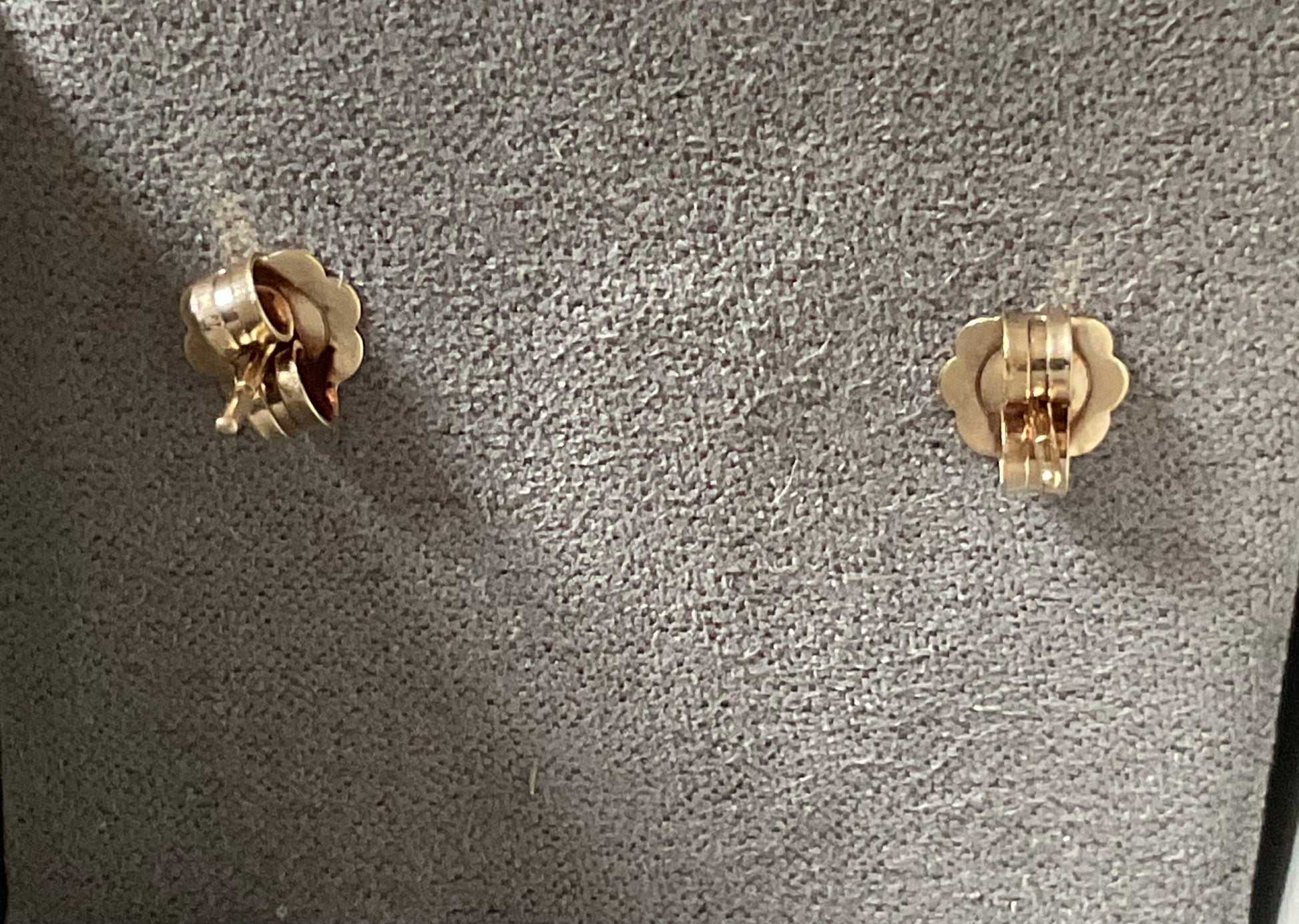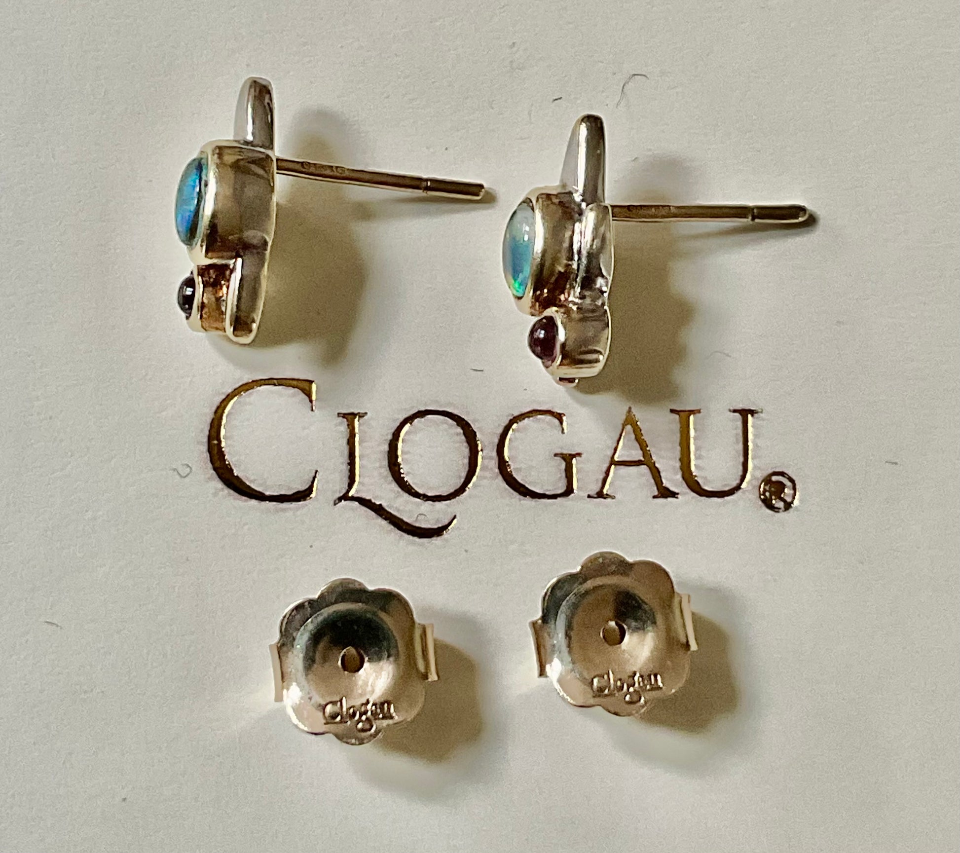 These absolutely gorgeous little vintage Clogau earrings are very hard to come by. They are from their Monet Water Lilies range and feature a 4x3mm oval opal cabochon and a round cut 2mm amethyst cabochon. The main background of the design is 9ct white gold but there are bands of yellow gold around the gemstones. The back of the earring and the butterfly back has the Clogau stamp on and the post of the earring has the 375 Clogau 9ct gold hallmark. The earrings are 1.2cm long and 6mm wide. They are preloved but in good condition with small signs of wear when you look for them and the posts are possibly not 100% straight/at the original angle but nothing you’d notice when wearing them. They will come in a Clogau box.