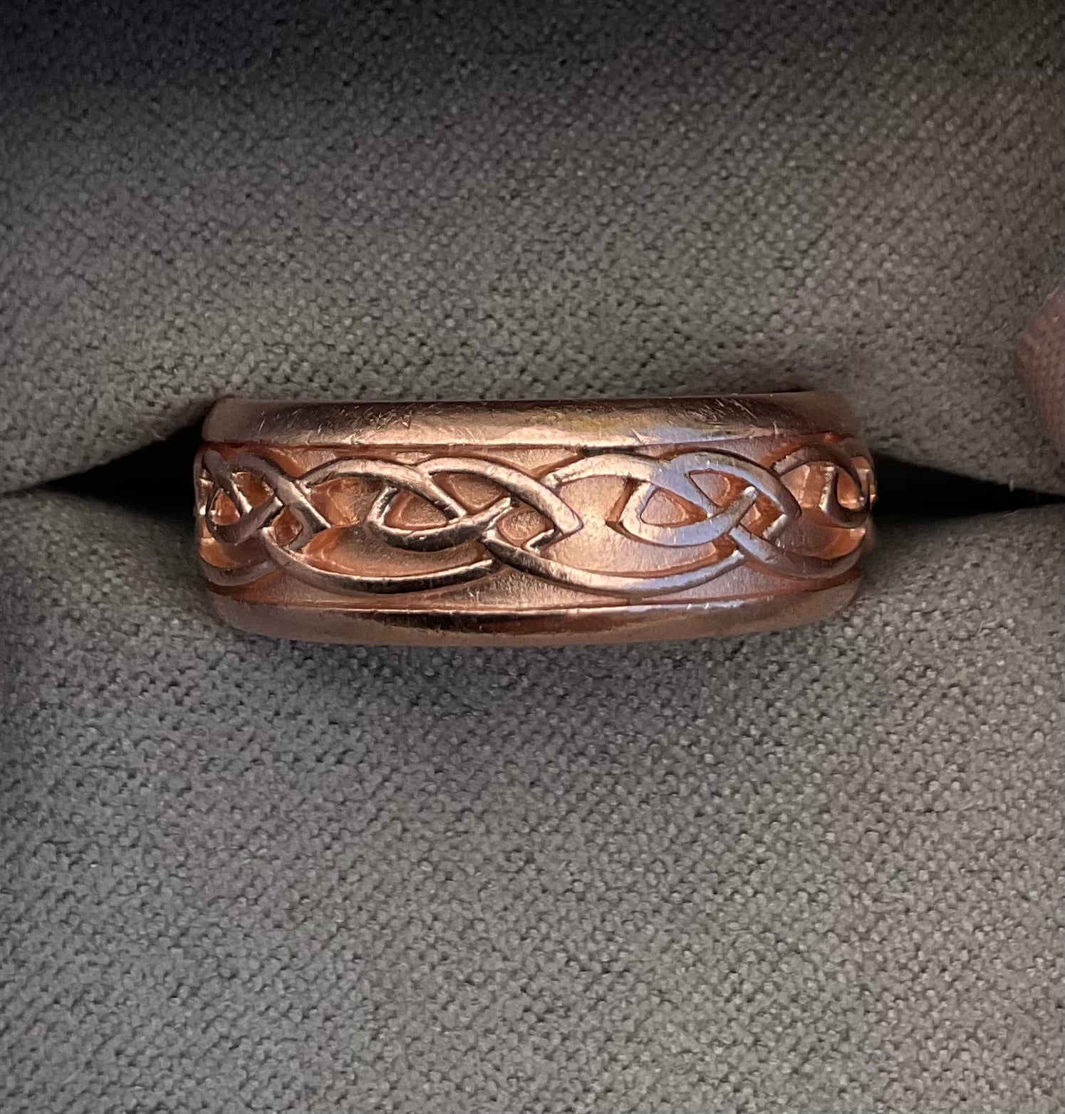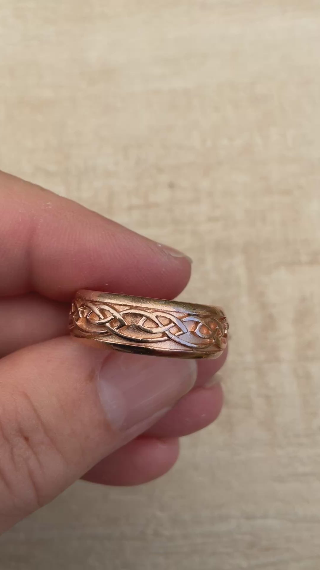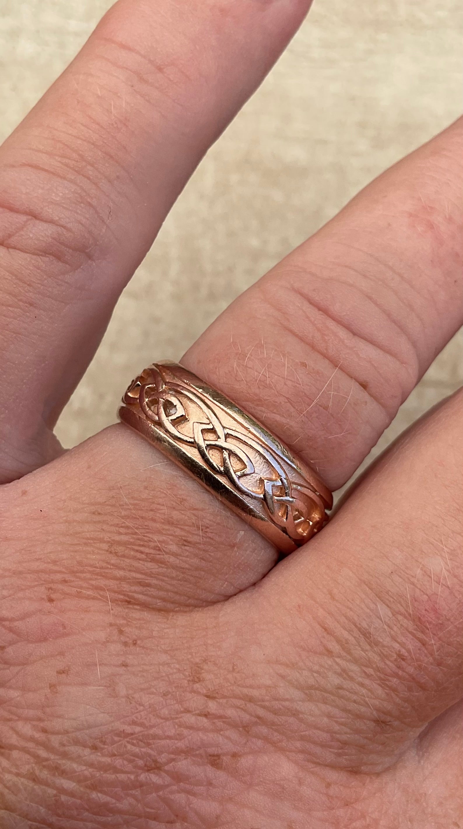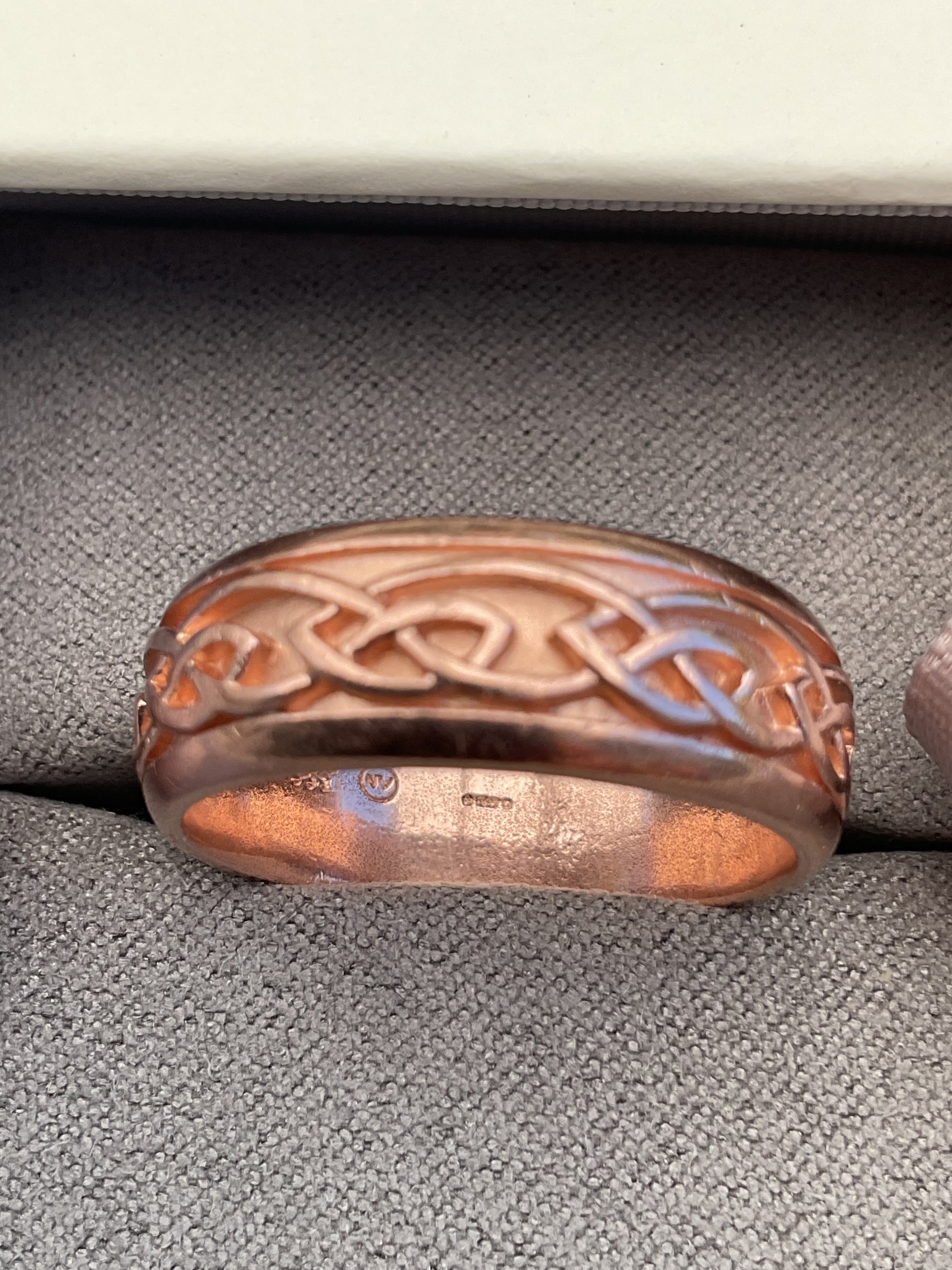 This is an attractive, eye catching ring that is suitable for ladies and gents alike. It would make a lovely wedding ring but can obviously be worn on any finger and makes a fab thumb ring! It’s a substantial 7.75g of 9ct rose gold and is 8mm wide. It has all the Clogau stamps and hallmarks and will come in a Clogau box. It has been worn and has visible surface wear across the surface of the ring. The inside of the band has a texture to it and it makes the hallmark a little unclear. Please see the photos and video for evidence of wear.