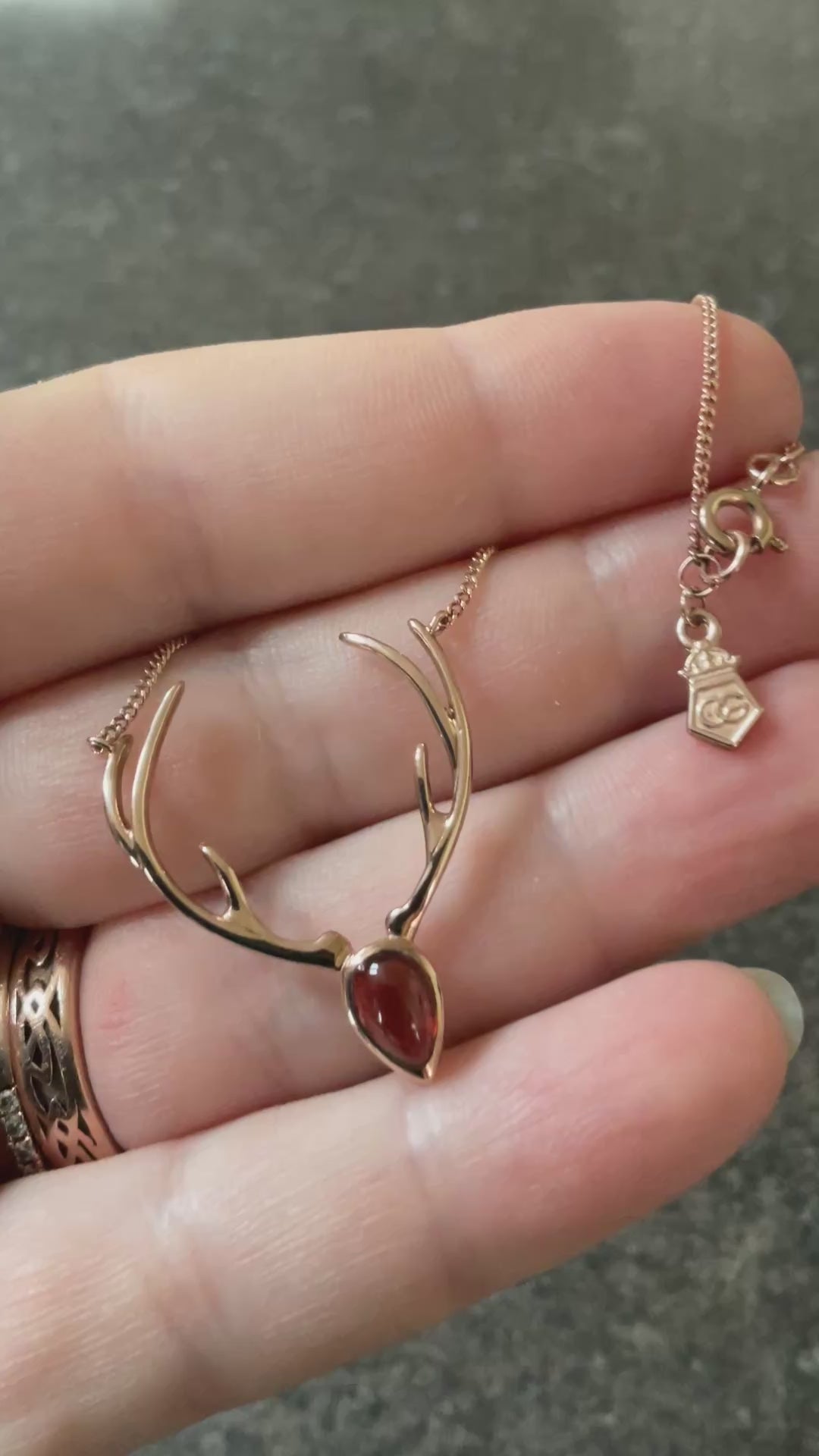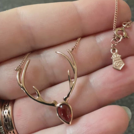 This is a very rare and unusual Clogau necklace, made completely from 9ct rose gold. The Stags head features a beautiful pear cut Garnet cabochon measuring 7x5mm, with 2 rose gold antlers above. The pendant measures 3cm in height and 2.5cm wide. The rose gold chain measures around 17” in length and attaches to the tip of each antler in a necklet style. The back of the pendant is stamped Clogau and the little tag near the clasp has further Clogau stamps and the 375 hallmark. The necklace is preowned but in very good condition with small signs of wear on close inspection. It comes in the wooden box shown, that is in good condition on the outside, with small wear but the cream interior has perished and is flakey. I can put the necklace in a white Clogau box if you prefer, please let me know as soon as you’ve completed your purchase.