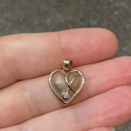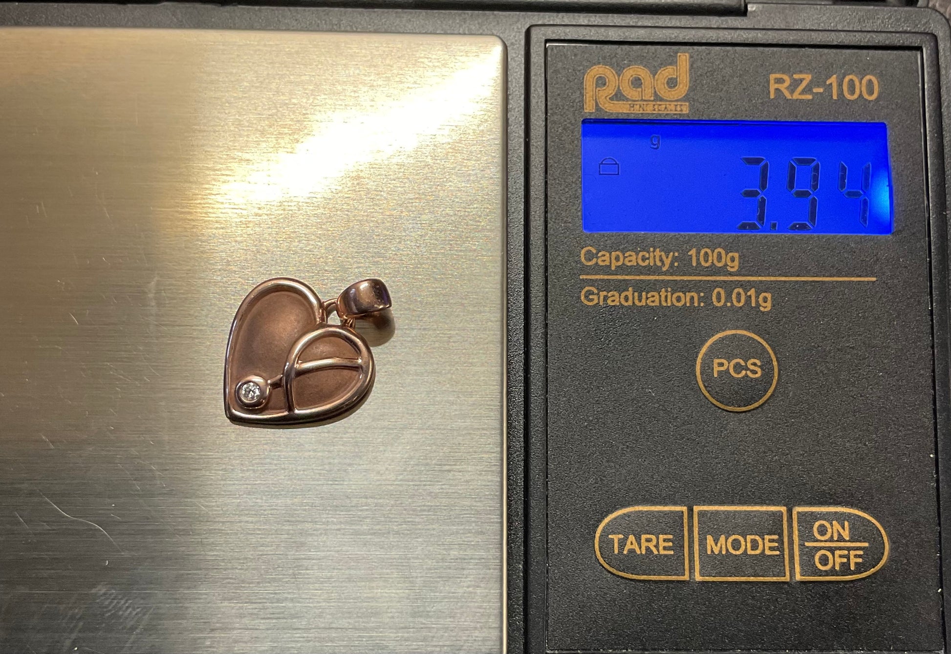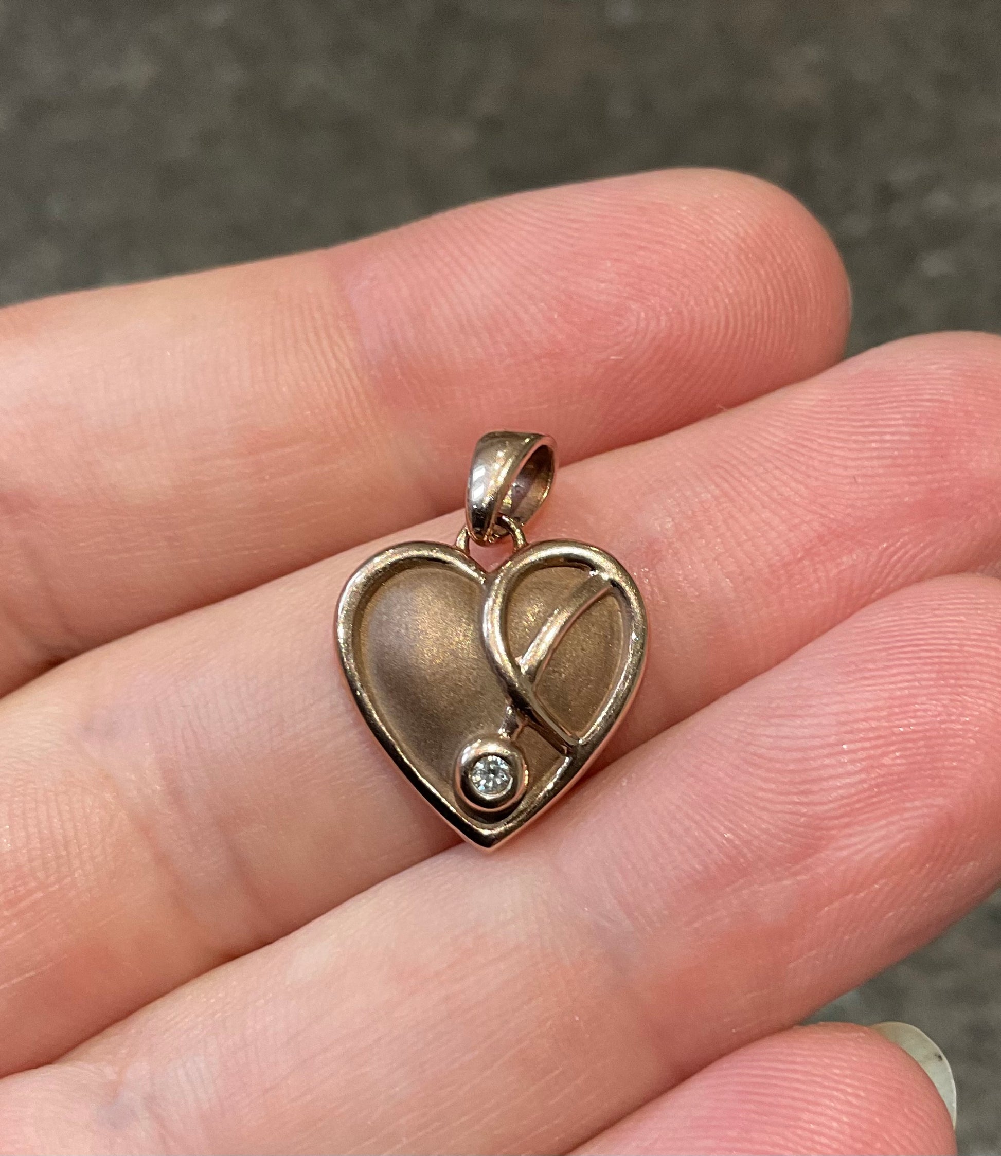 This is a beautiful Clogau Heart shaped pendant in a mix of mat and shiny polished 9ct rose gold. At the bottom of the heart is a gorgeous, sparkling round cut, bezel set diamond. The pendant measures 2cm from the top of the bale and 1.5cm wide. It has the Clogau stamp and Welsh Dragon on the back and weighs a substantial 3.94g. It is preowned but in good condition with very small signs of wear on the highly polished back. It will come in a Clogau box with grey Clogau pouch.