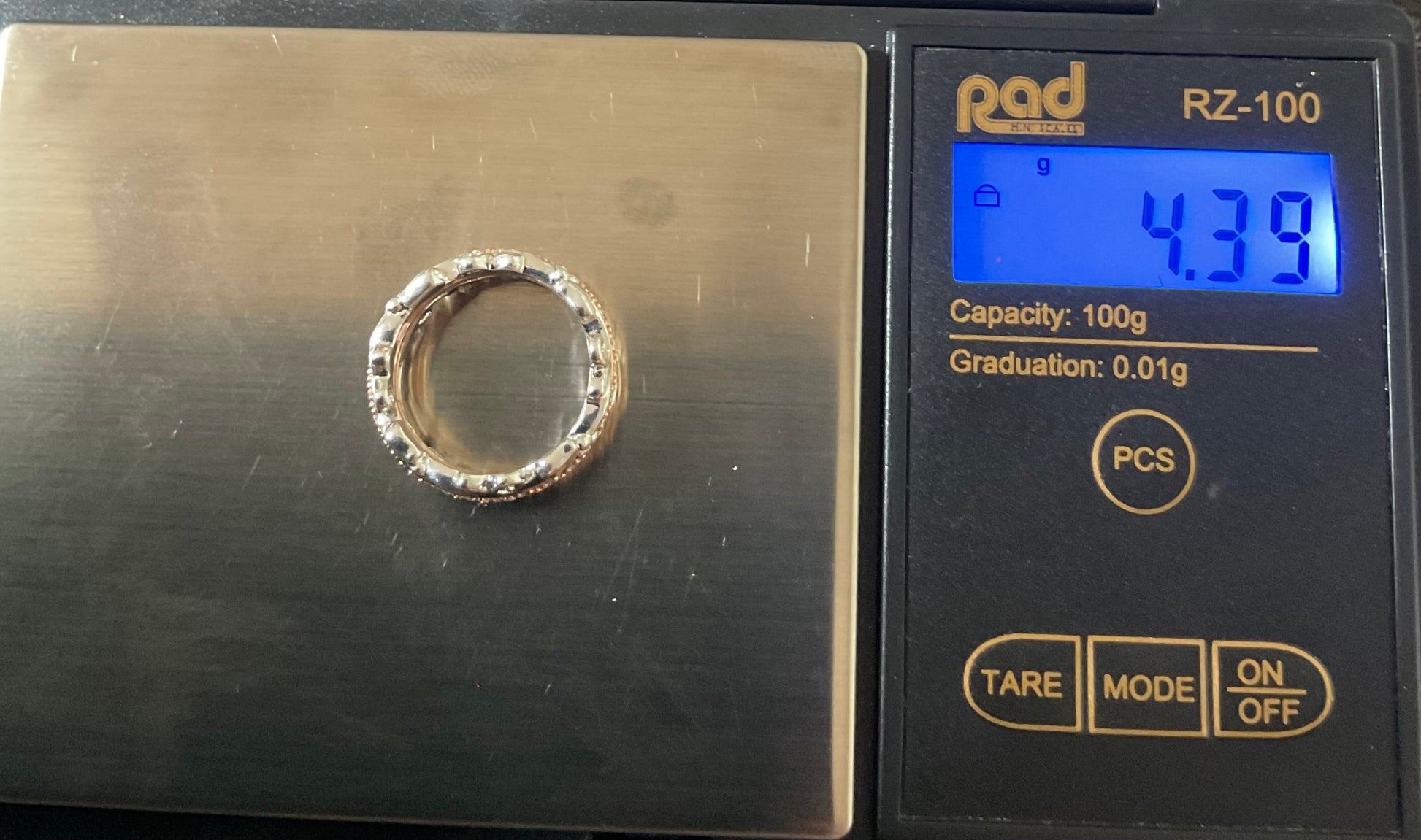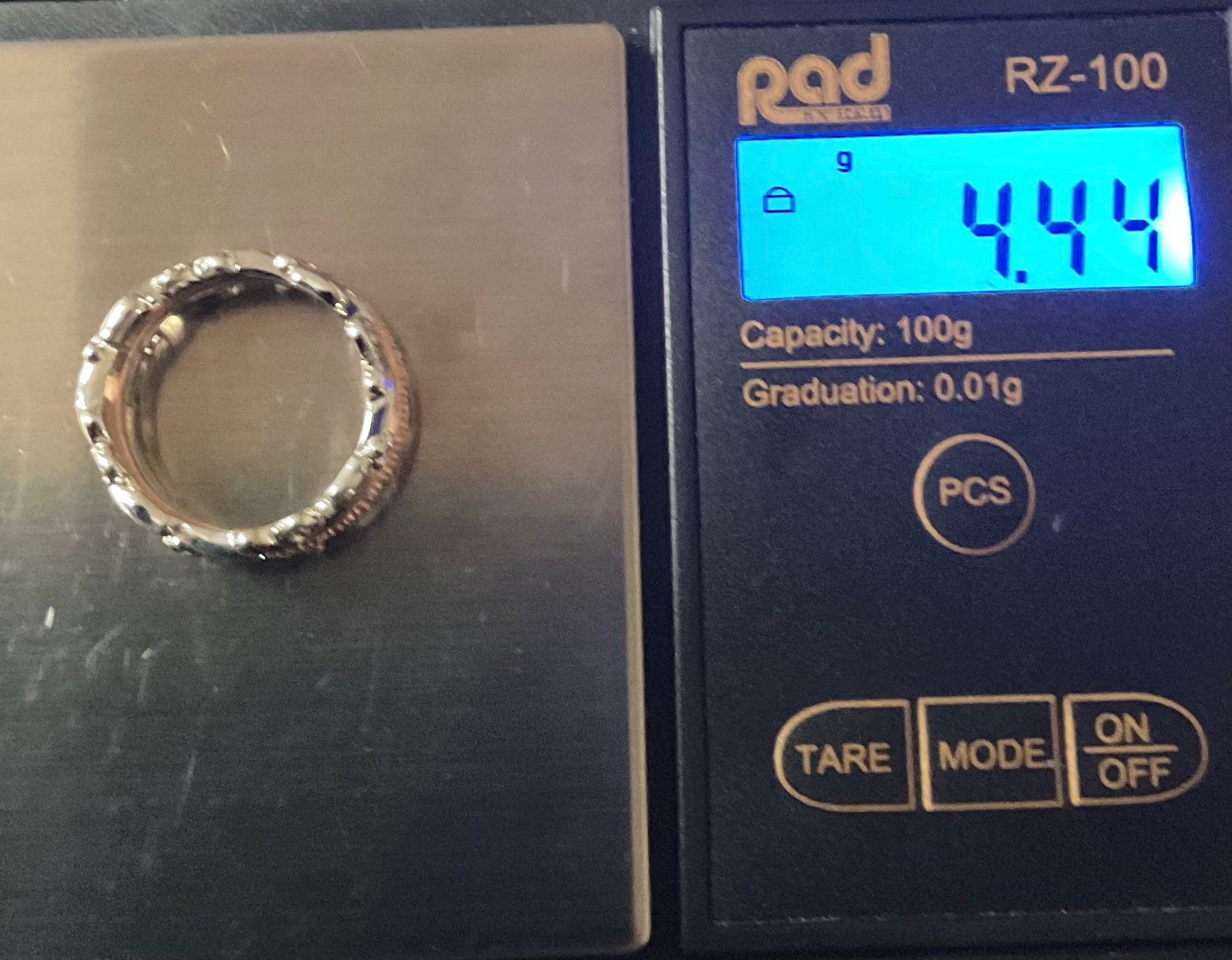 This stunning ring has only been taken out of its box for these photos, so it’s in excellent condition. There are 2 outer silver Tree of Life bands with a middle textured rose gold band that has 12 sparkling little brilliant-cut diamonds dotted around the front. The middle of the ring sits over a size M on the ring sizer and the ring is about 8mm wide. It weighs 4.44g. It is stamped Clogau with the silver hallmark on the inner band. It will come in a white Clogau box with Clogau cleaning cloth. It’s a gorgeous ring with a recommended retail price of £500, so this is a great price!