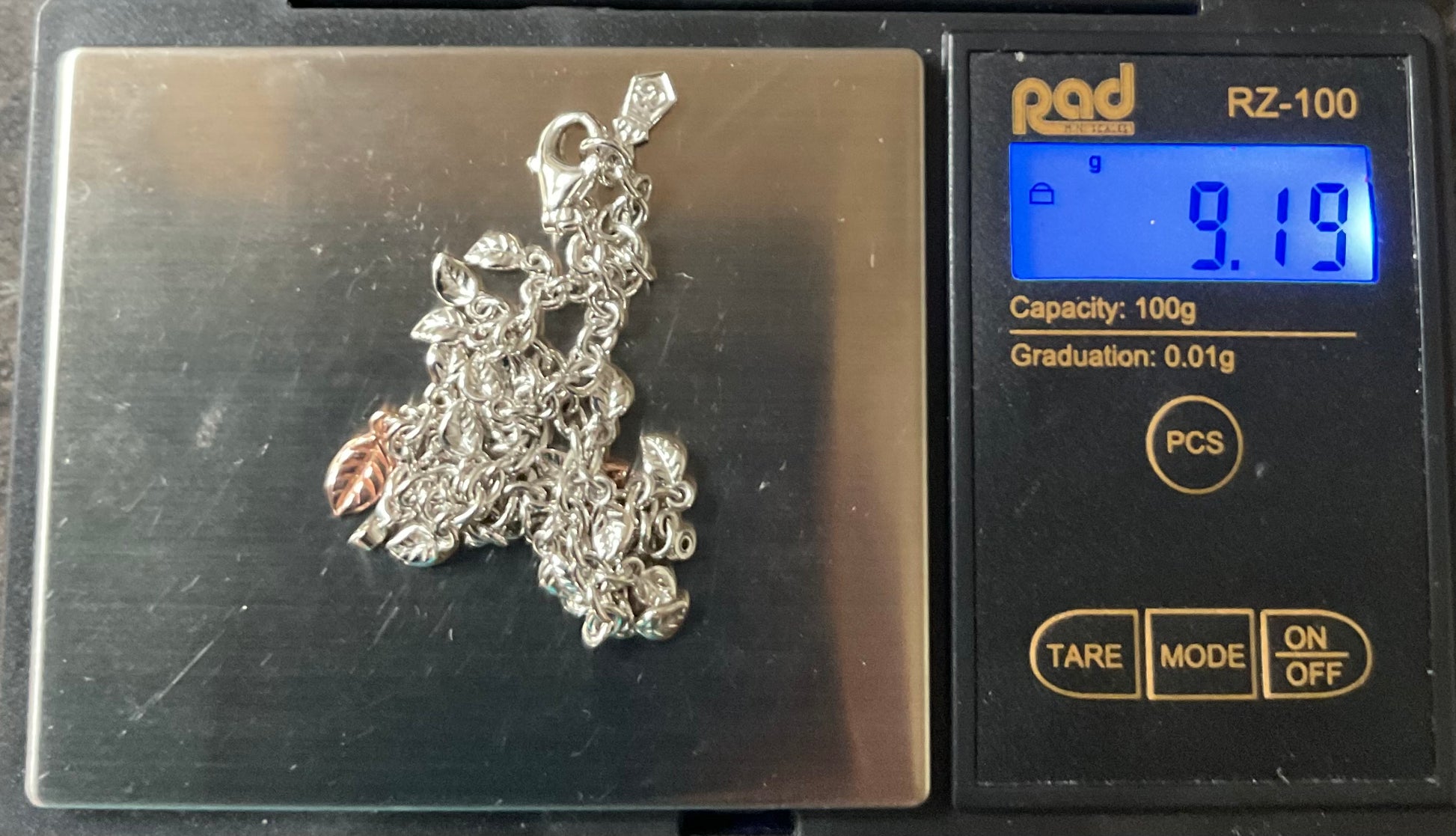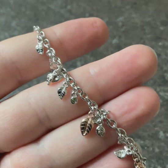 This stunning Clogau Awelon bracelet measures 18.5cm in length and features 3 round cut, bezel set, 2mm Peridot stones, dotted between a chain of 925 sterling silver leaves and a large and small rose gold leaf. It’s in excellent preowned condition, it doesn’t look like it’s been worn and comes in the box shown. I also have for the sale the matching earrings and ring.