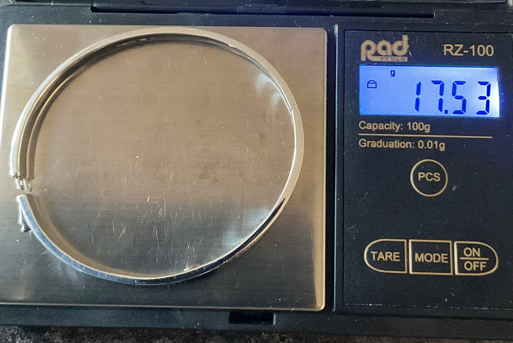 This lovely Clogau bangle isn’t seen for sale very often. All the way around the 925 sterling silver bangle is engraved the repeating words, in script writing -Cariad Am Byth, meaning ‘love forever’. On the inside band there is a little rose gold heart, the Clogau stamps and the silver hallmark. The bangle has a hinge mechanism meaning you don’t have to worry about having to pass it over your hand. You push down on the little rocking lever to open the bracelet and then you push down on it again as you push the bracelet in to a closed position. Releasing the lever locks the clasps. DO NOT force the clasp together without pressing down the little lever first, it doesn’t work that way. The inner measurements are 6.1cm diameter left to right, 5.1cm top to bottom and the band is 5mm wide. It’s in good preowned condition but it does have small signs of wear. The clasp works well. It will come in a Clogau bracelet box.