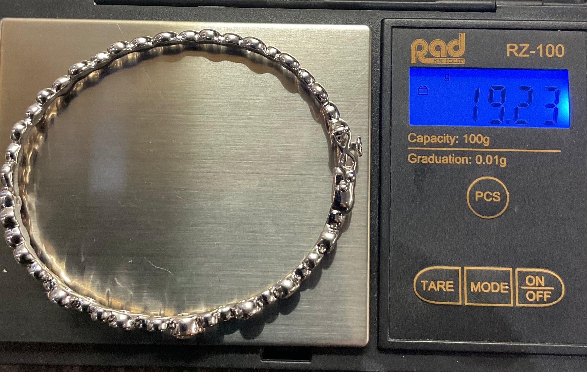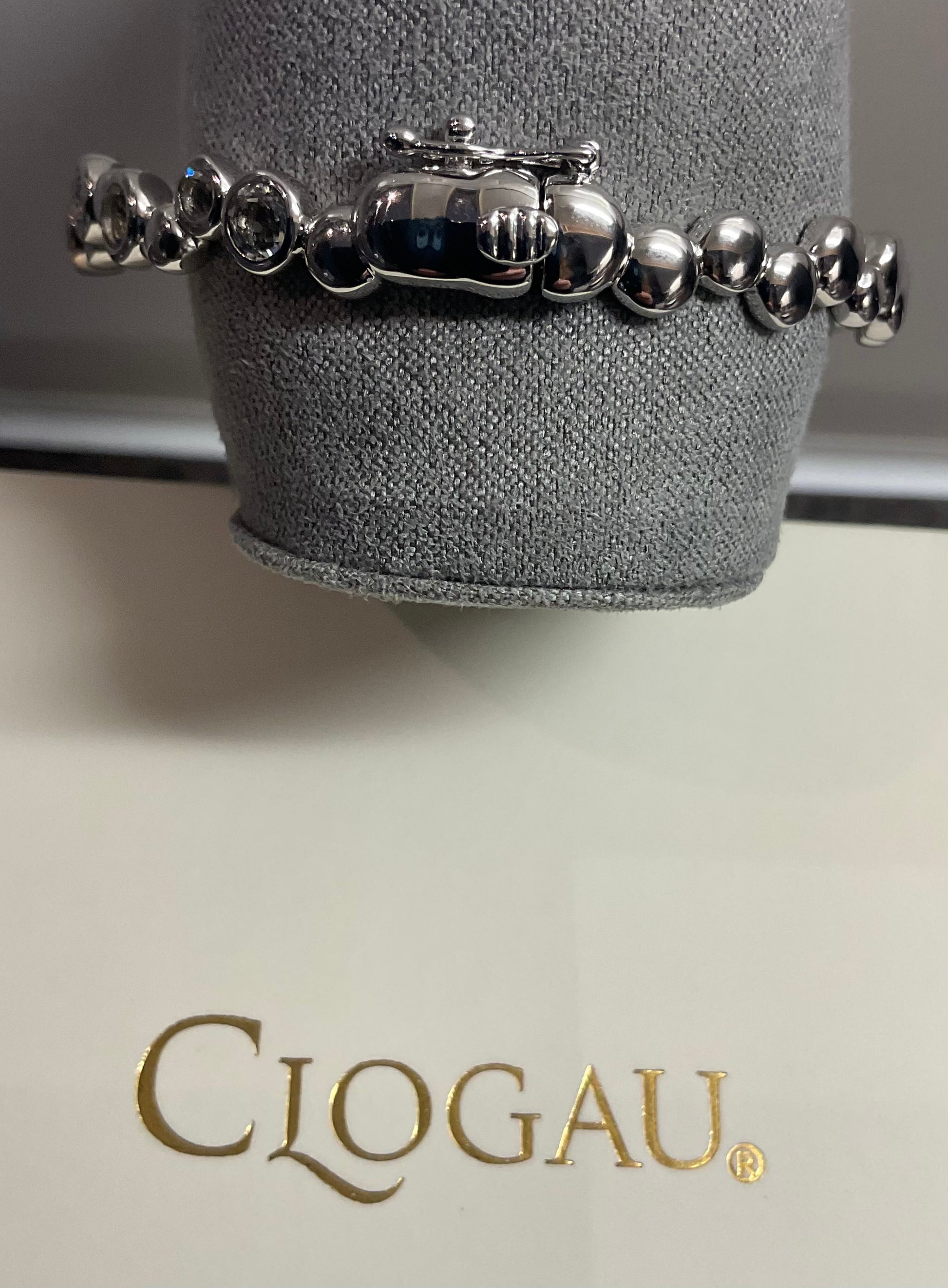 This stunning Clogau Celebration bangle is perfect for the party season, as it sparkles so beautifully! The front of the bangle is adorned with bubbles of round cut, bezel set white topaz stones set into 925 sterling silver. The largest 6mm across bubble at the front is wrapped in a band of rose gold. The back of the bangle is made up of solid silver bubbles. This bracelet is hinged, allowing you to put it on without having to squeeze it over a hand. The internal measurements are 6.2cm diameter from left to right and 5.4cm from top to bottom. The inner band has the Clogau stamps and hallmarks on. This bangle is in new condition and has only been taken out of the box for these photos. It comes in a white Clogau box with Clogau cleaning cloth. I have the celebration drop earrings and ring in my other items.