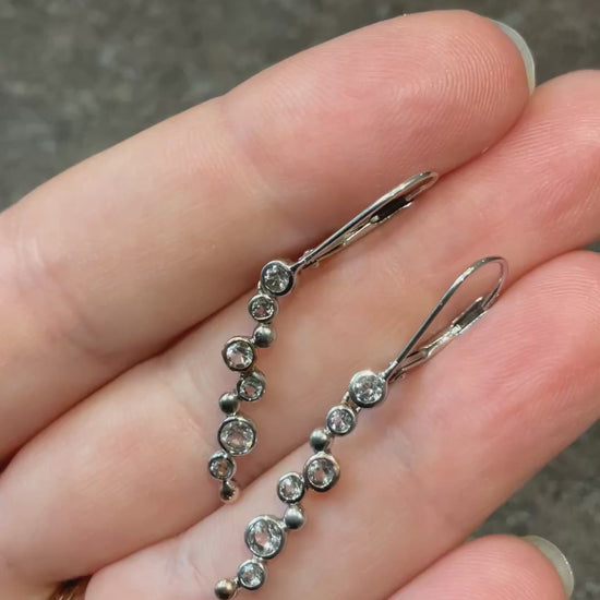 These beautiful Clogau Celebration lever back drop earrings are perfect for the upcoming party season! They measure 4cm in length from the top of the hook and feature 6 varying sized, bezel set, sparkling, round white topaz stones, interspersed with 925 sterling silver and rose gold balls, just like a string of celebratory bubbles! The top bubble of the earring has the Clogau stamps on and the hallmark is on the side of the clasp. They are in great preowned condition with small signs of wear on very close inspection. They will come in Clogau packaging.