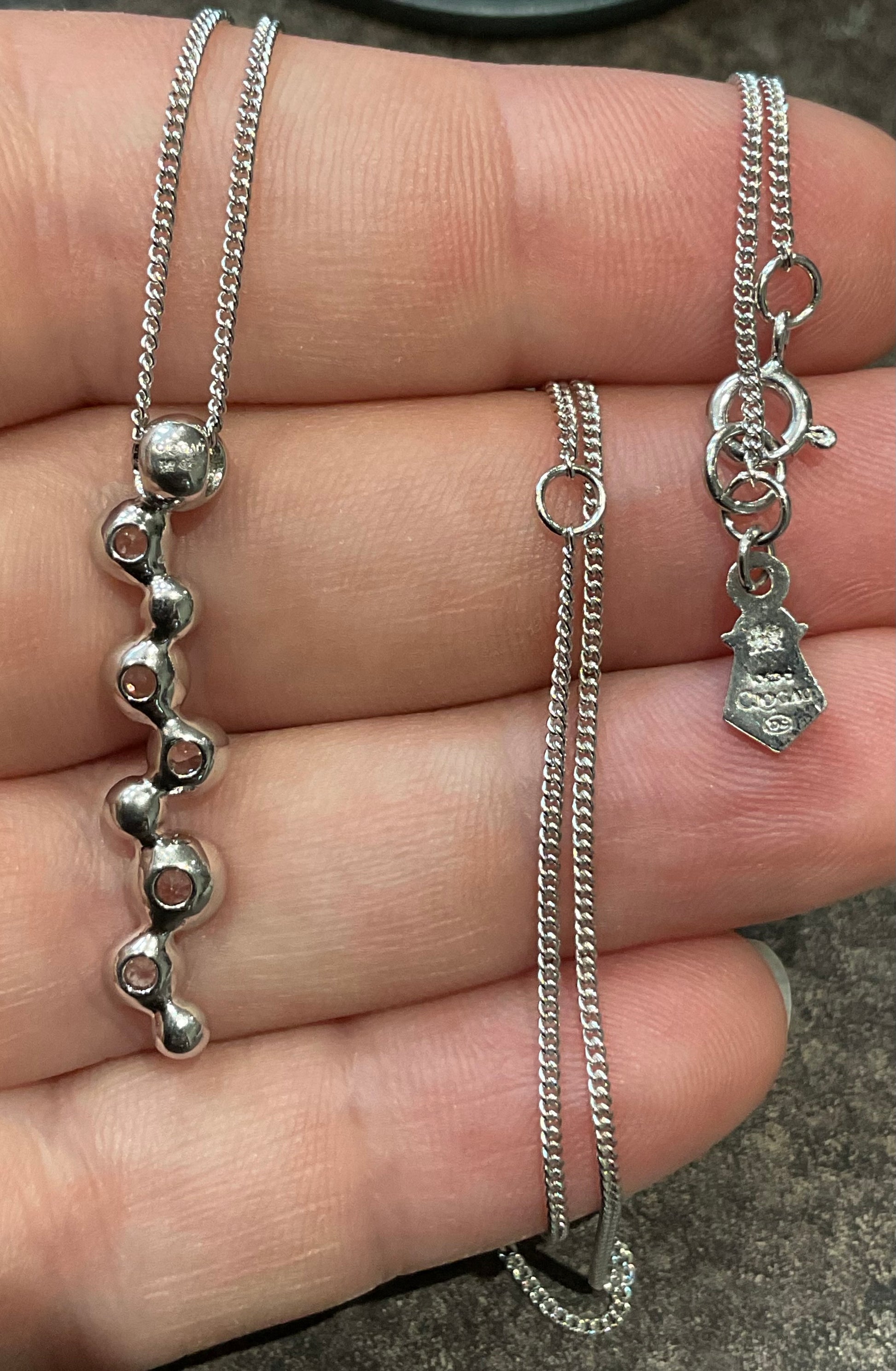 This beautiful Clogau Celebration necklace is perfect for the upcoming party season! It features a 3.2cm pendant with 6 varying sized, bezel set, sparkling, round white topaz stones, interspersed with 925 sterling silver and rose gold balls, just like a string of celebratory bubbles! The top bubble of the pendant has the Clogau stamps on, as does the Clogau tag near the clasp. The Clogau silver chain can be worn at 18, 20 or 22”. This necklace is in great preowned condition with small signs of wear on very close inspection. It will come in a white Clogau necklace box. I am selling the matching earrings and am happy to combine postage, just drop me a message.