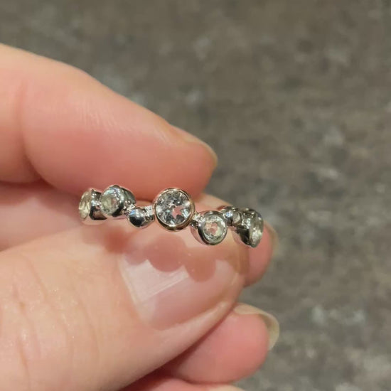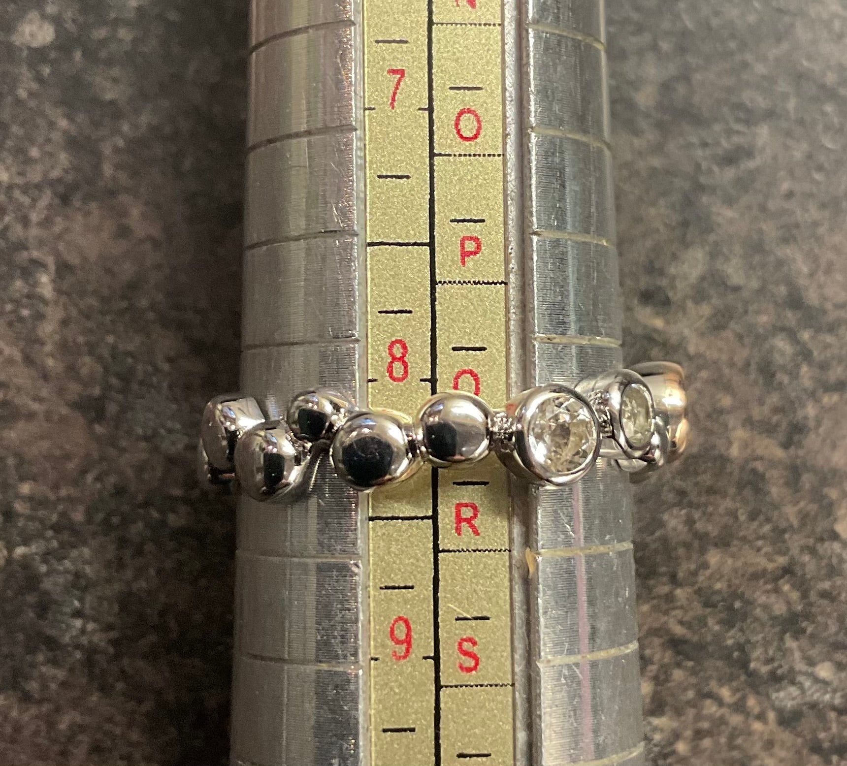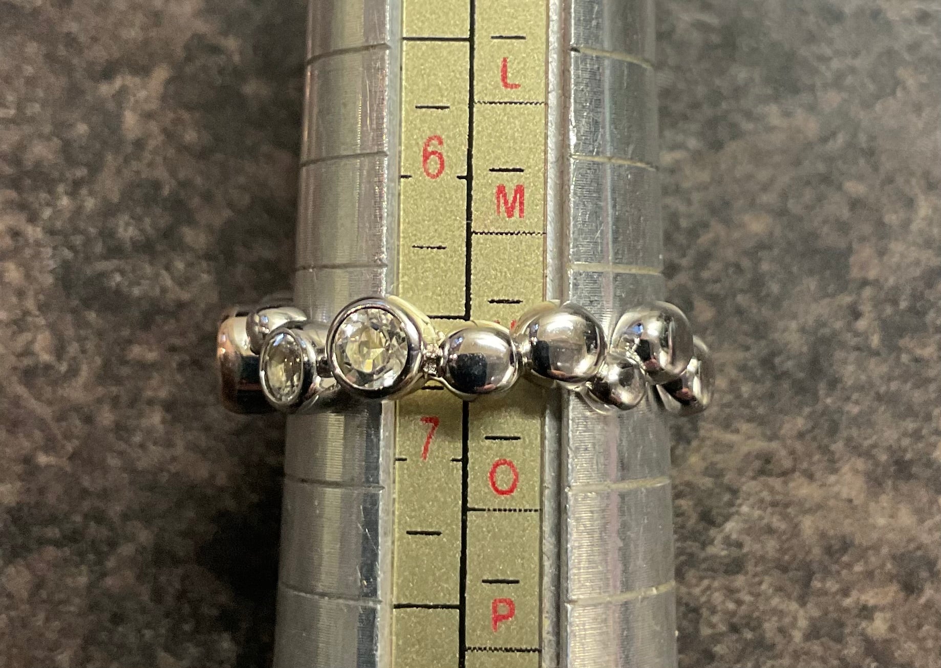 This is a stunning Clogau ring and a perfect addition to any party outfit, particularly the coming Christmas and New Year celebrations, as it sparkles so beautifully! It features a string of scattered round cut, bezel set white topaz stones, the largest of which measures 4mm across and is surrounded by a band of rose gold. The rest of the ring is 925 sterling silver. The topaz stones cover the front of the ring and the rest is made up of solid silver bubbles. The inner band has the Clogau stamps and hallmarks. This ring has only been taken out of the box for the photos, so is in new condition. I have this ring in a size N and Q. It will come in a white Clogau box with Clogau cleaning cloth.
