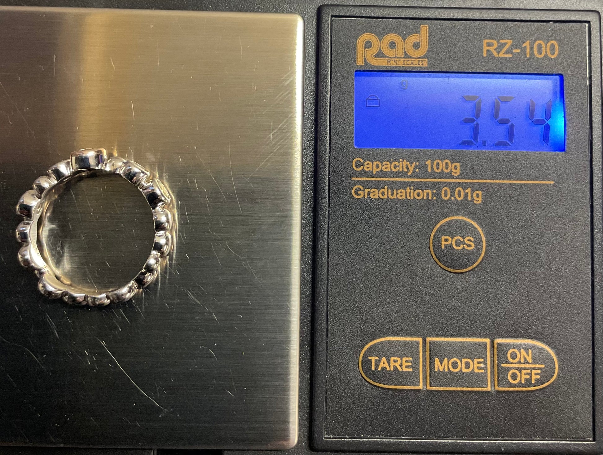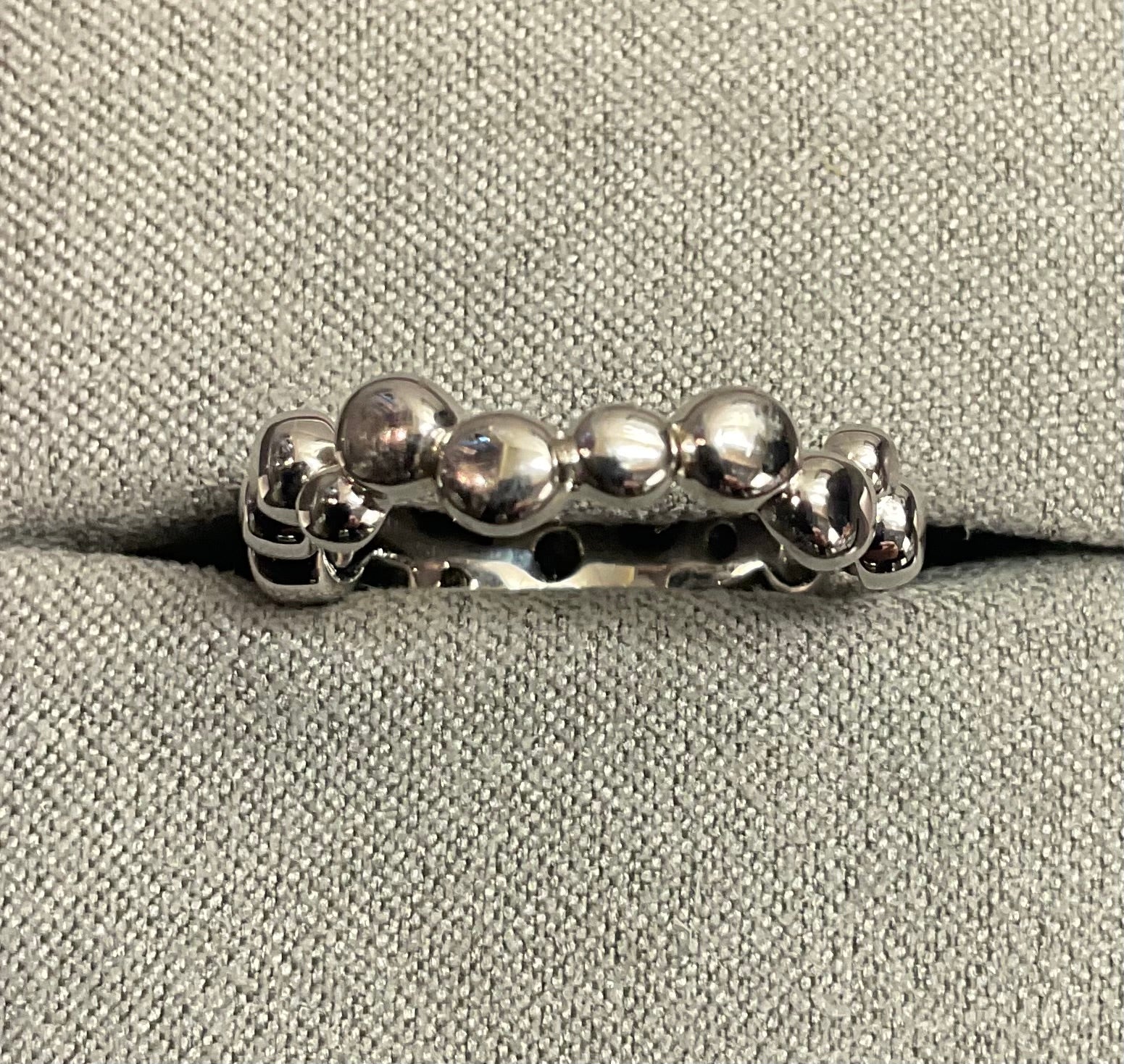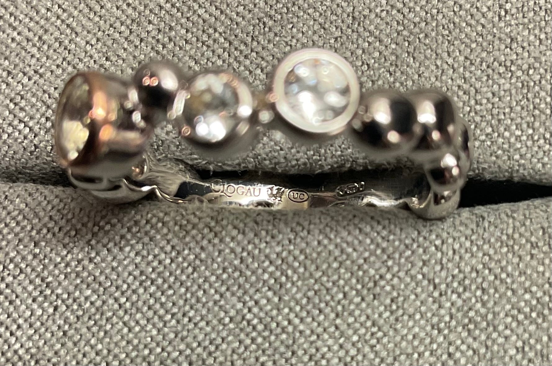 This is a stunning Clogau ring and a perfect addition to any party outfit, particularly the coming Christmas and New Year celebrations, as it sparkles so beautifully! It features a string of scattered round cut, bezel set white topaz stones, the largest of which measures 4mm across and is surrounded by a band of rose gold. The rest of the ring is 925 sterling silver. The topaz stones cover the front of the ring and the rest is made up of solid silver bubbles. The inner band has the Clogau stamps and hallmarks. This ring has only been taken out of the box for the photos, so is in new condition. I have this ring in a size N and Q. It will come in a white Clogau box with Clogau cleaning cloth.