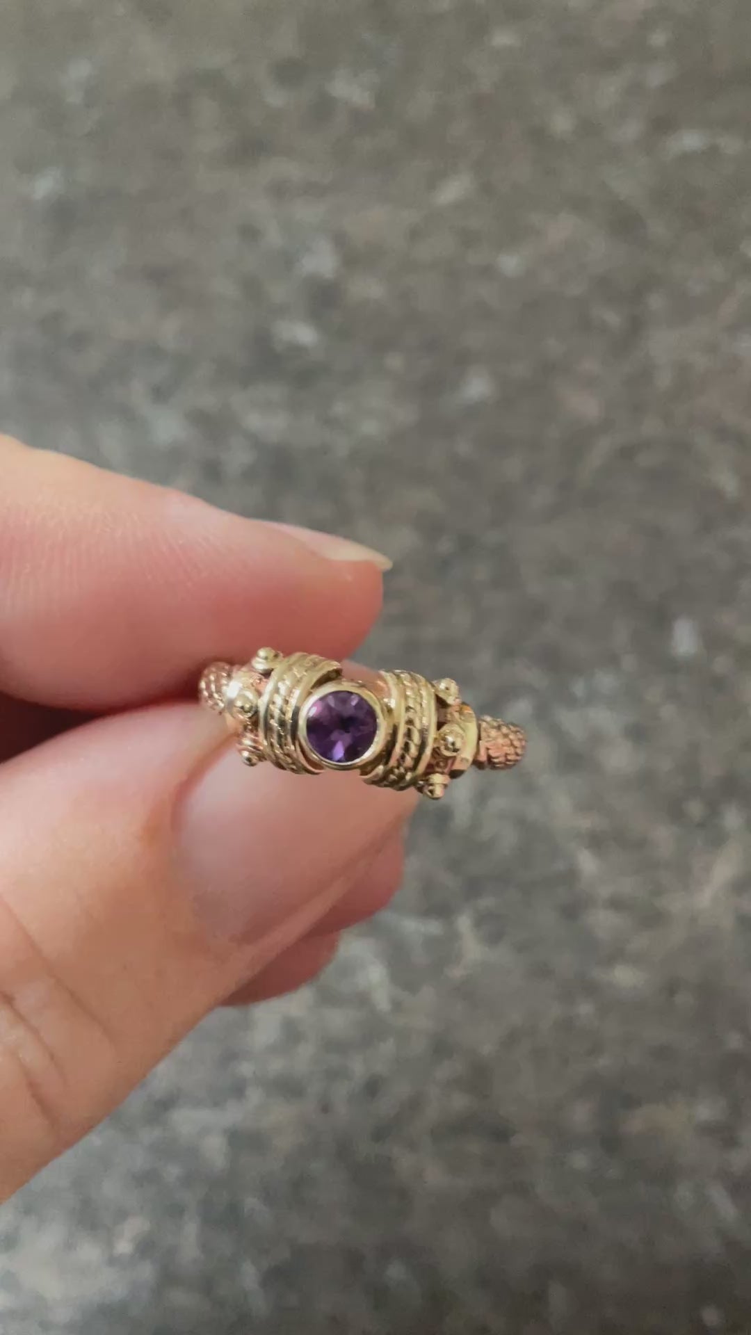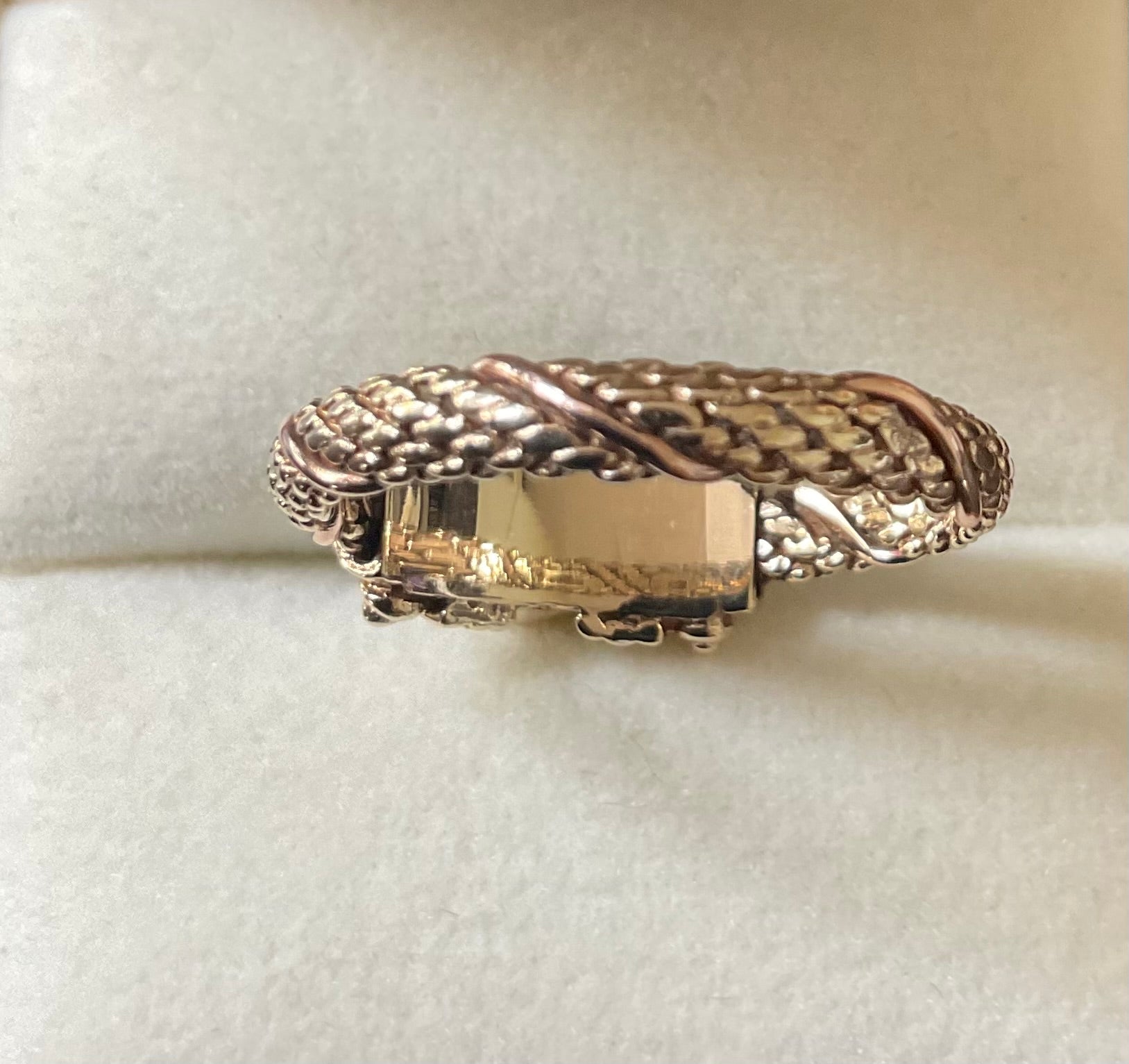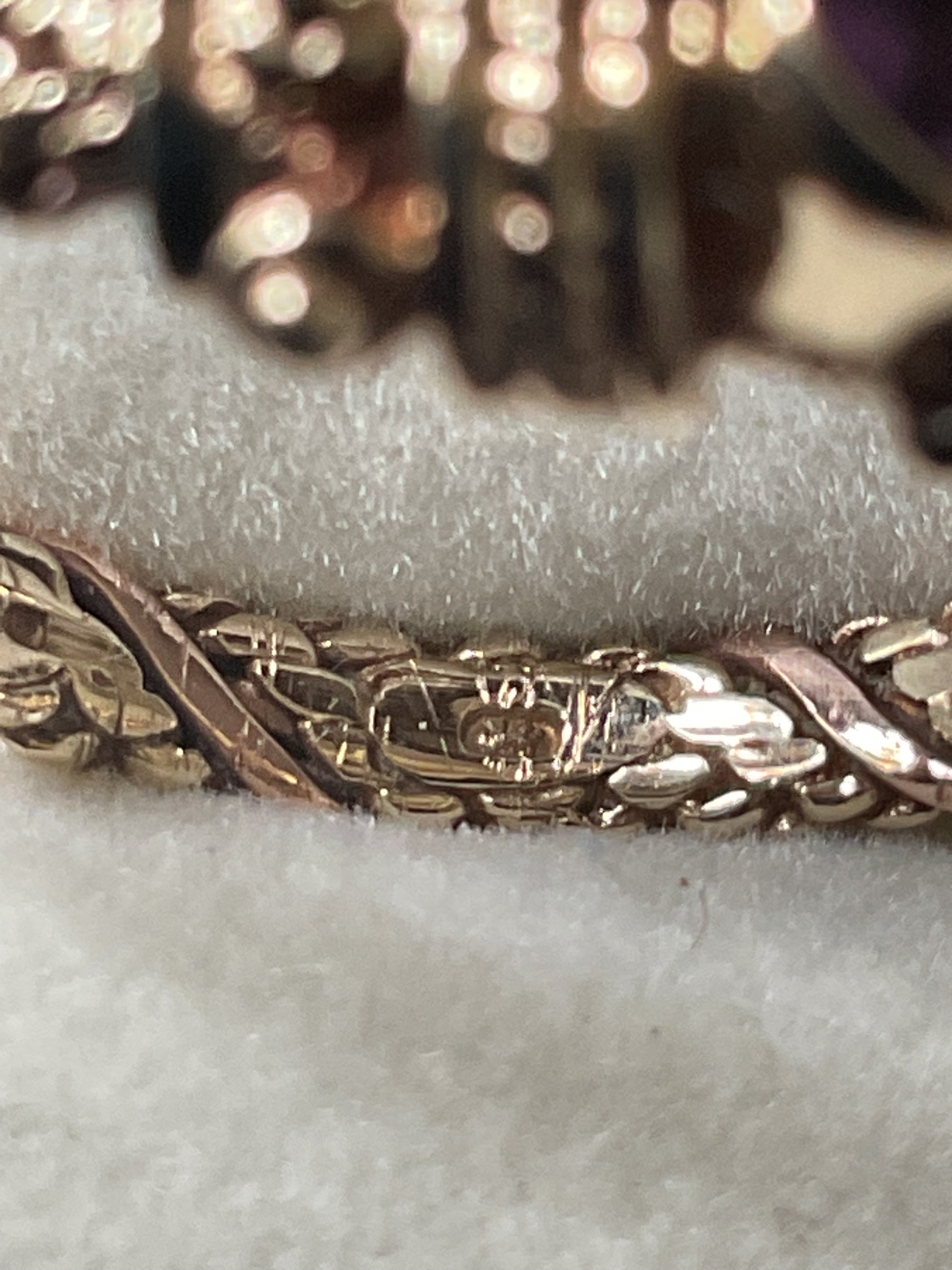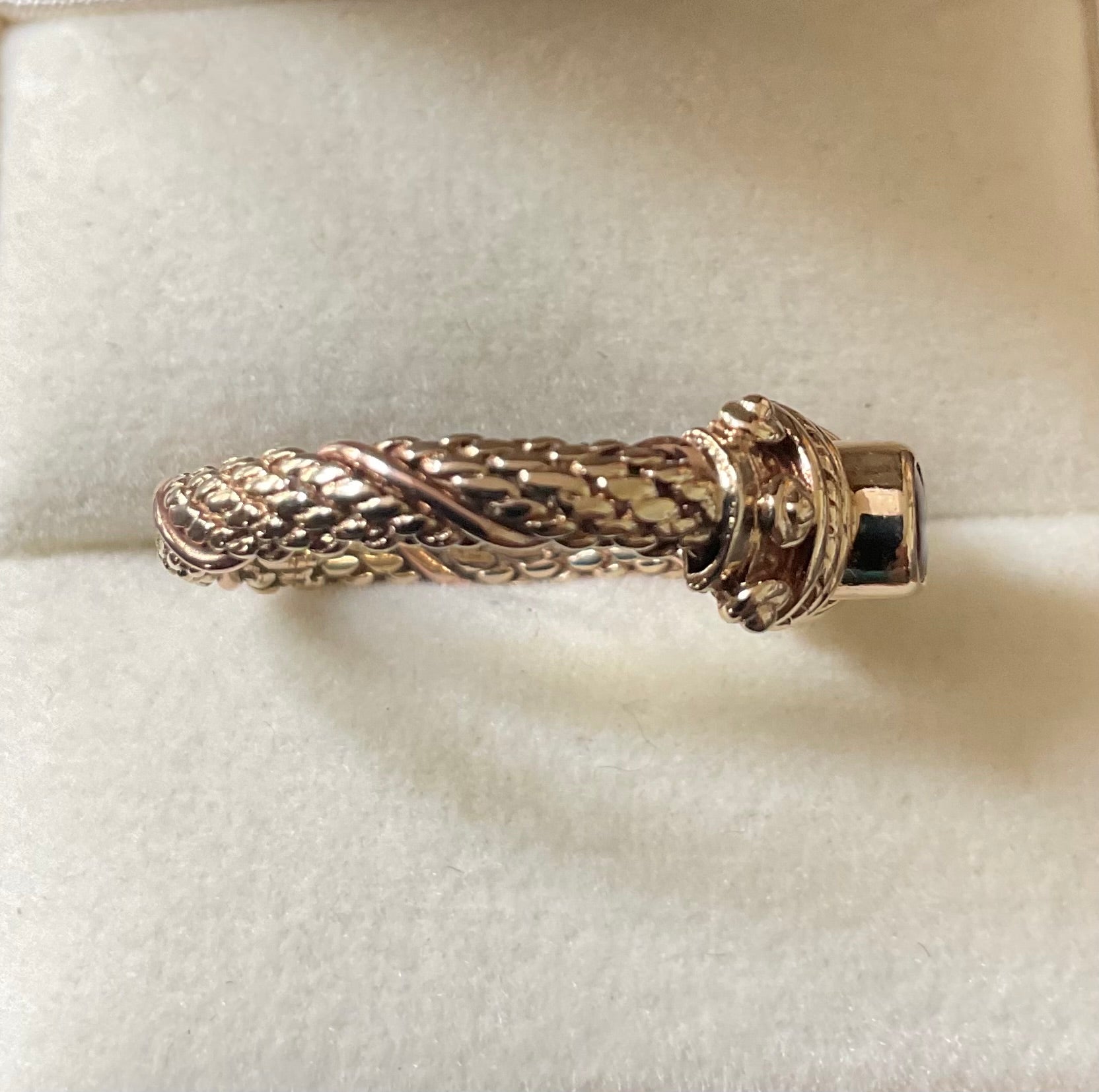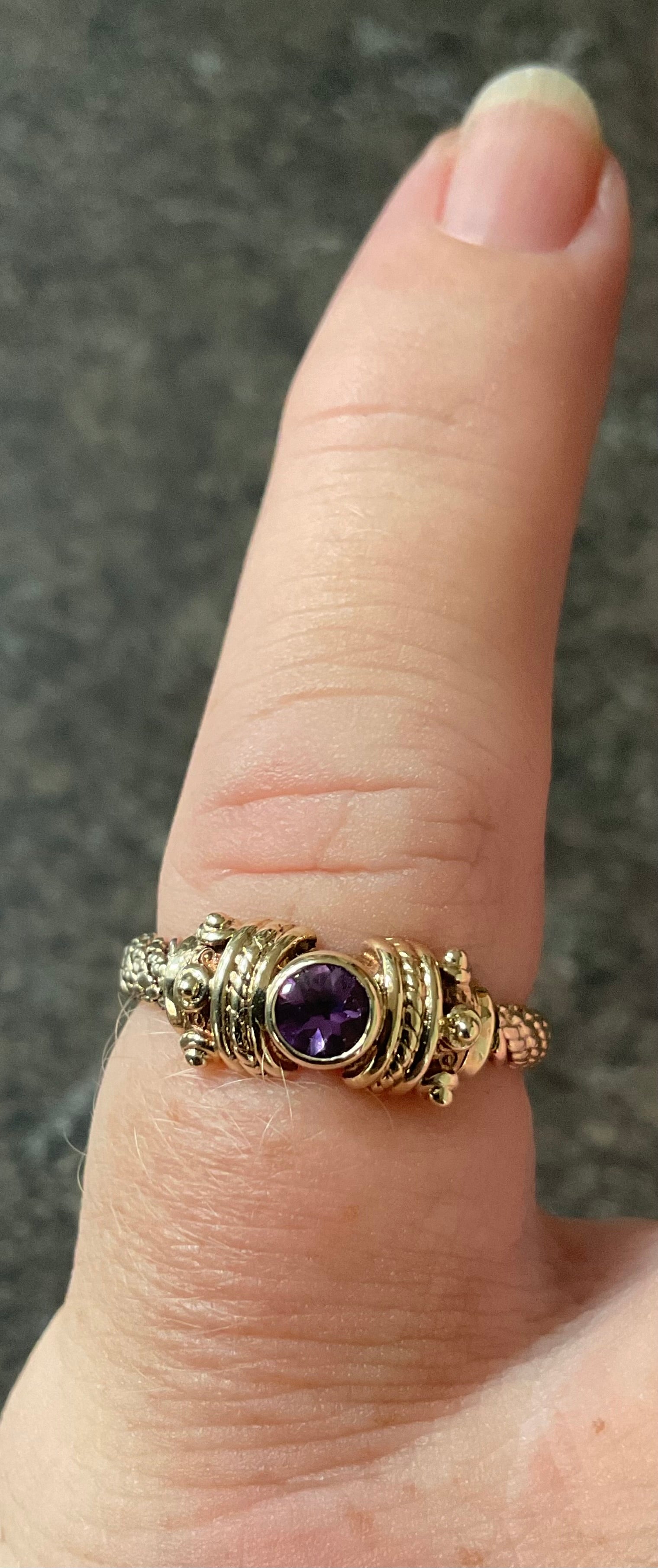 This is a stunning, very rare vintage Clogau ring with a Sheffield hallmark and I think a V date mark, which would be 1995. At the centre of the design is a beautiful purple raised, bezel set 3mm Amethyst cabochon with a 9ct yellow gold Byzantine design either side. The band of the ring has a yellow gold weave design with a band of rose gold wrapped around it. The inner band is stamped with the Welsh Dragon and has the older hallmark with the CD in a Pentagon. There are lines on the inner band that aren’t so visible by eye but you can see them when zoomed in with the camera and with a loupe. I think they must have been created during production, as I really can’t see how you could make those sort of marks inside a ring band. The outer band of the ring that would be exposed to wear is in great vintage condition and whilst this ring is 30years old, there aren’t really any other signs of wear without looking through a loupe. It will come with the box and certificate booklet as shown.