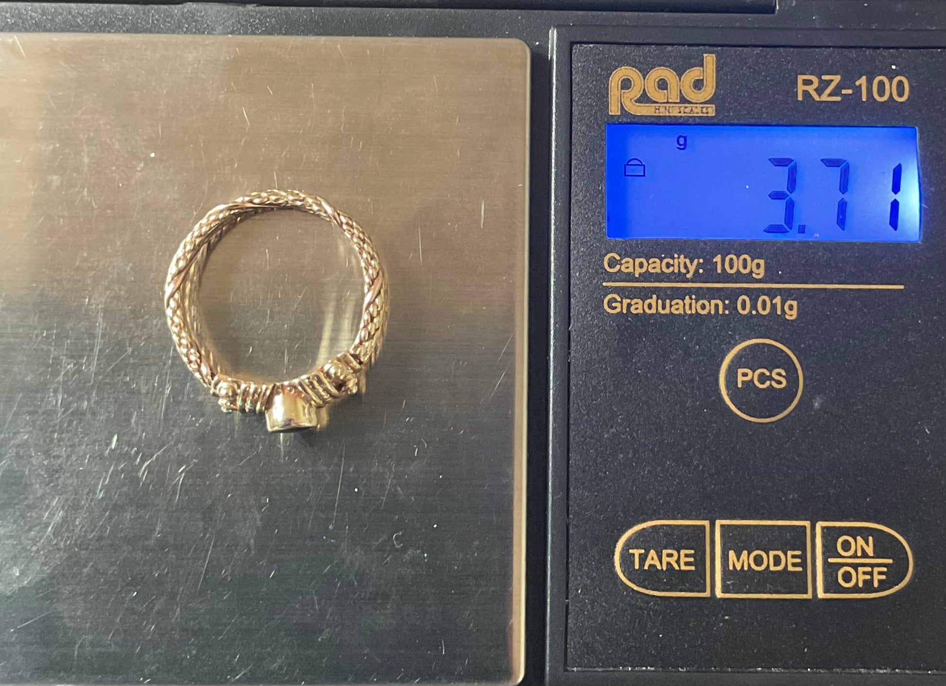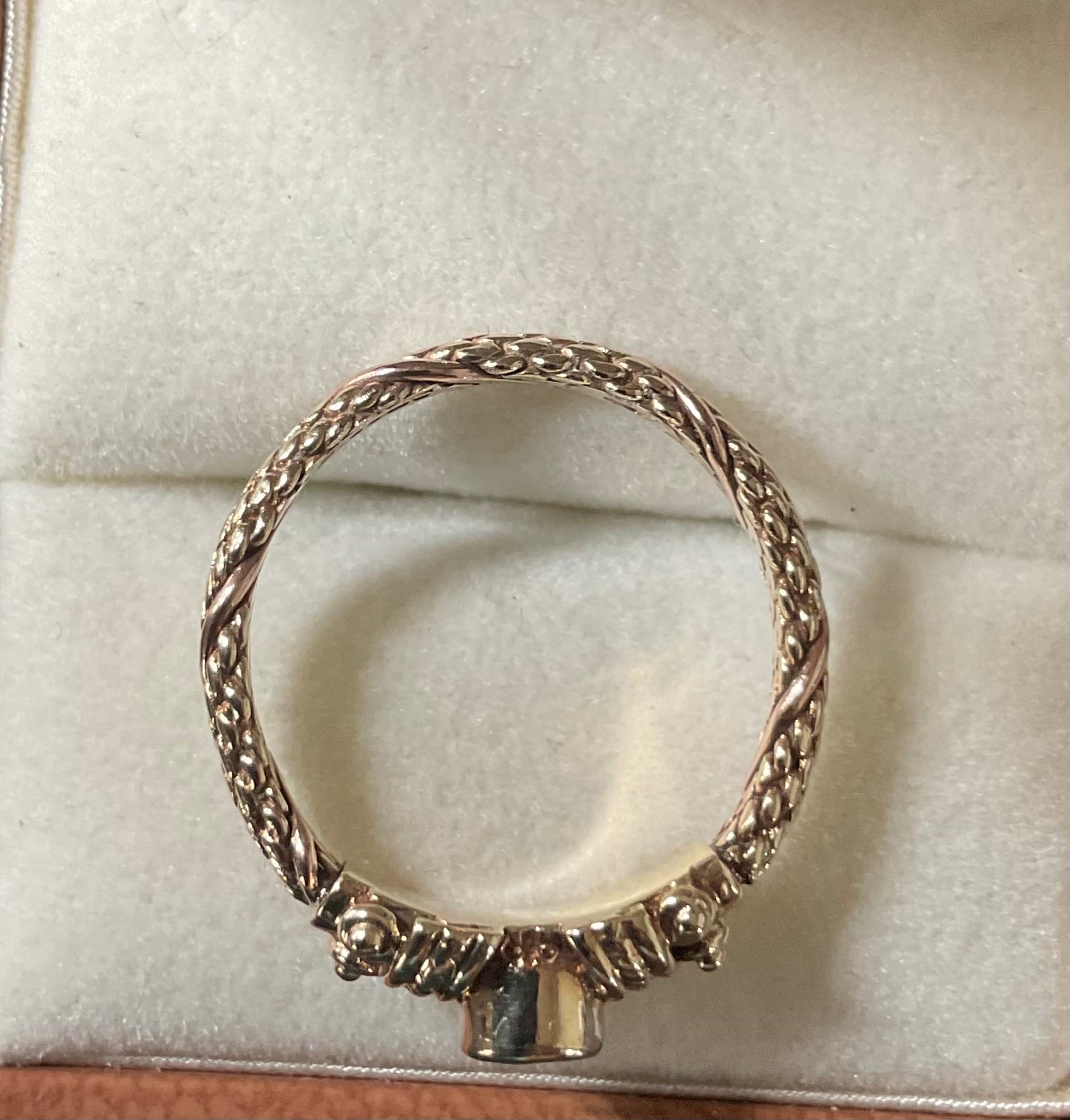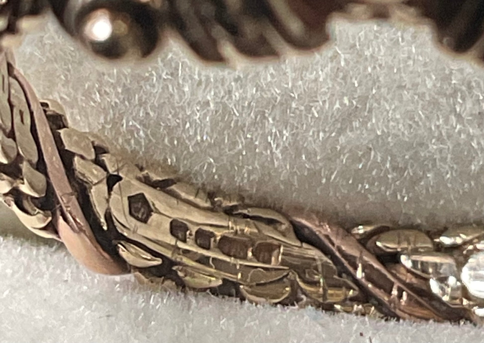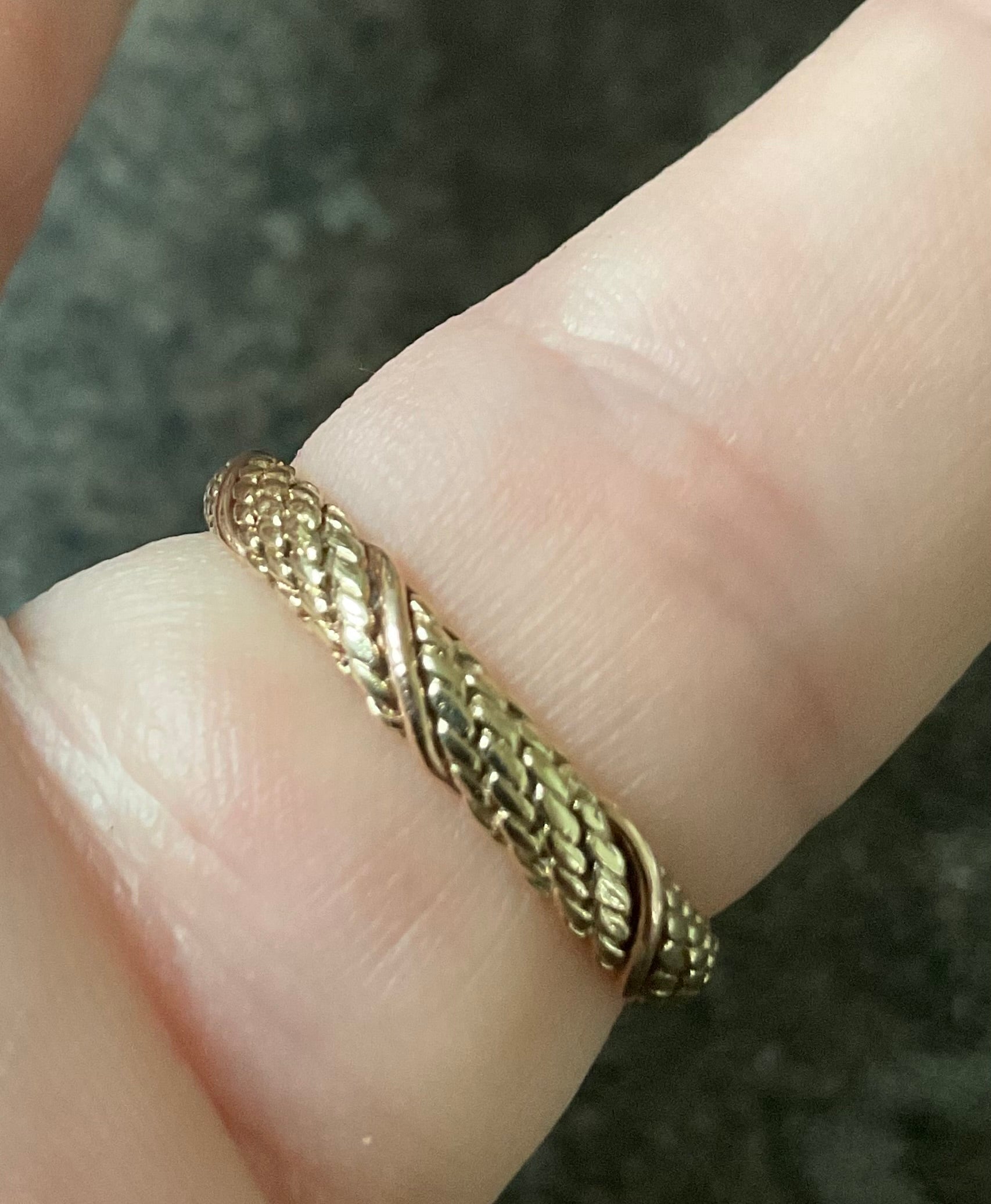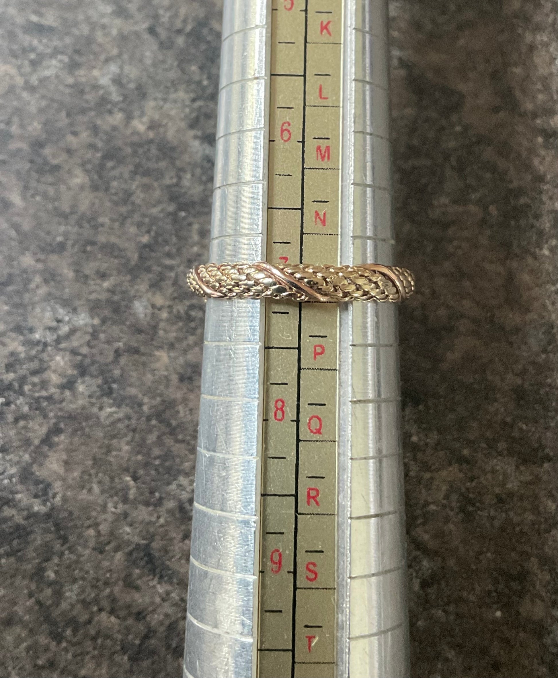 This is a stunning, very rare vintage Clogau ring with a Sheffield hallmark and I think a V date mark, which would be 1995. At the centre of the design is a beautiful purple raised, bezel set 3mm Amethyst cabochon with a 9ct yellow gold Byzantine design either side. The band of the ring has a yellow gold weave design with a band of rose gold wrapped around it. The inner band is stamped with the Welsh Dragon and has the older hallmark with the CD in a Pentagon. There are lines on the inner band that aren’t so visible by eye but you can see them when zoomed in with the camera and with a loupe. I think they must have been created during production, as I really can’t see how you could make those sort of marks inside a ring band. The outer band of the ring that would be exposed to wear is in great vintage condition and whilst this ring is 30years old, there aren’t really any other signs of wear without looking through a loupe. It will come with the box and certificate booklet as shown.