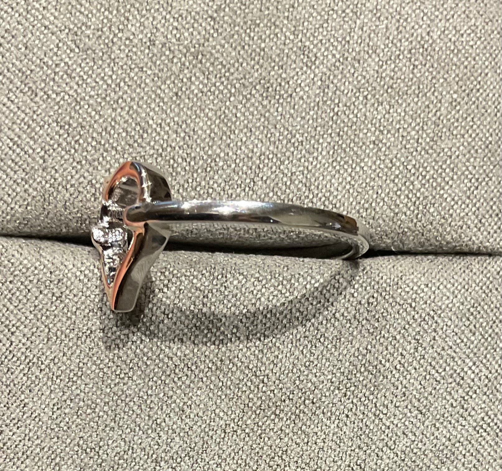 This is a lovely ring, with a simple, elegant design. It features an open sterling silver heart with a rose gold finish to the upper surface. The heart measures 1.1cm across and 1.1cm high. The inner band has the expected Clogau stamps and hallmarks. This ring hasn’t been worn before but does have some light surface scratches that are visible on close inspection (only really through a loupe). This ring comes in a Clogau box with Clogau cleaning cloth.