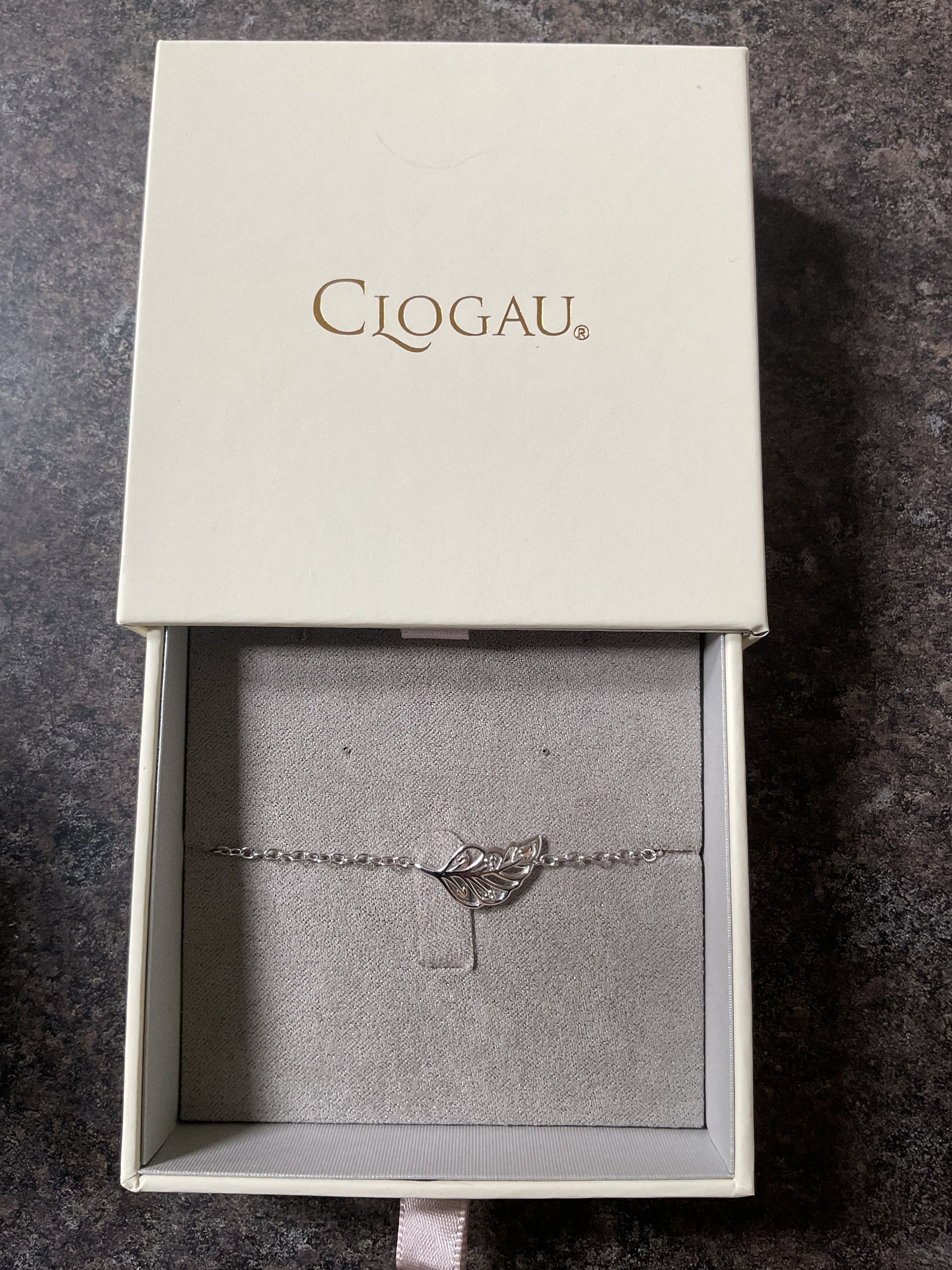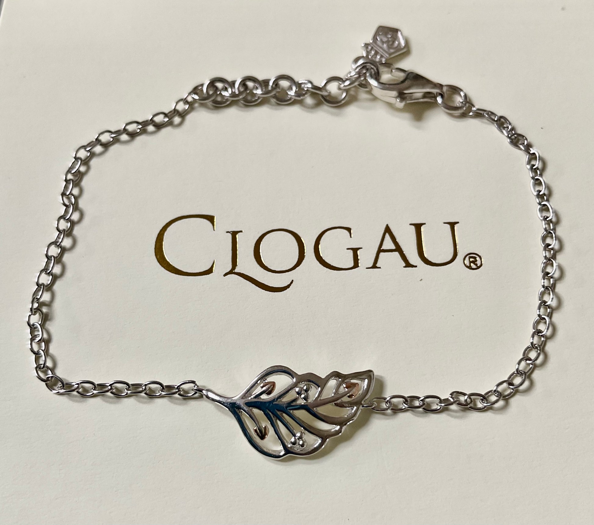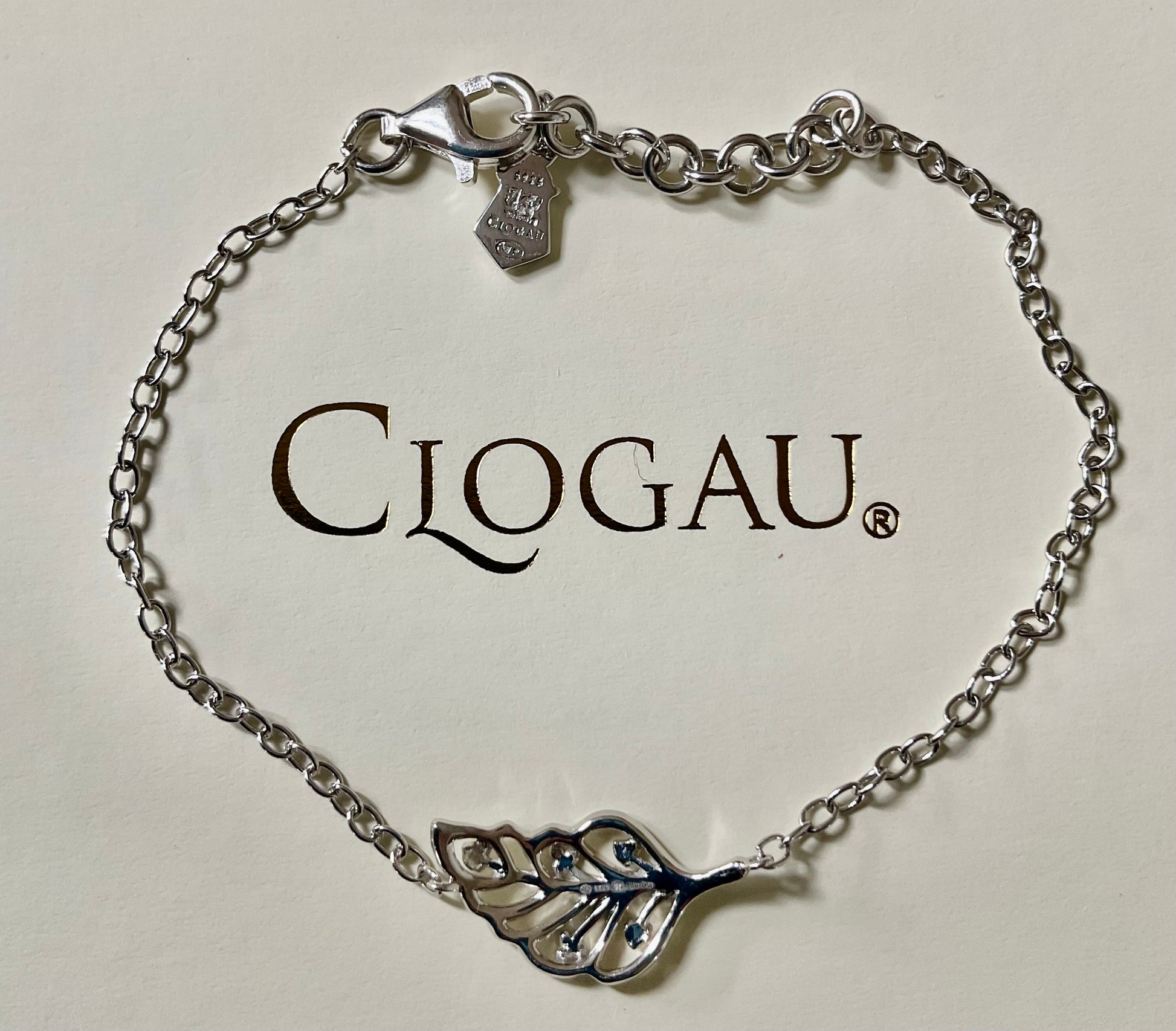 This beautiful Clogau Debutante bracelet has a fine silver chain with larger end links, allowing it to be worn between 16 and 18cm. At the centre is a 2cm by 1cm silver feather with little silver berries and rose gold leaves dotted throughout. The back of the feather has all the Clogau stamps and hallmarks. Its in excellent condition as it hasn’t been worn and comes in the Clogau box shown, with a Clogau cleaning cloth.