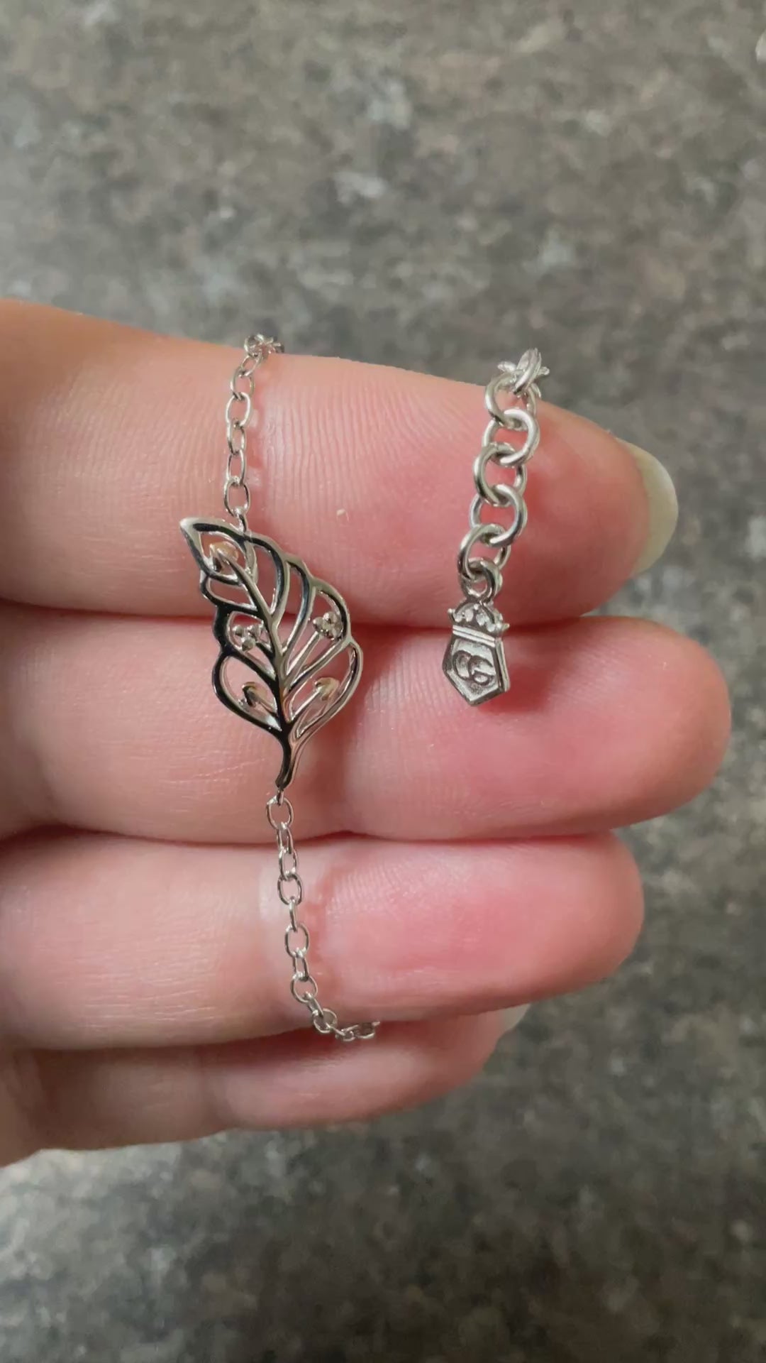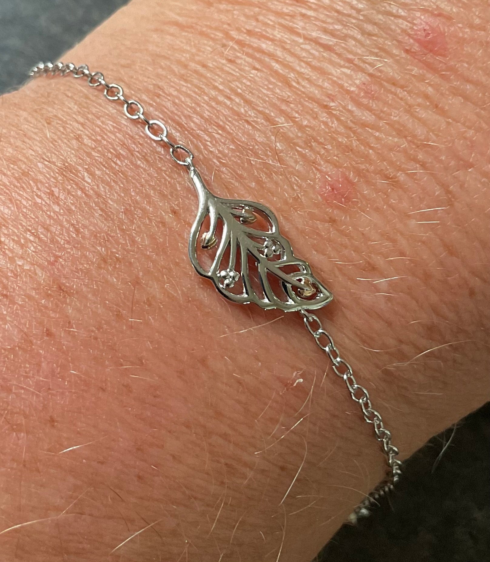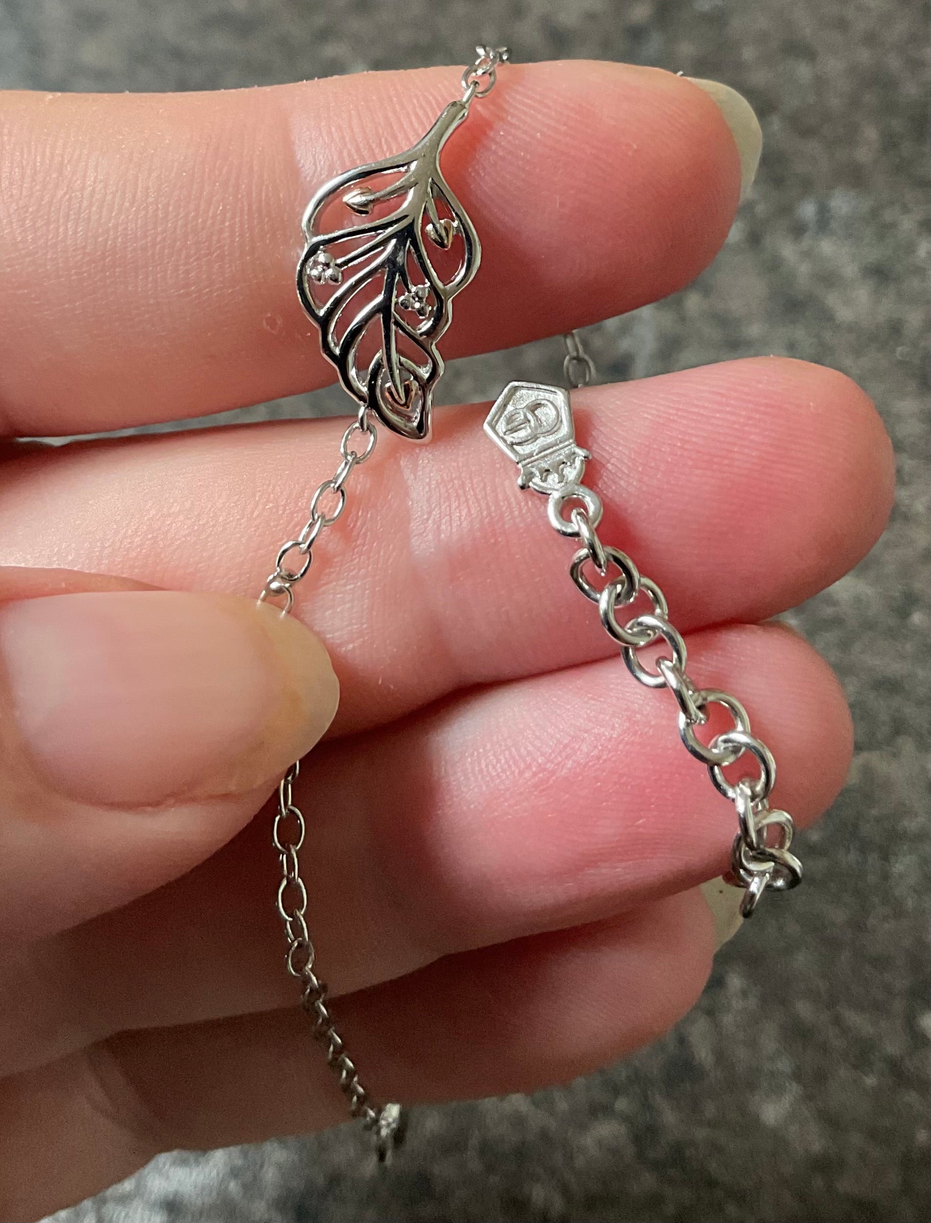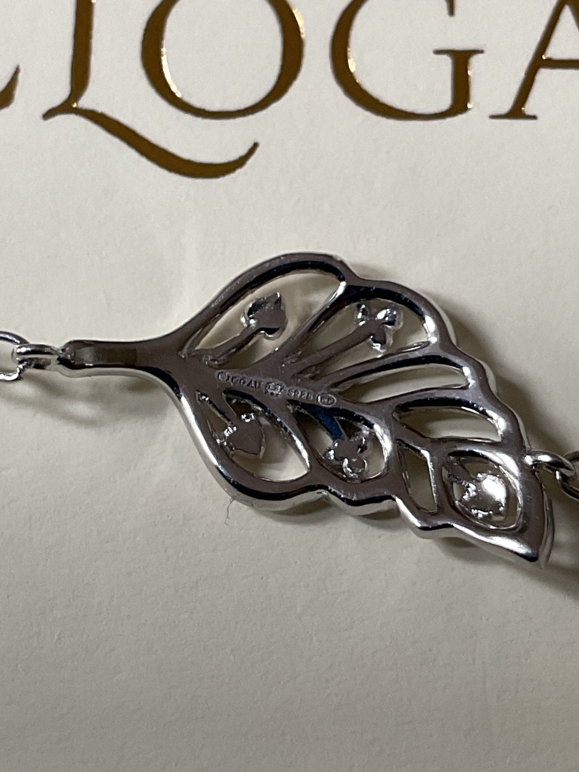 This beautiful Clogau Debutante bracelet has a fine silver chain with larger end links, allowing it to be worn between 16 and 18cm. At the centre is a 2cm by 1cm silver feather with little silver berries and rose gold leaves dotted throughout. The back of the feather has all the Clogau stamps and hallmarks. Its in excellent condition as it hasn’t been worn and comes in the Clogau box shown, with a Clogau cleaning cloth.