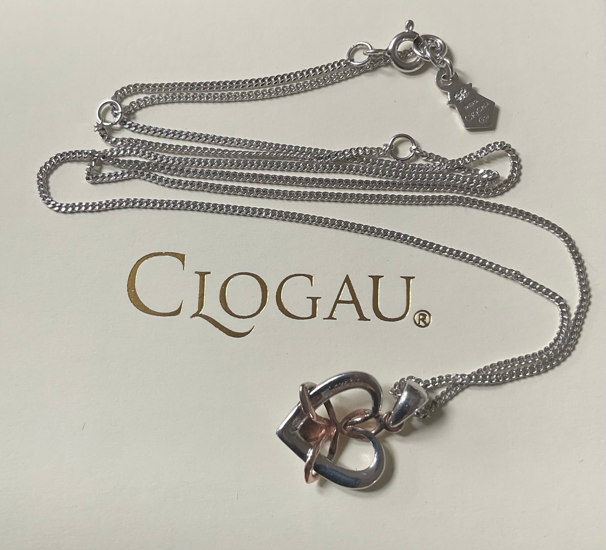 This gorgeous Clogau Dwynwen Forever Yours necklace, features a heart shaped sterling silver pendant, measuring 2cm from the top of the bale and 1.5cm wide. The rose gold detailing represents the everlasting bonds of love and are wrapped around a beautiful pear cut opal, that has lovely colour play in light. The back of the pendant has the Clogau stamps and further stamps and the hallmark can be found on the Clogau tag near the clasp. There is a very pretty, shiny flat Clogau silver chain that can be worn at 18, 20 or 22”. This necklace is preowned but in good condition with small signs of wear on close inspection. It will come in a Clogau box.