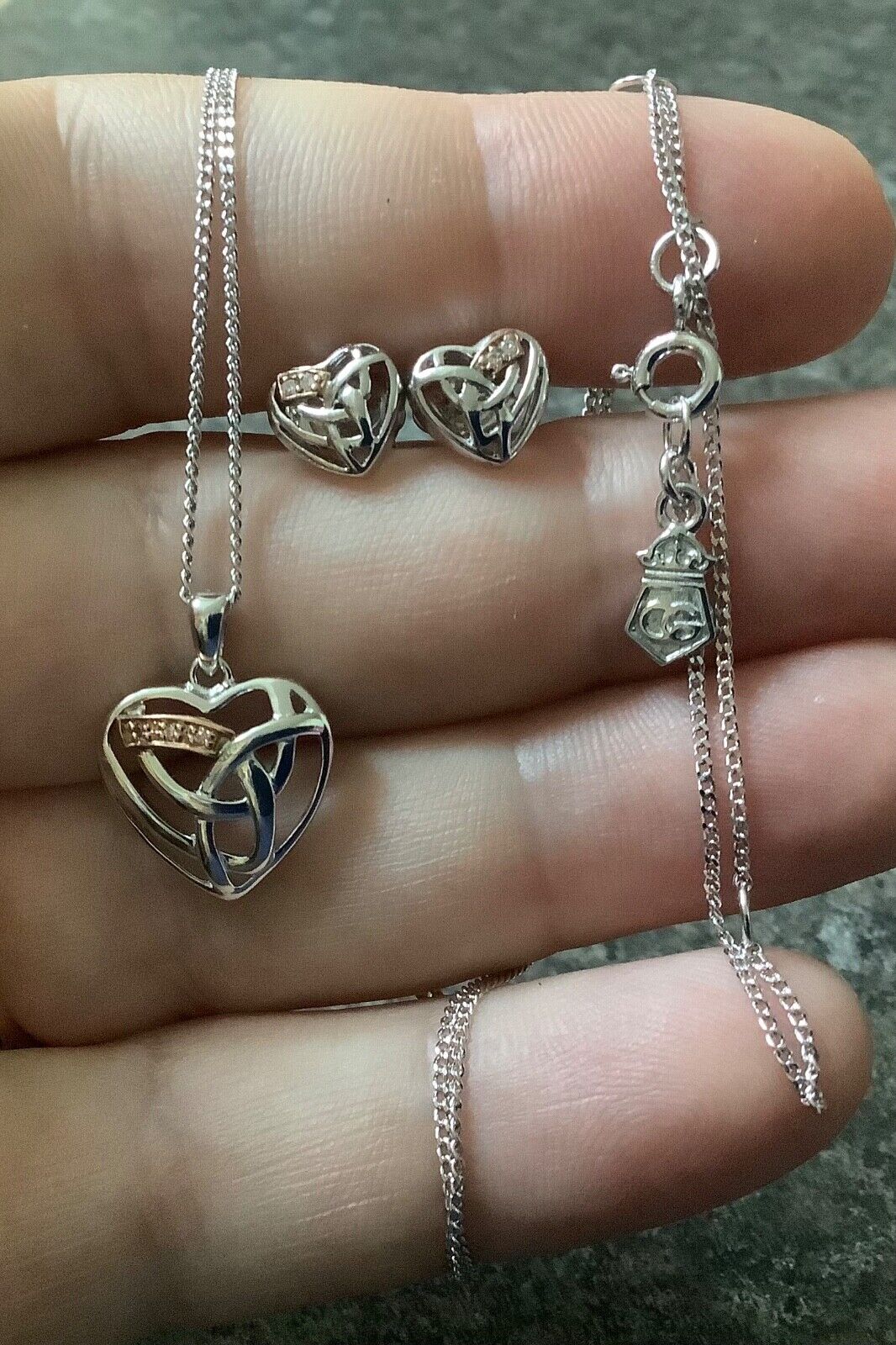 Clogau eternal love diamond heart earrings and necklace set silver and rose gold