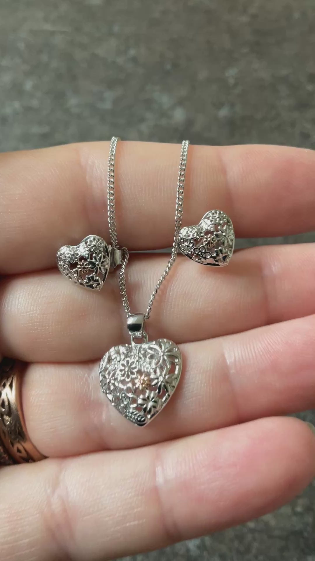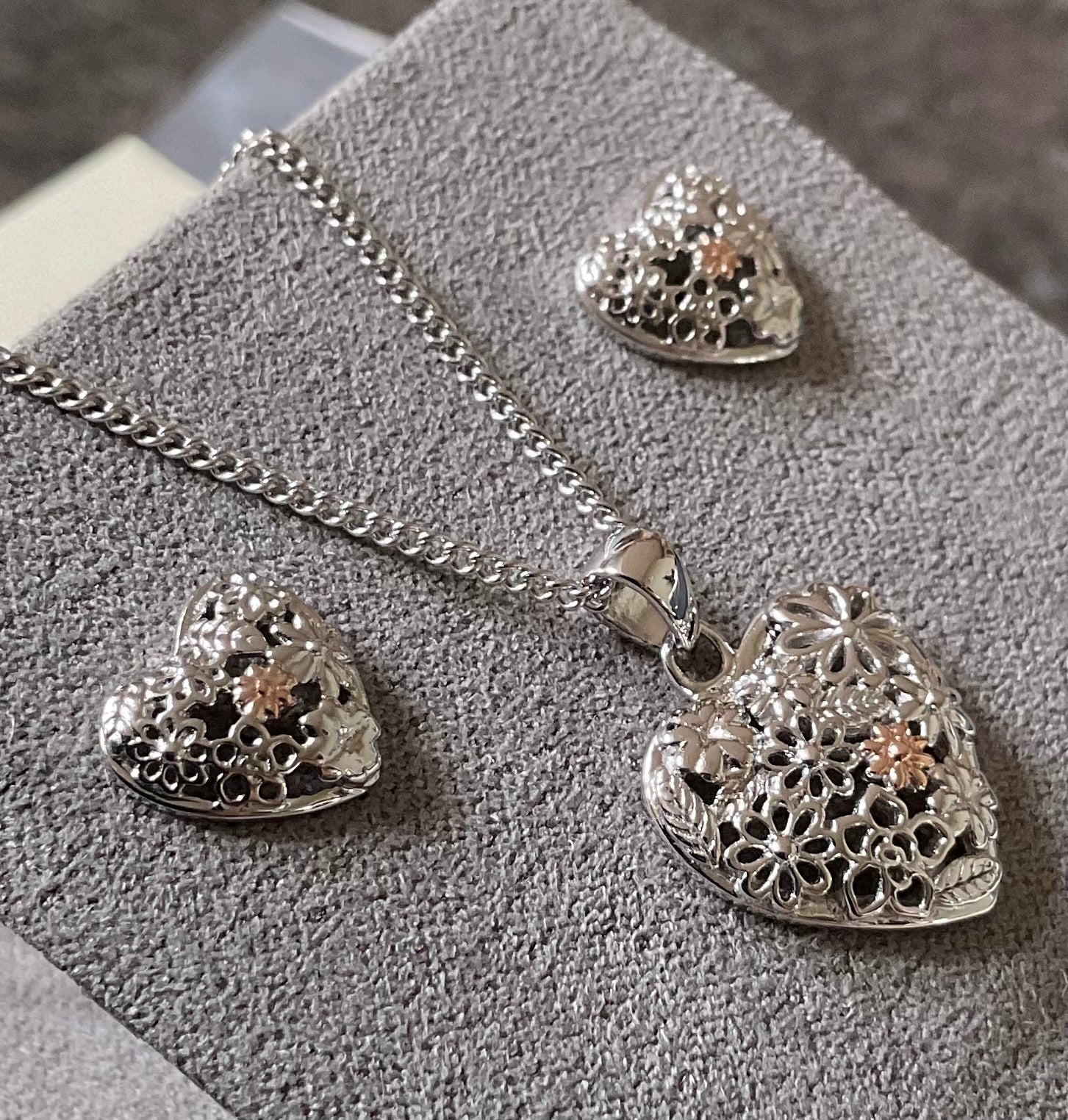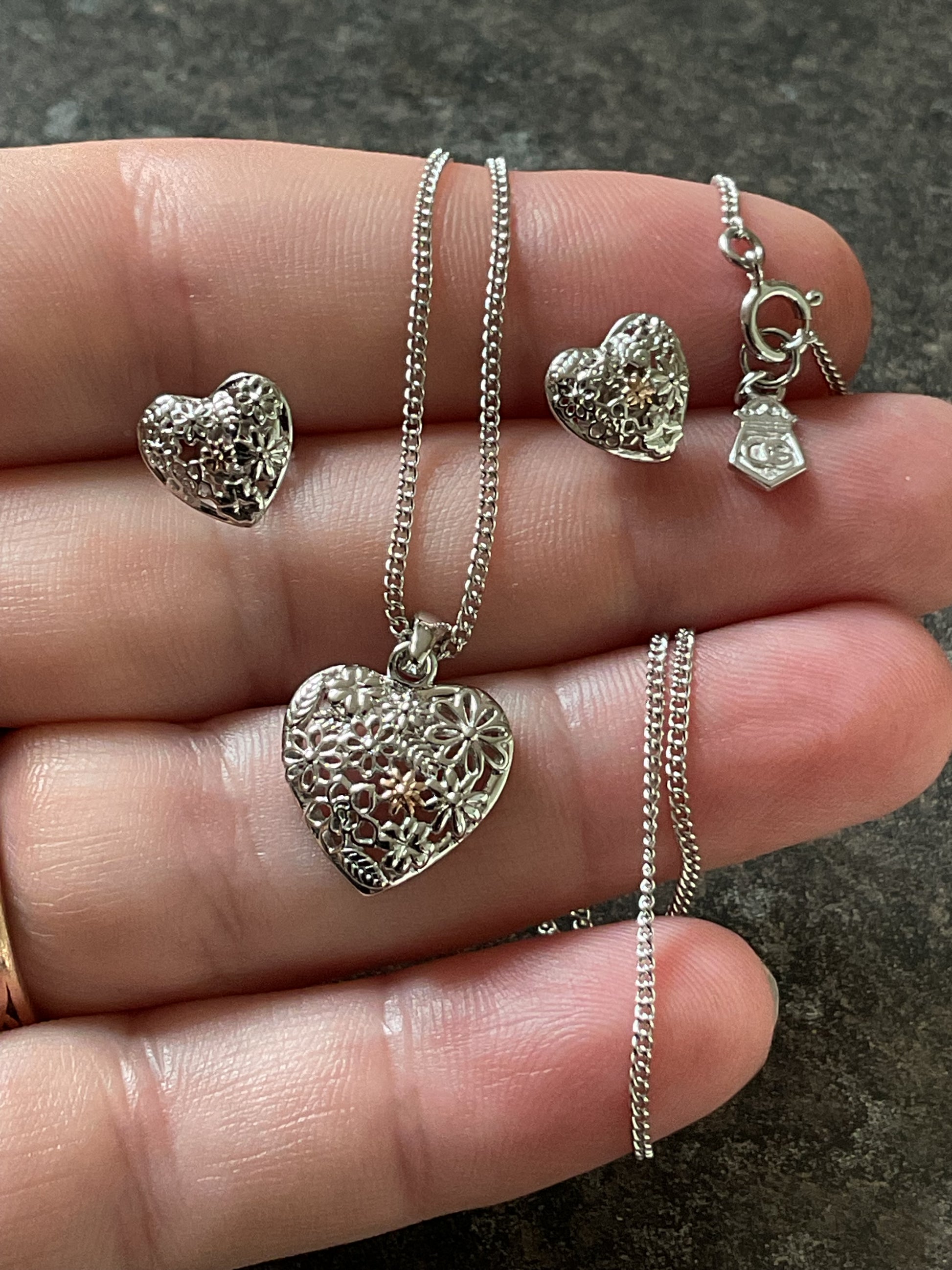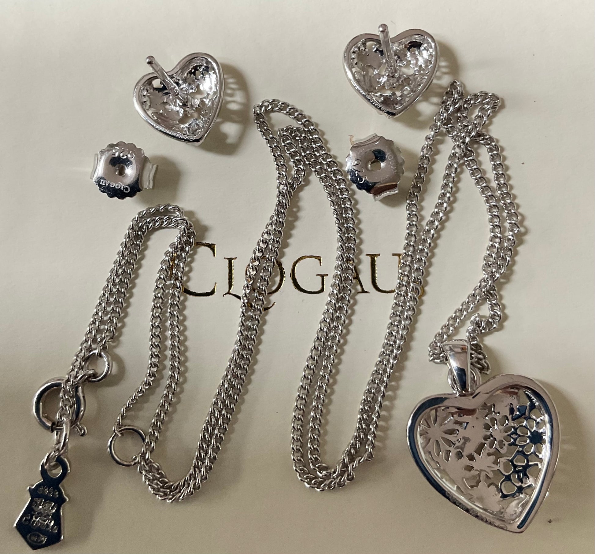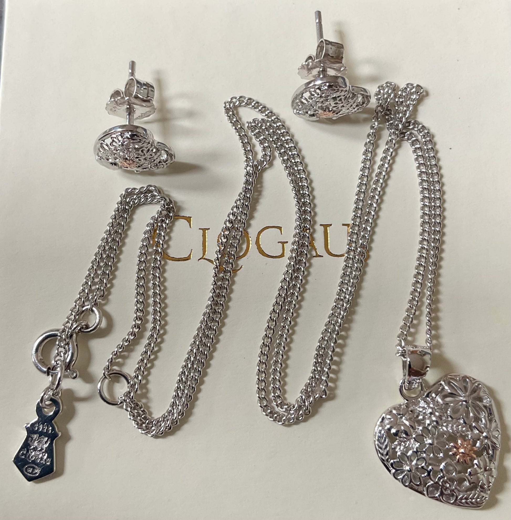 Clogau Floral Heart earrings and necklace set 16-18” Rare silver and rose gold