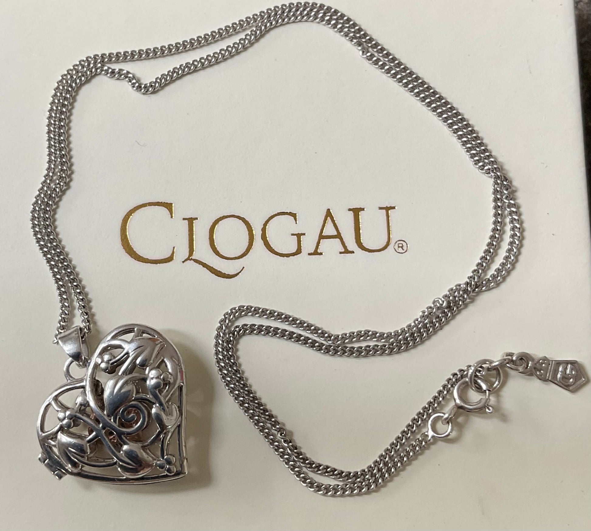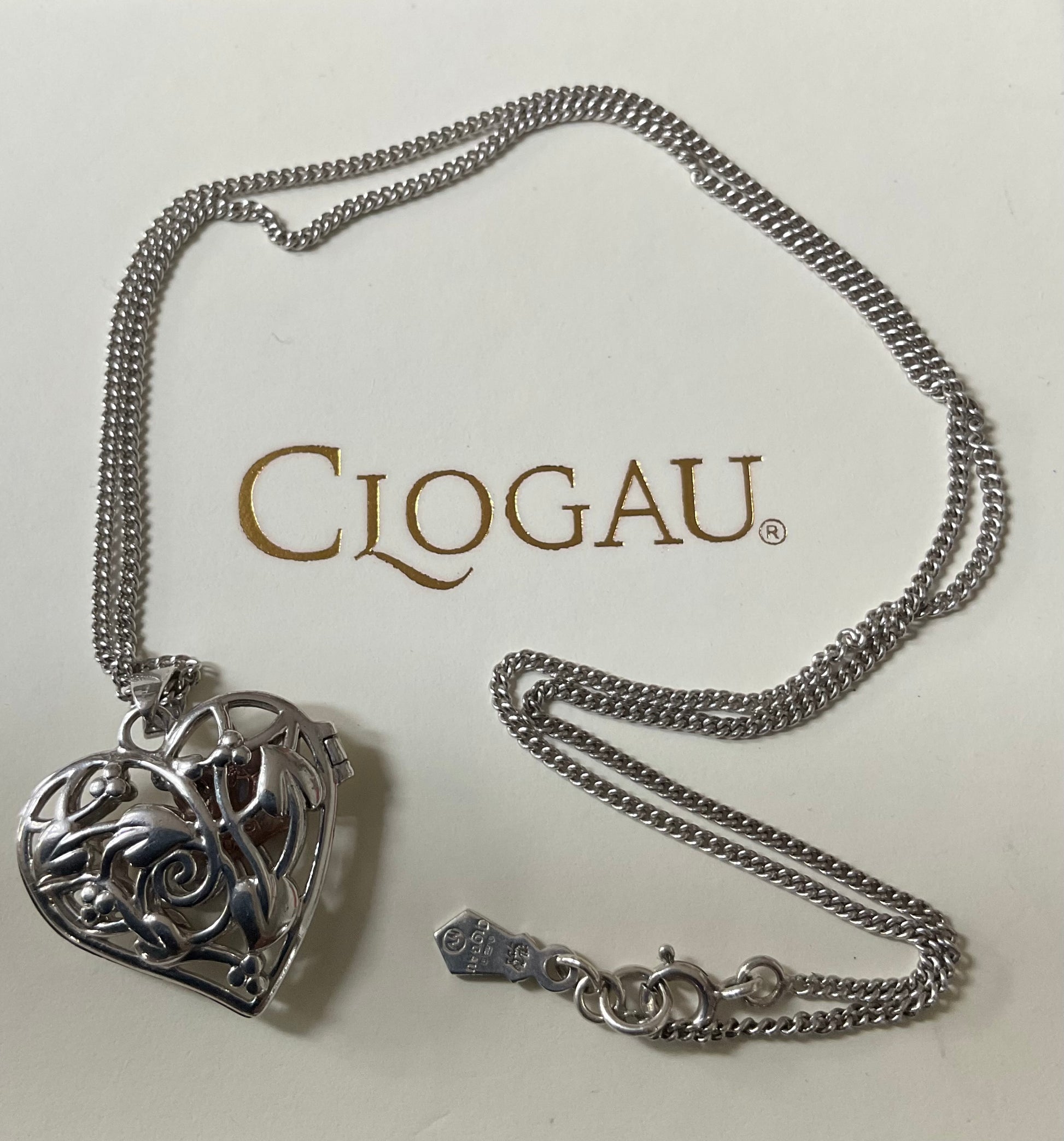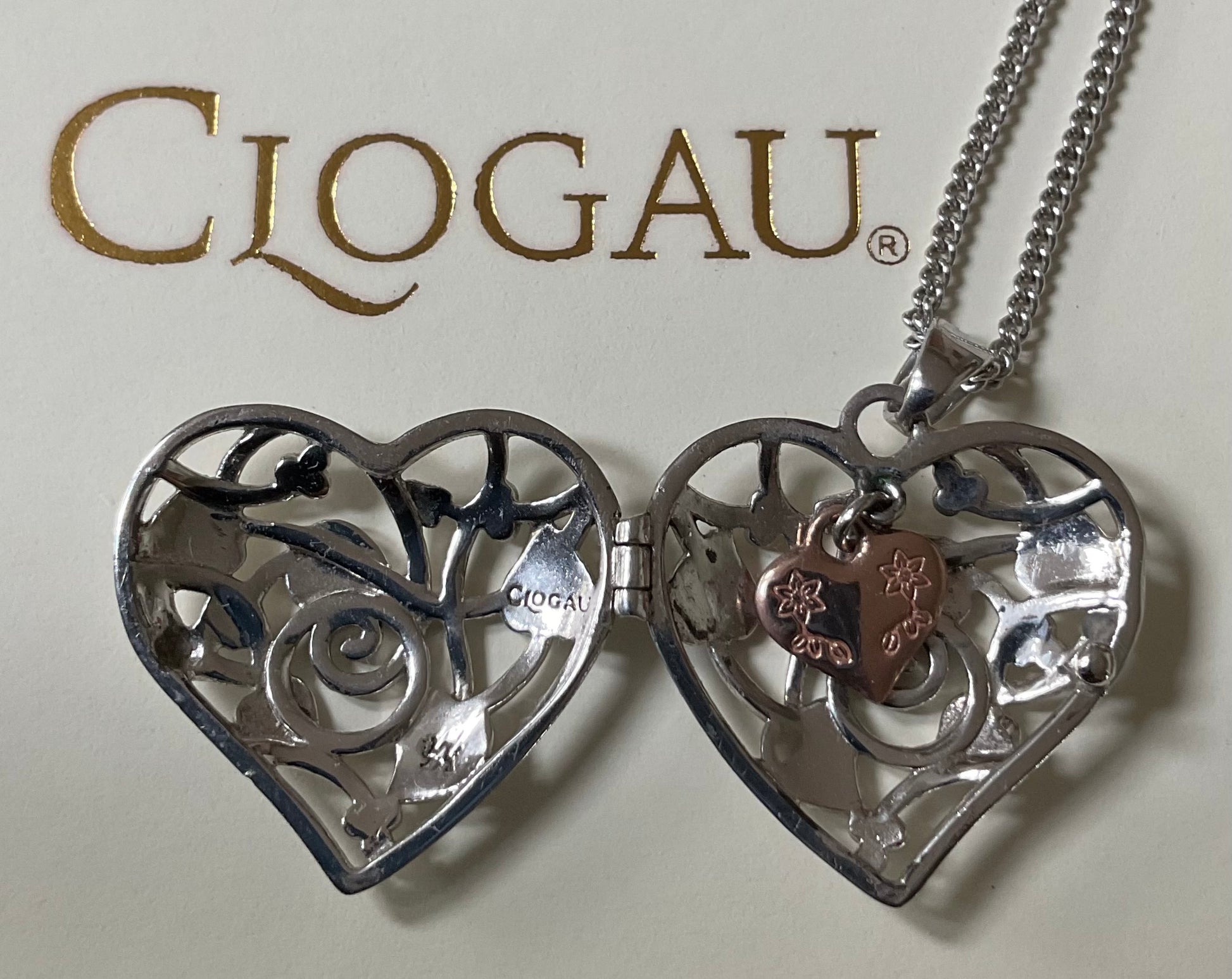 This lovely Clogau necklace features a sterling silver heart locket displaying the Tree of Life pattern on both sides, so it doesn’t matter which way around you wear it. Inside the locket is another little dangling rose gold heart charm. The pendant measures 2.5x2.5cm including the bale and sits on an 18” Clogau silver chain. You will find the Clogau stamps and hallmarks inside the locket and on the tag. It’s in lovely preowned condition with very small signs of wear on close inspection and the clasp snaps shut securely. It will come in a white Clogau necklace box.