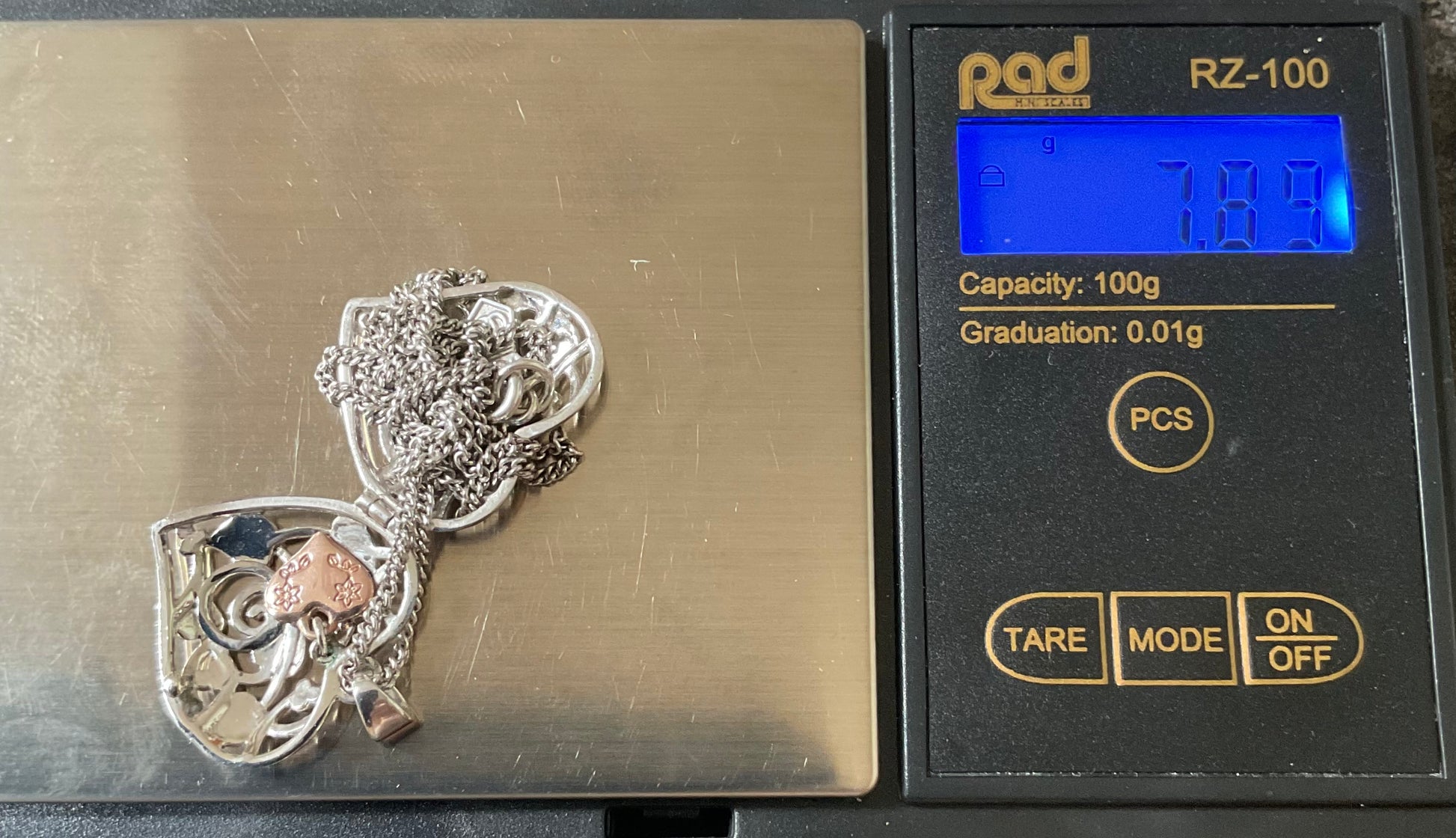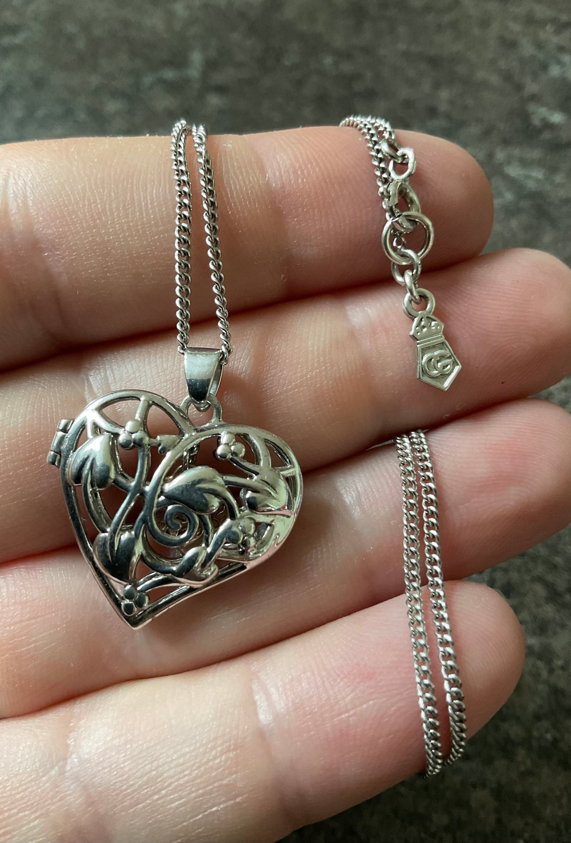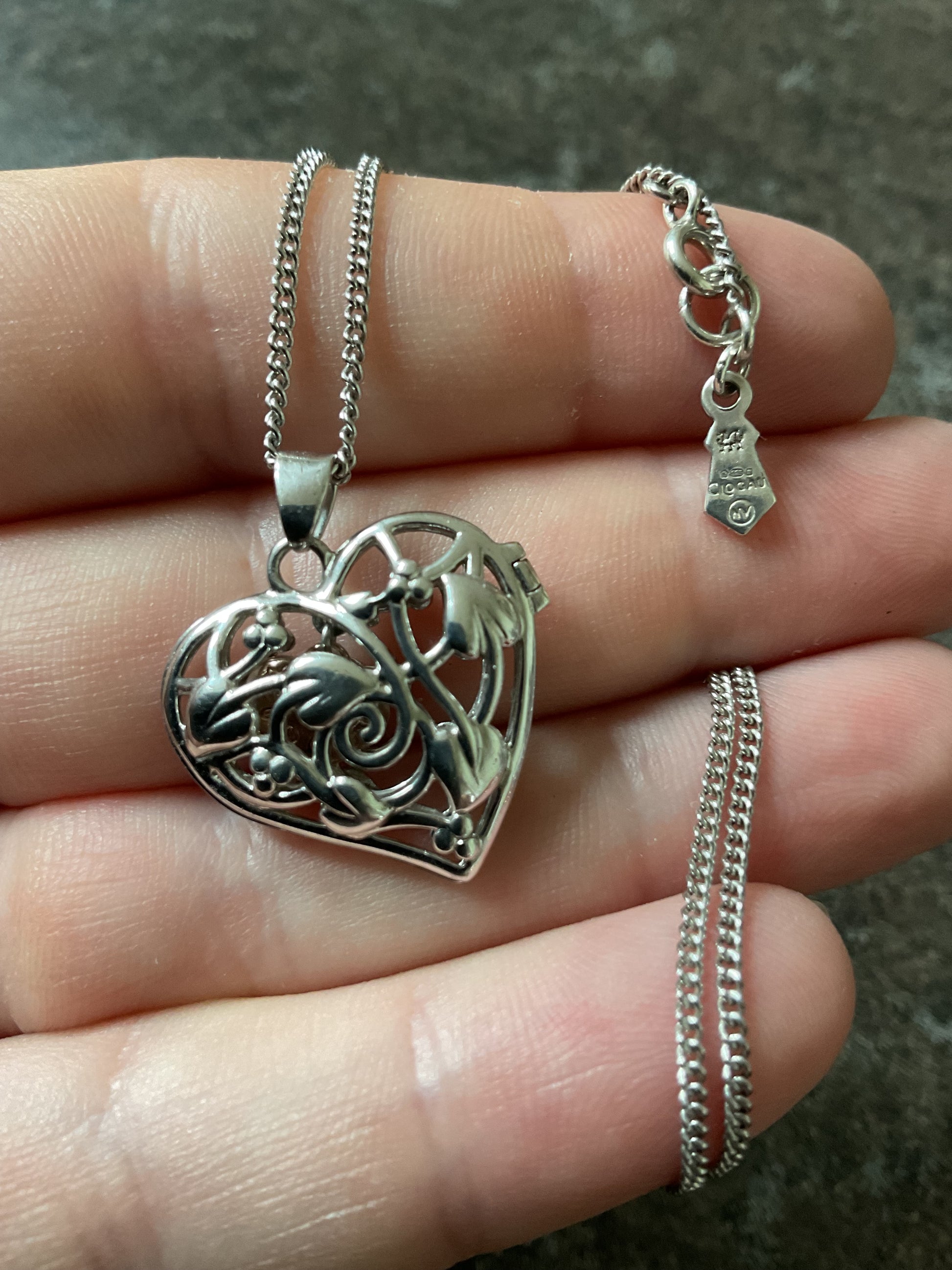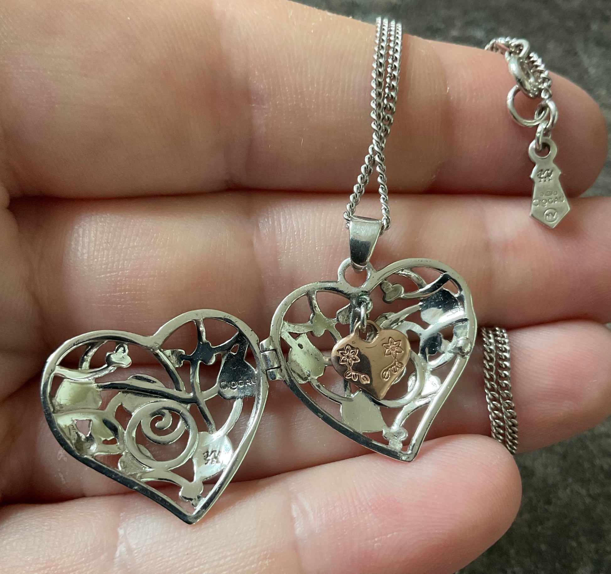 This lovely Clogau necklace features a sterling silver heart locket displaying the Tree of Life pattern on both sides, so it doesn’t matter which way around you wear it. Inside the locket is another little dangling rose gold heart charm. The pendant measures 2.5x2.5cm including the bale and sits on an 18” Clogau silver chain. You will find the Clogau stamps and hallmarks inside the locket and on the tag. It’s in lovely preowned condition with very small signs of wear on close inspection and the clasp snaps shut securely. It will come in a white Clogau necklace box.