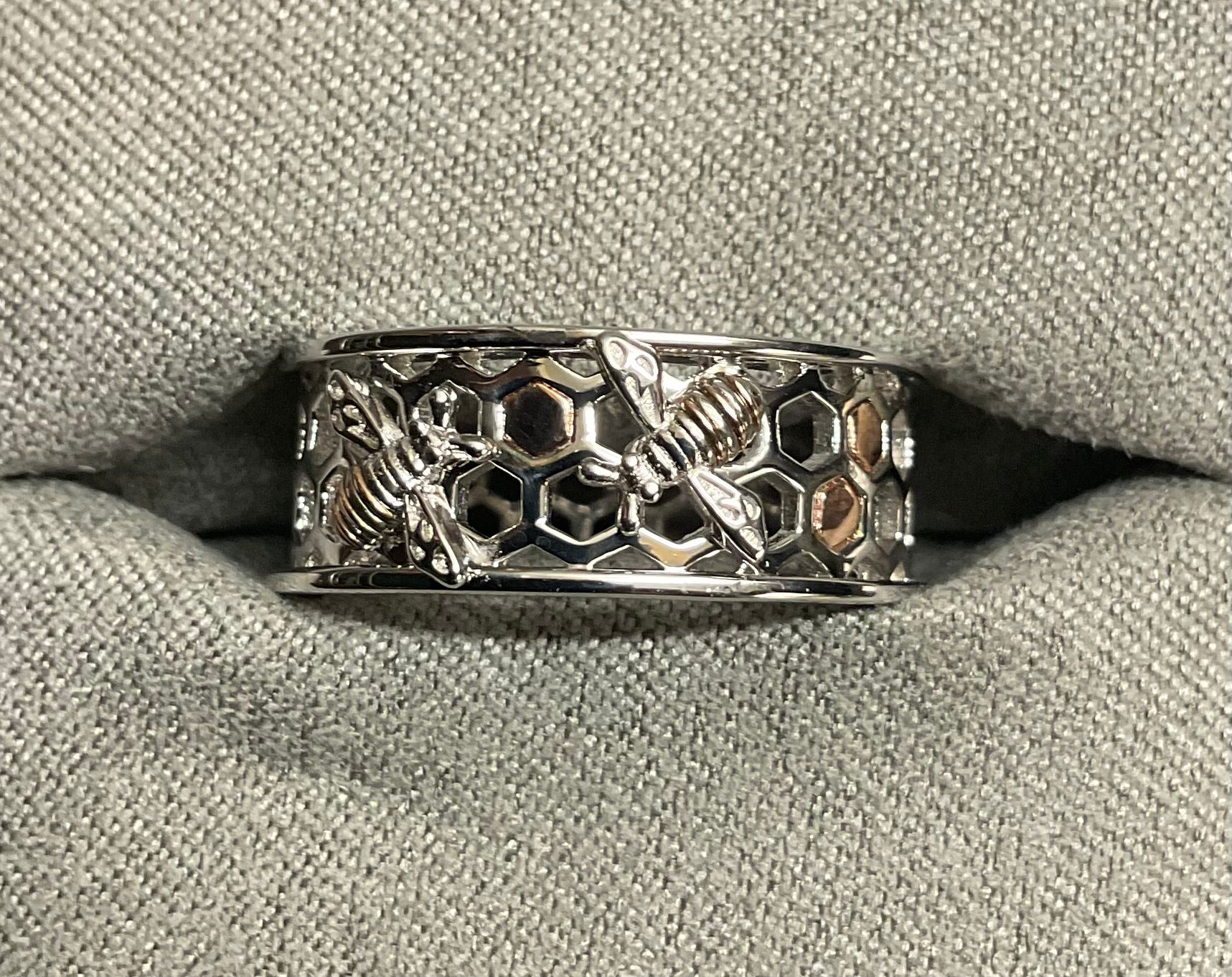 Clogau Honey Bee On Honeycomb wide band ring in silver and rose gold size Q