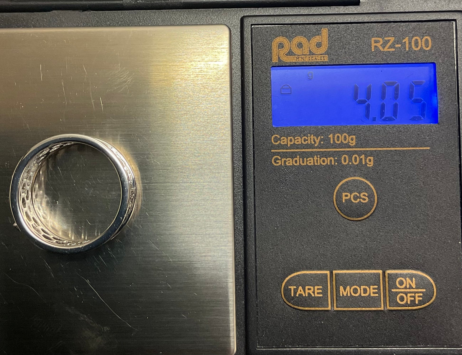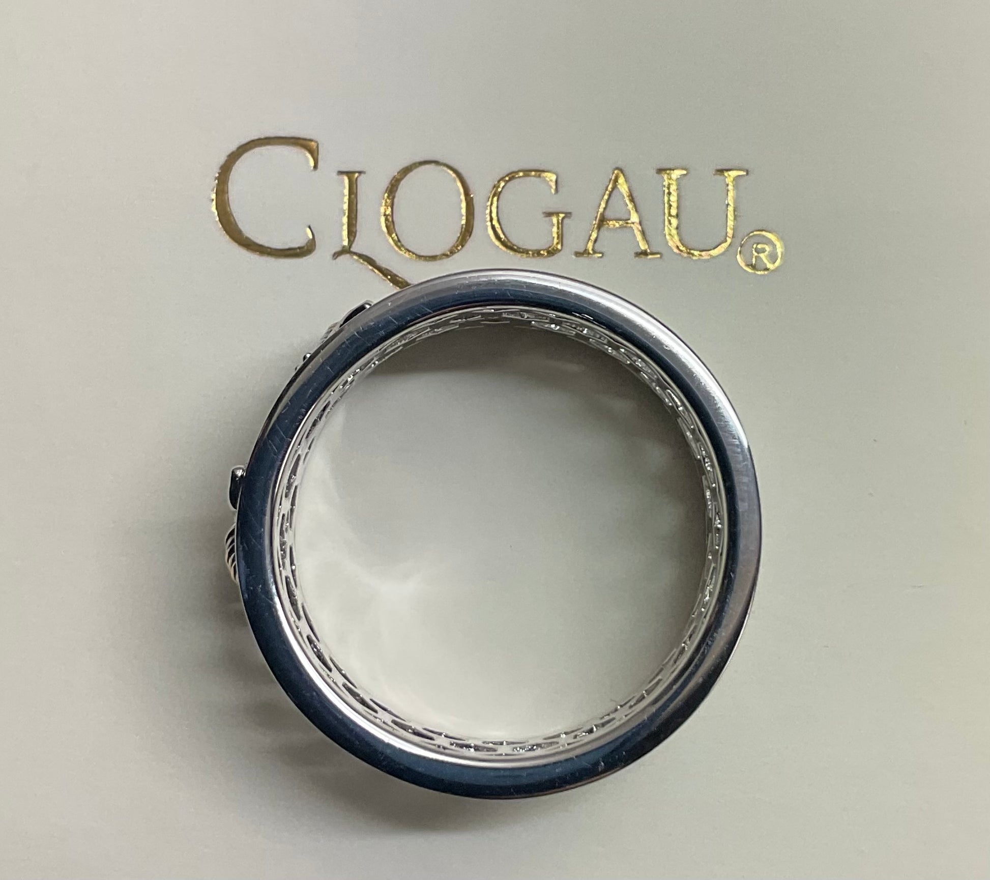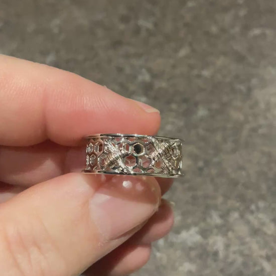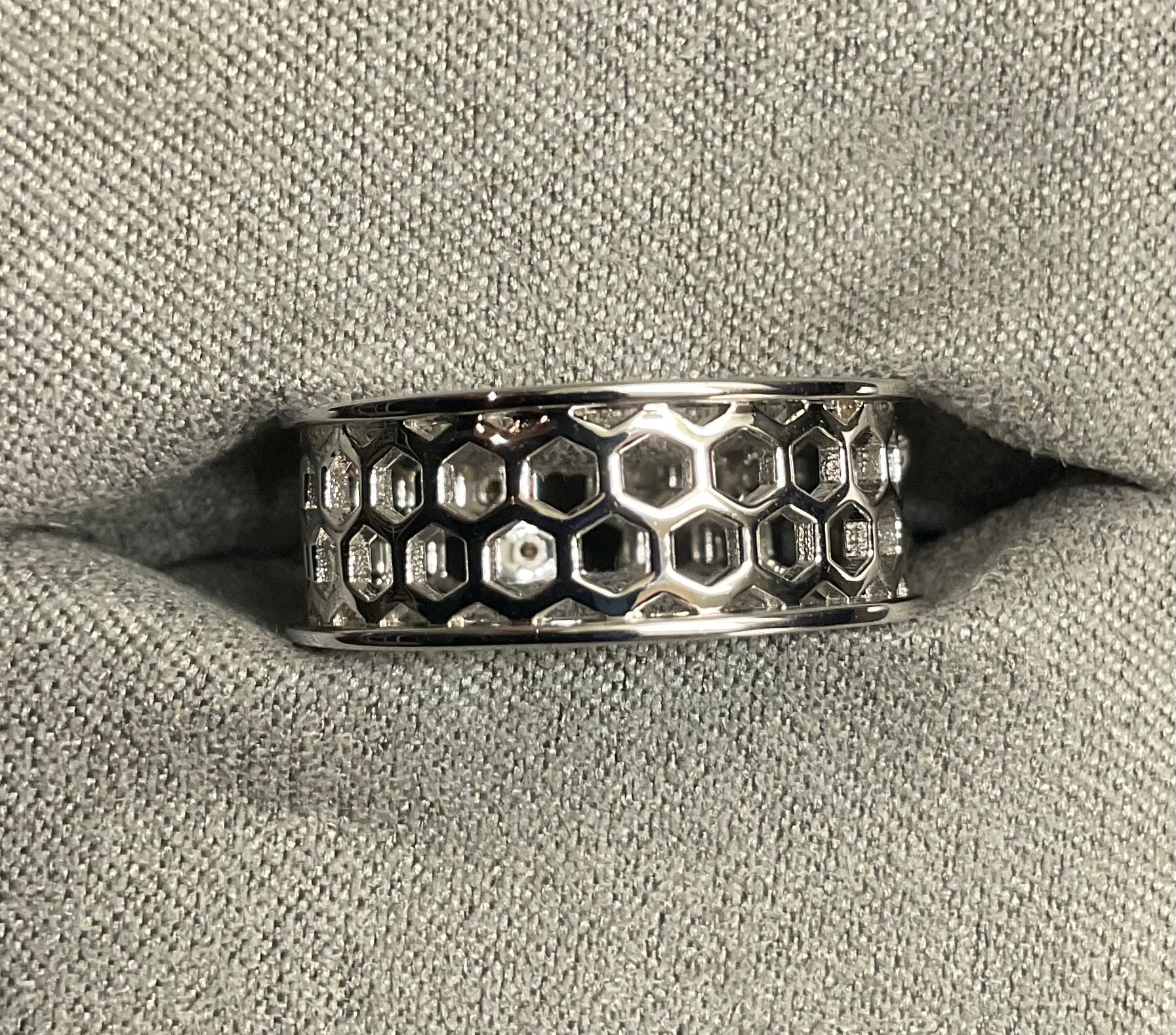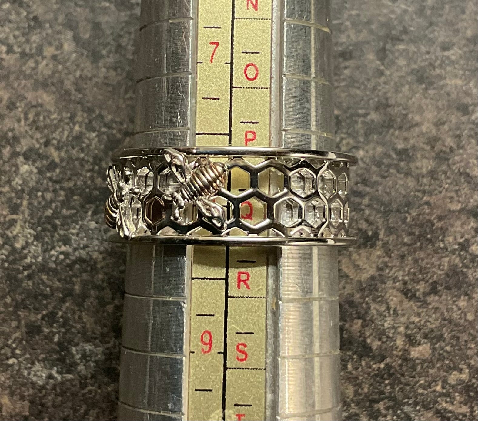 This stunning Clogau ring is full of detail which ever way you look at it. The front of the ring has 2 little silver and rose gold Honey Bees, sitting on a Honeycomb design that goes all the way around the ring. 3 of the honeycomb panels have been infilled with rose gold, whilst the rest of the band has cut out sterling silver chambers. The band measures 8mm across and has the Clogau hallmark inside. This ring has only been taken out of its box for the photos, so is in excellent condition and comes in the Clogau box shown, with a Clogau cleaning cloth. It is a size Q.