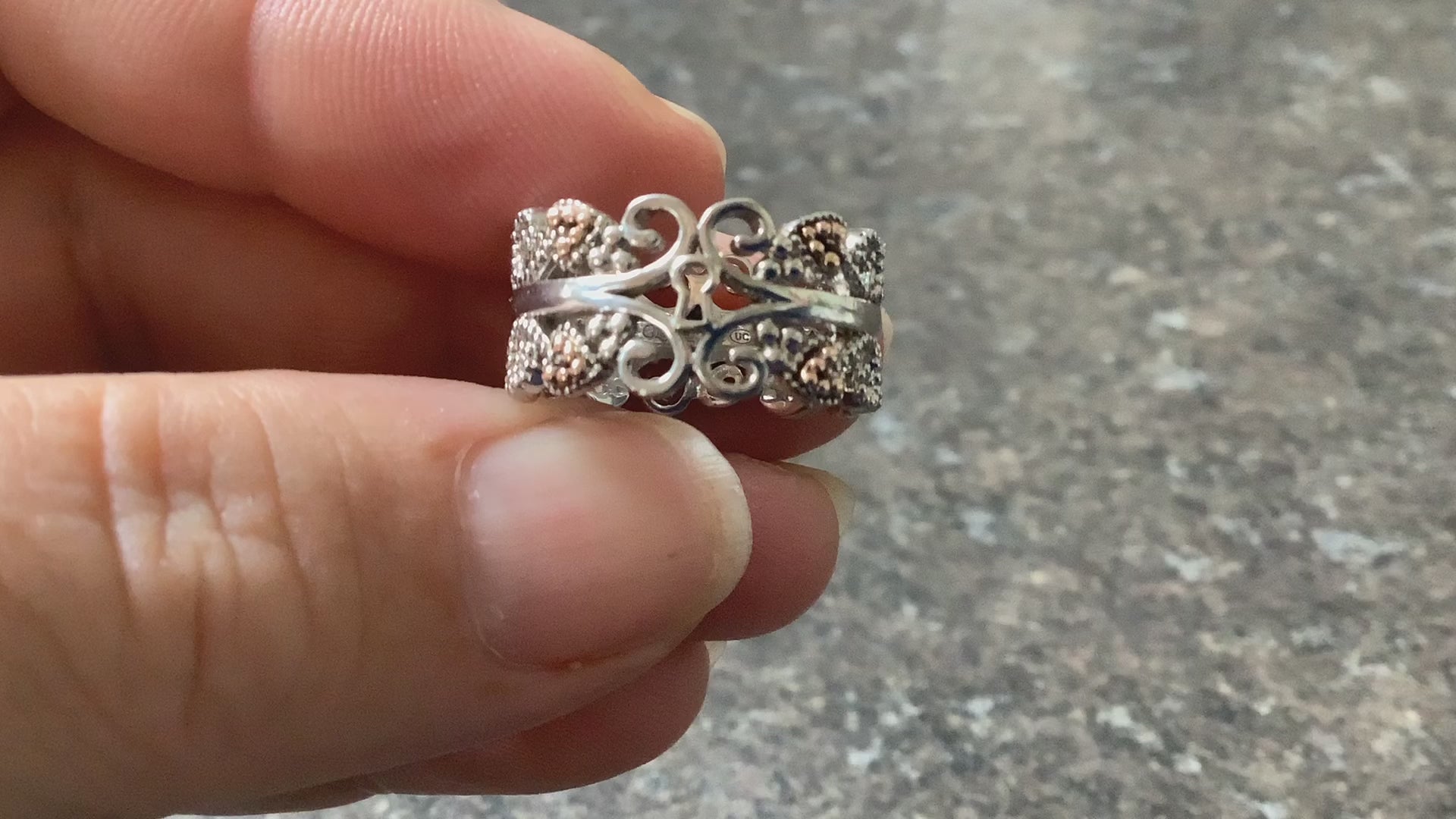 This is a lovely wide ring with lots of detail going all the way around the ring. It is 1cm wide and has all the usual Clogau stamps and the silver hallmark. If you look at the photo of this on the ring sizer, you will see that the centre of the ring falls between K1/2 and L, as wider rings can often feel smaller on the finger. It is in good condition with small signs of wear on close inspection. It will come in a Clogau ring box.