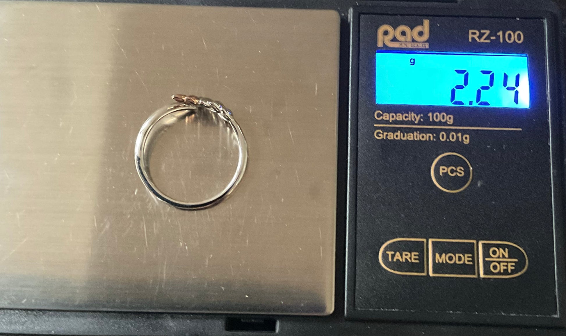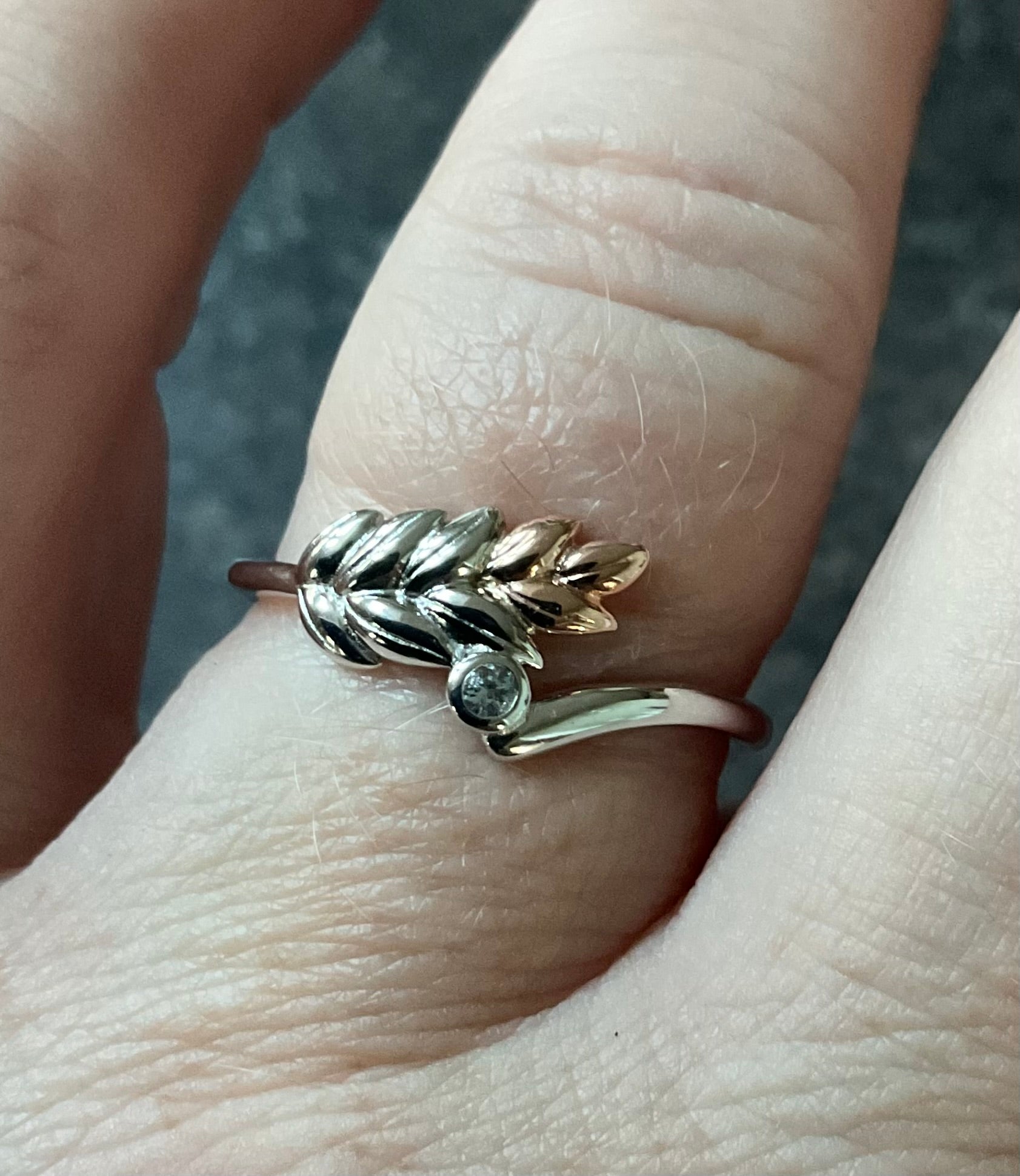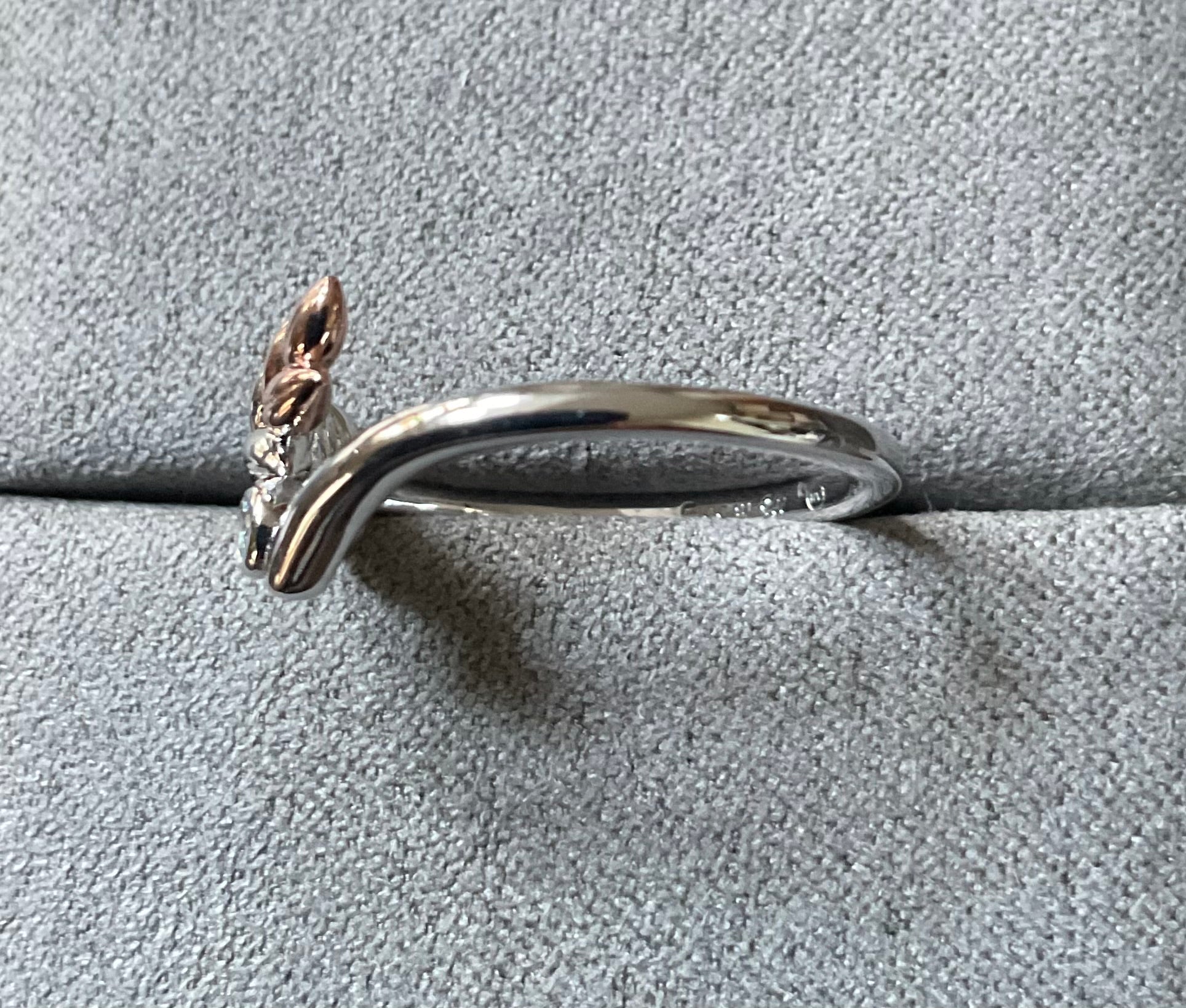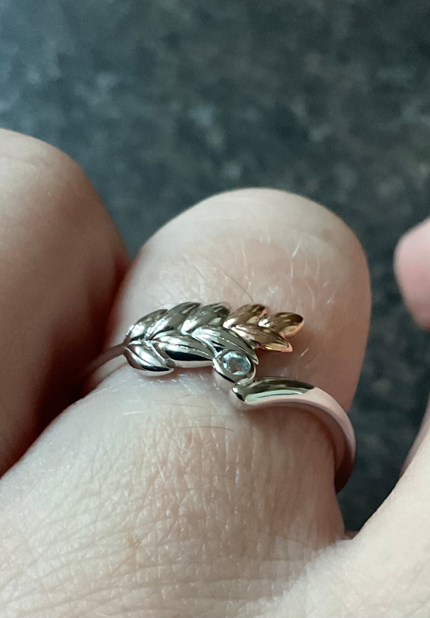 This beautiful ring was designed in tribute to our beloved monarch and is inspired by Queen Elizabeth II's coronation gown, with its intricate gold lace filigree and embroidered ears of wheat and olive branches - symbols of prosperity and peace. The Lilibet Silver and Sky Blue Topaz Ring features a sterling silver and rose gold ear of wheat arcing towards a sparkling Blue topaz gemstone. The inner band has the expected Clogau stamps and silver hallmarks. This ring has only been taken out of the box for these photos, so is in great condition. It will come in a Clogau box with Clogau cleaning cloth. I have this ring available in a size M, R and T.