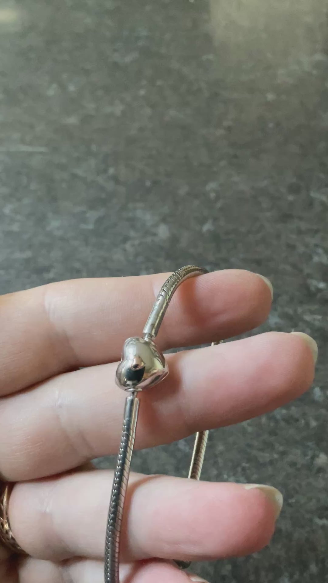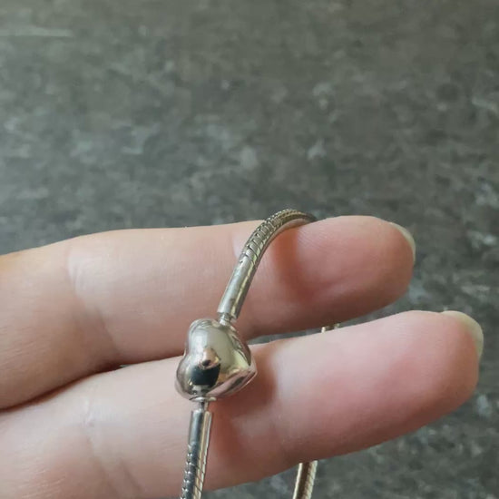 Clogau Milestones Heart Charm bracelet with 2 stoppers in good preloved condition with small signs of wear. The heart looks in good condition to the eye but you can see wear when you look through the magnifying loupe and there is some pale darkening of the bracelet near the clasp. The clasp is very secure and works well. The bracelet measures 19cm in length and has all the Clogau stamps and hallmarks. The stoppers don’t have any Clogau stamps on, so I don’t know for sure that they are original (I don’t know if they always stamp the stoppers) but they fit securely and won’t let your charms slide about. This comes in a white Clogau box. (I am selling some Clogau charms that would fit on this bracelet in my other items).