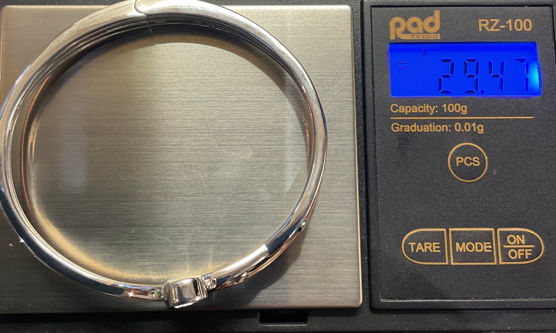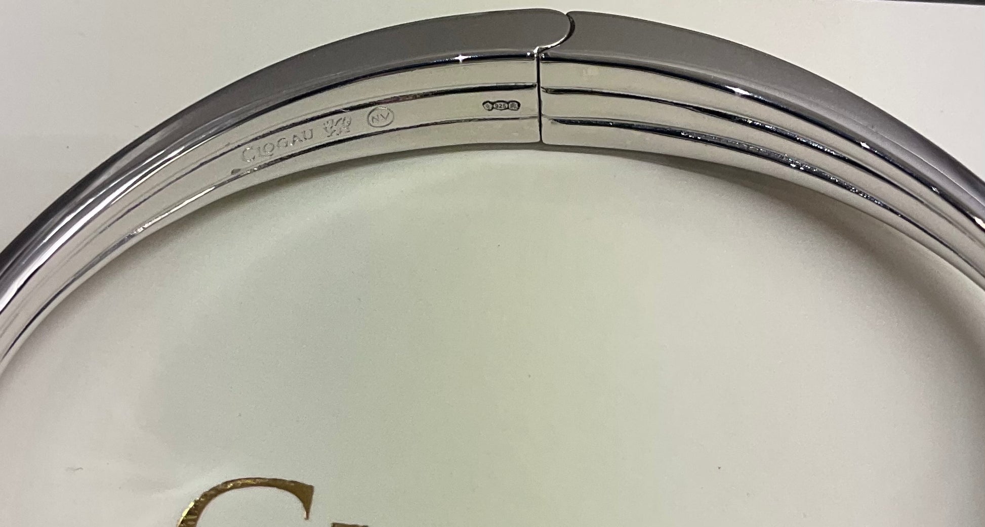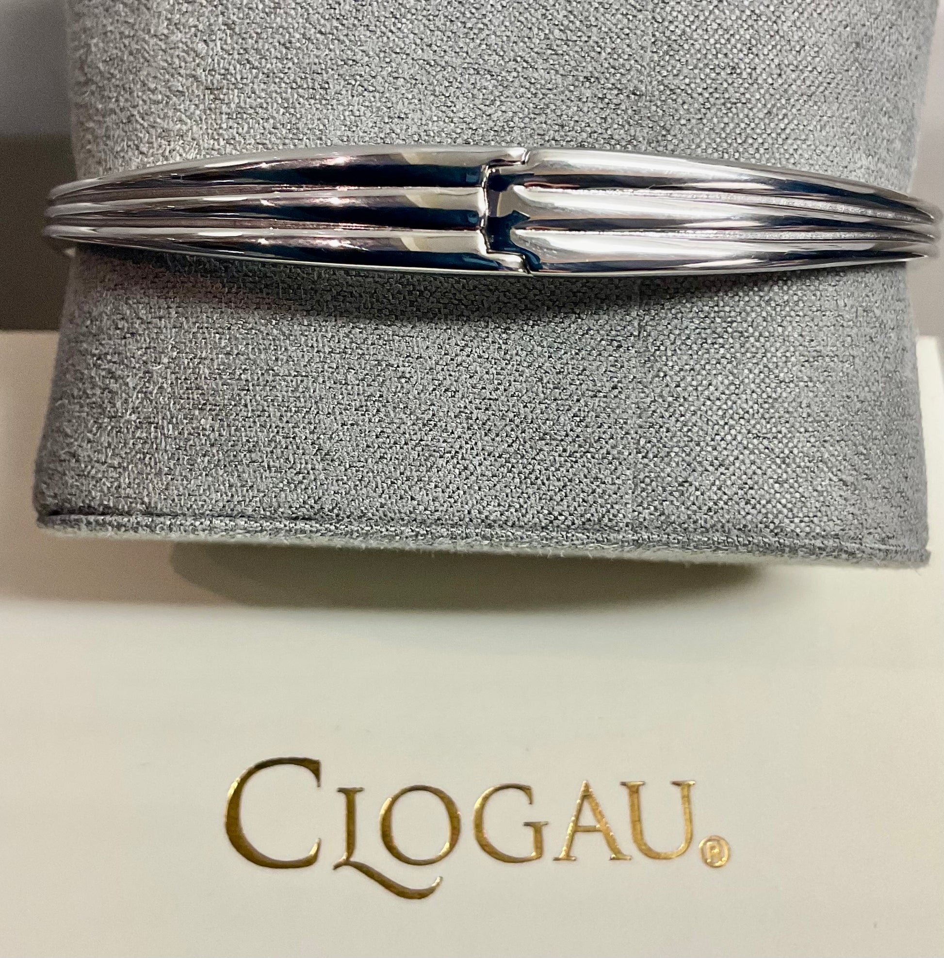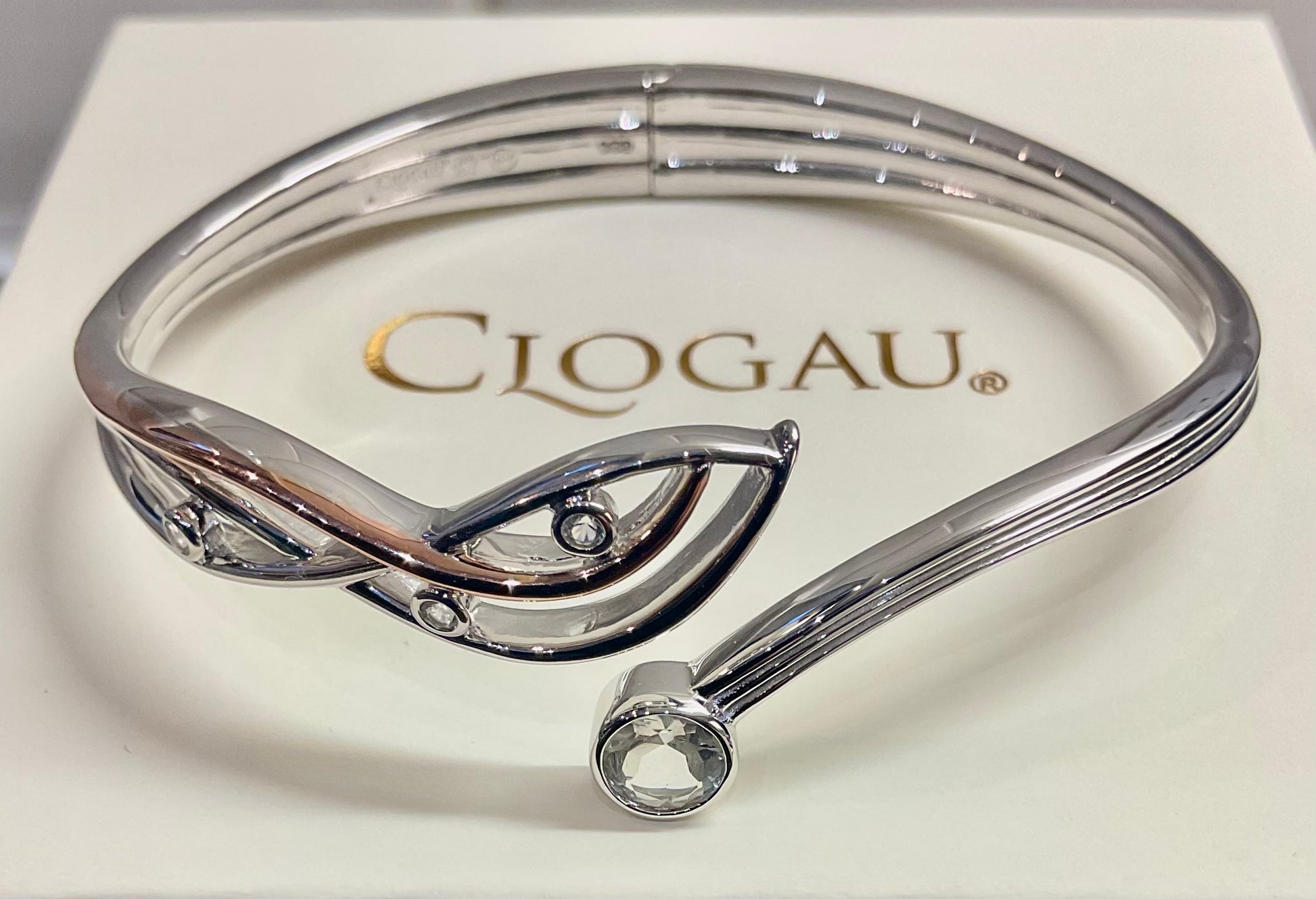 This Clogau bangle is just gorgeous and not so easy to come by. It features the waterfall design of Swallow Falls, with waves of 925 sterling silver and rose gold, scattered with bubbles of round cut, bezel set, sparkling white topaz stones. The bangle is hinged, so you don’t have to squeeze it over your hand and weighs a solid, substantial 29.47g! Internally the measurements are 6.1cm diameter from left to right and 5.2cm from top to bottom. The design at the front is 2cm wide. The inner band has the Clogau stamps and hallmarks. This bracelet is in new condition and has only been taken out of the box for these photos. It comes in a white Clogau box with Clogau cleaning cloth.