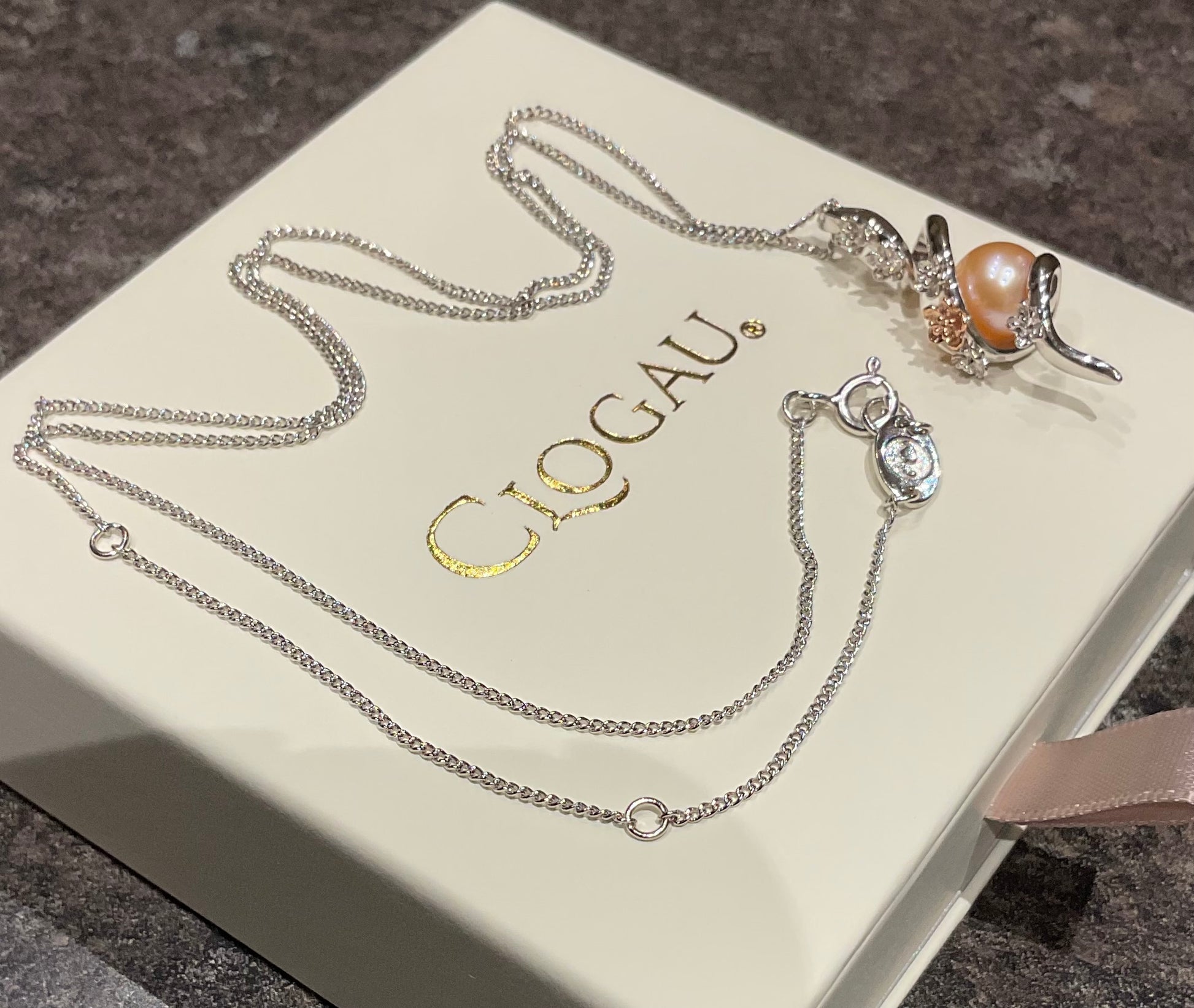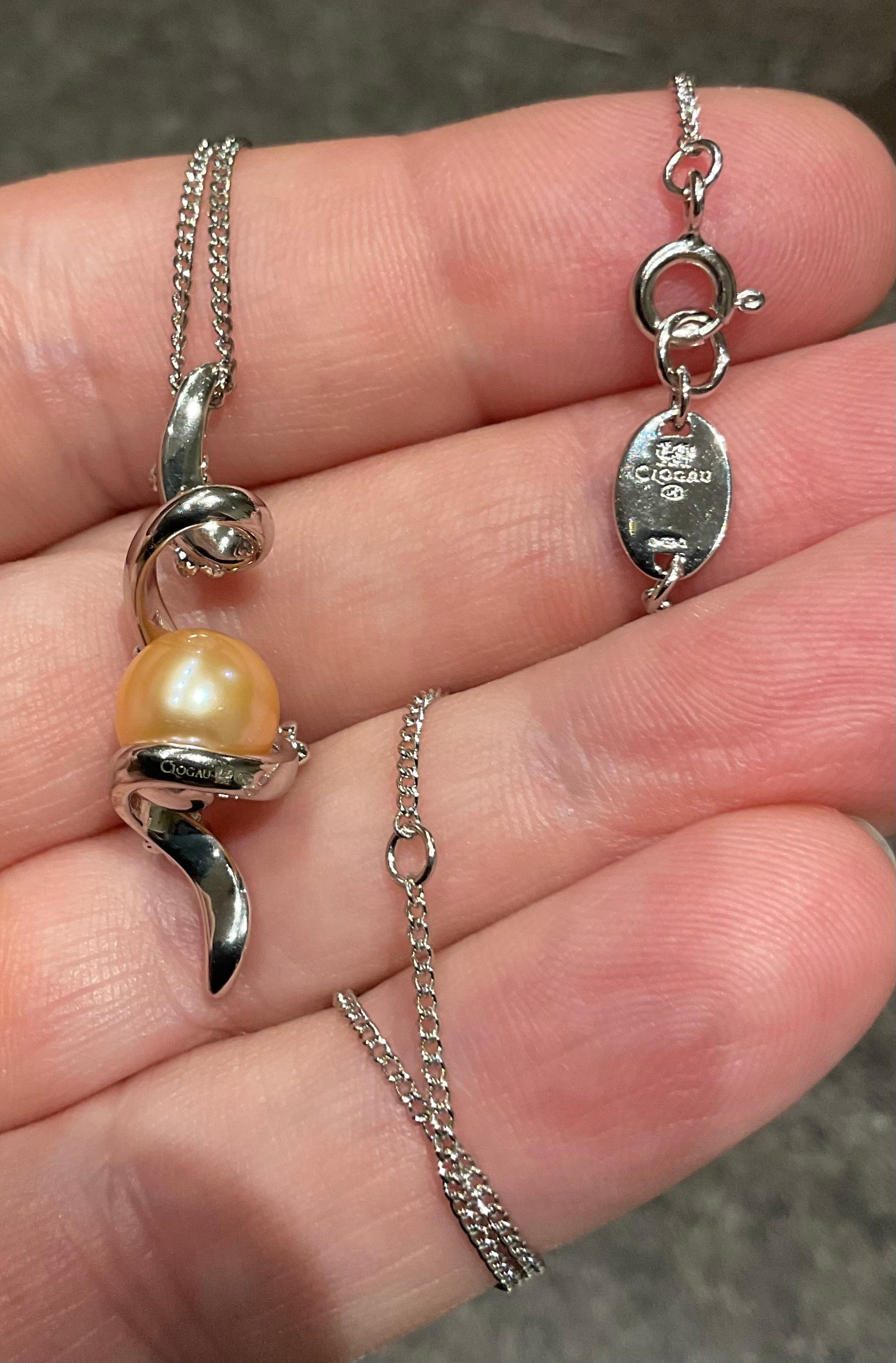 This is a stunning Clogau necklace that you don’t come across very often. It features a spiral of sterling silver, wrapped around a gorgeous 8mm peach pearl. Cascading along the front of the spiral are delicate little silver and rose gold blossoms. The pendant measures 3.5cm in length and 1cm wide and has the Clogau stamps on the back. The Clogau silver chain can be worn at 18, 20 or 22” and has the little silver tag with the Clogau stamps and silver hallmarks on. The necklace is preowned but is in lovely condition with some very small signs of wear on closer inspection. It comes in a Clogau box.