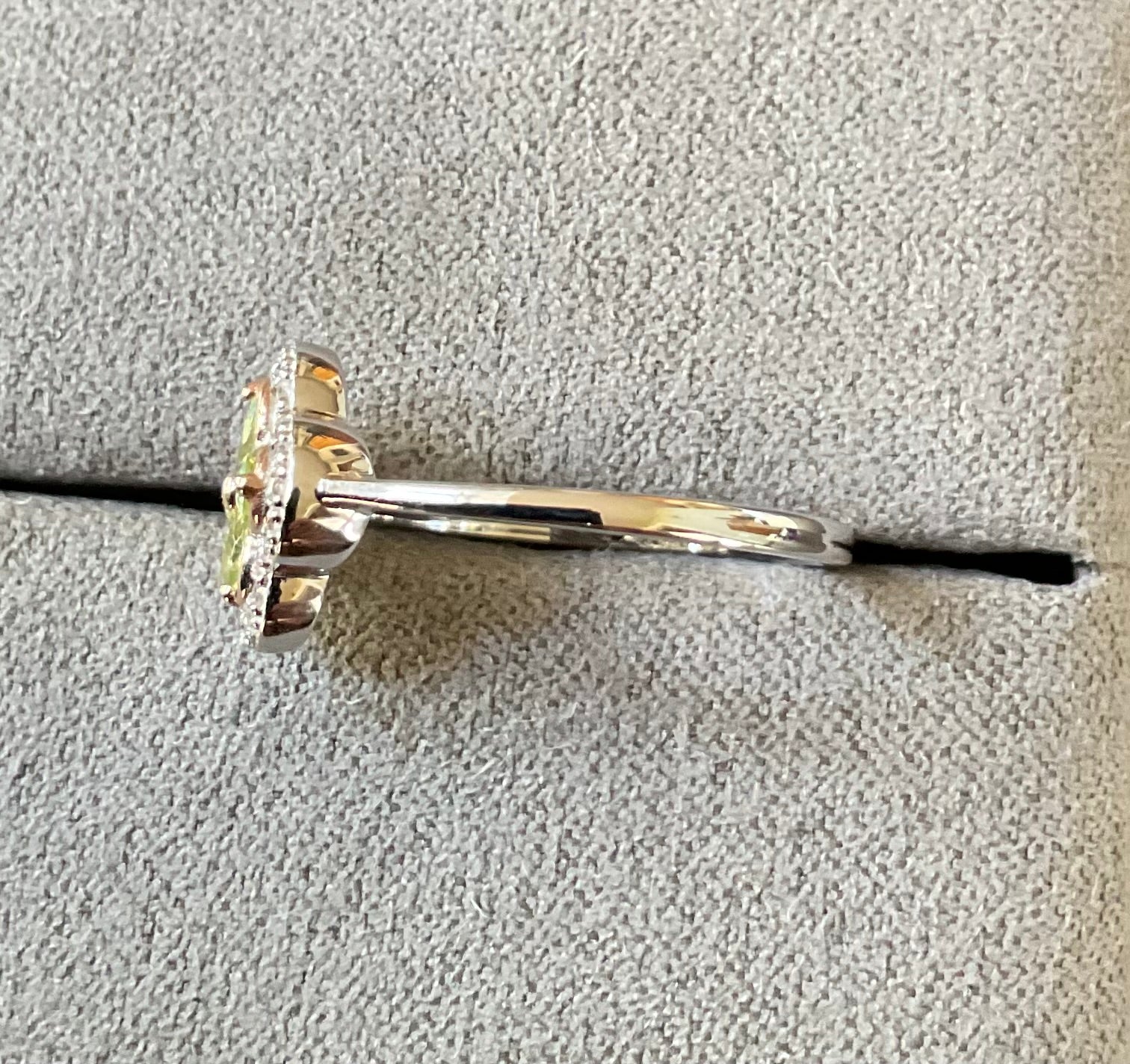 This is a stunning Clogau Tudor Court ring featuring 4 beautiful green, pear cut peridot stones surrounded by a band of rose gold, then a band of sparkling white topaz. It’s a size P and has all the expected Clogau stamps and hallmarks. It’s in excellent condition with no noticeable signs of wear and comes in the Clogau box shown, with a Clogau cleaning cloth.