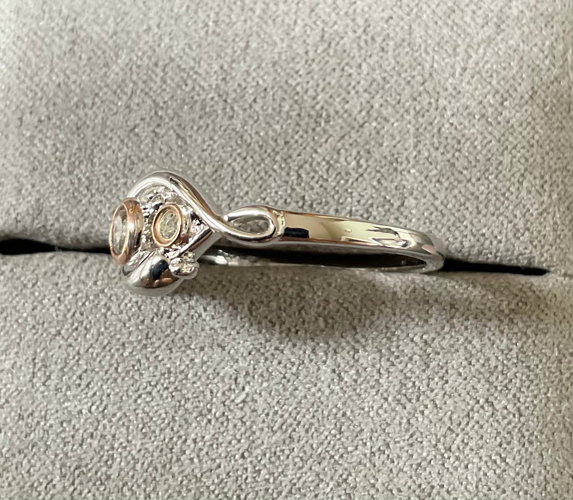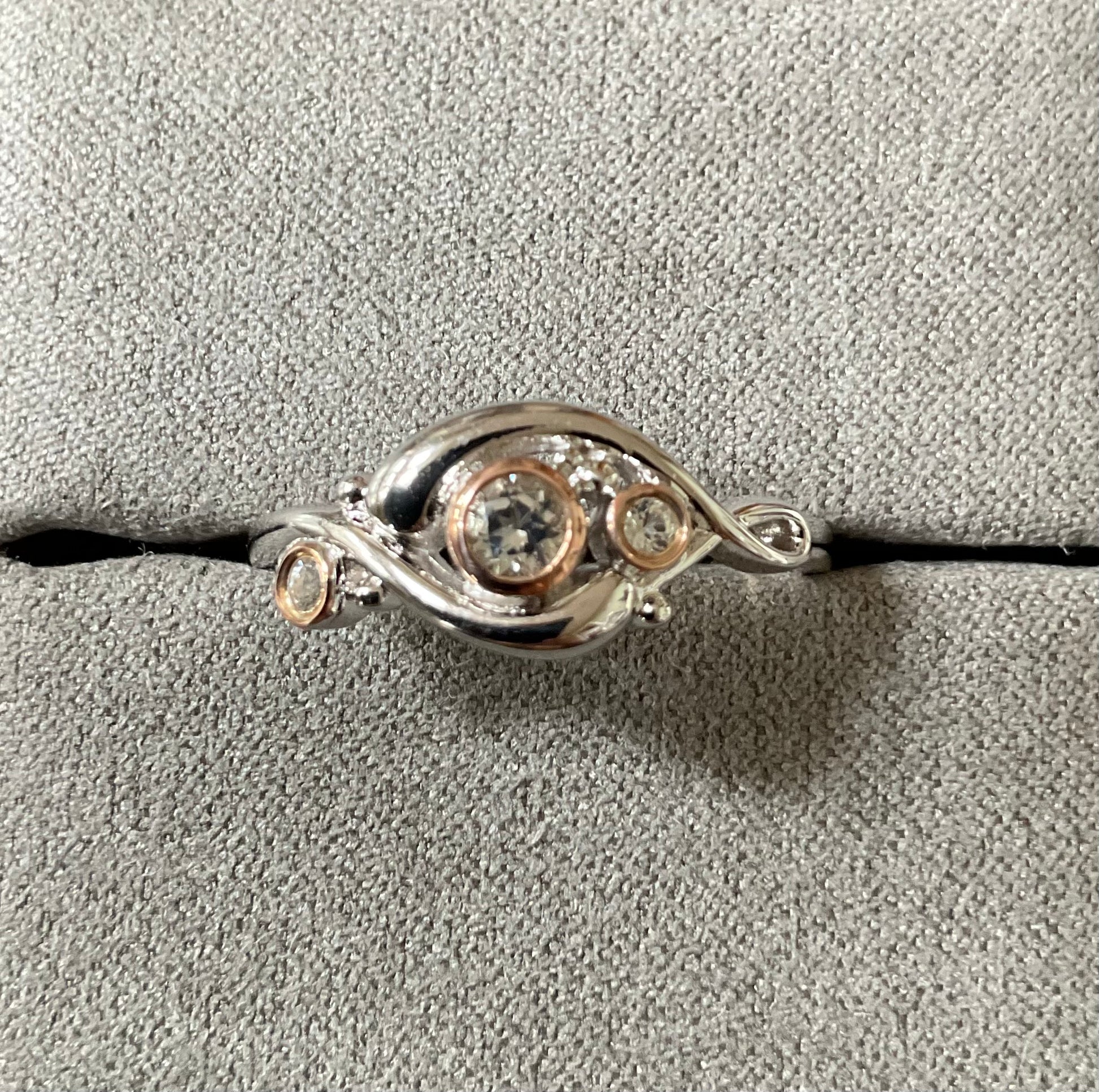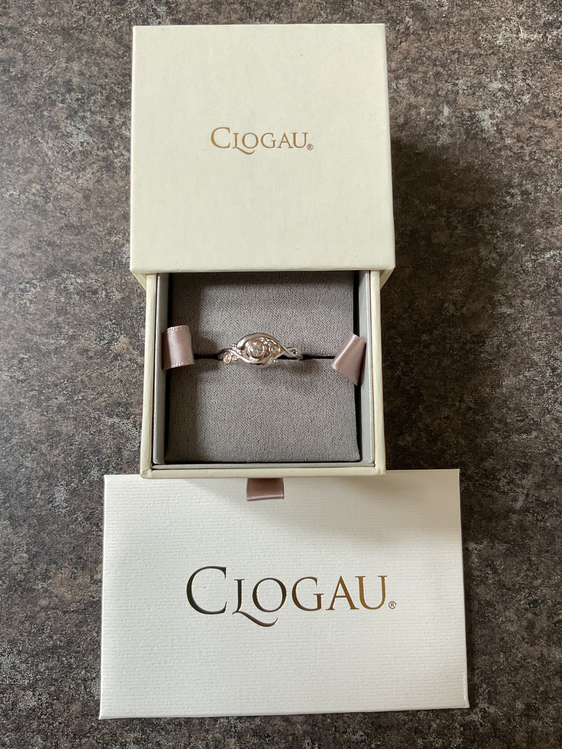 This is a stunning Clogau ring, that looks even prettier in real life! Its design is based on Wales’s highest waterfall at Pistyll Rhaeadr and features 3 round cut white topaz stones, wrapped in rose gold. The rest of the ring is sterling silver and stamped Clogau, with the 925 hallmark on the inner band. This is a size T and has only been worn for these photos, so is in excellent condition. It comes in the box shown with a Clogau cleaning cloth. This is what Clogau has to say: