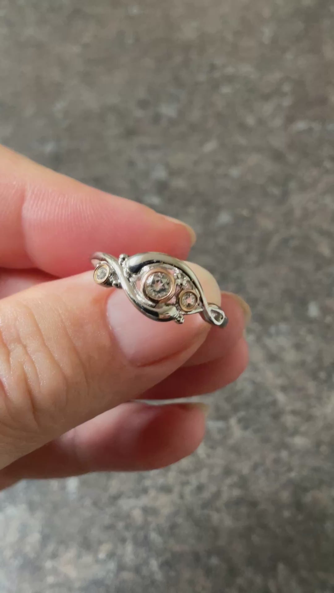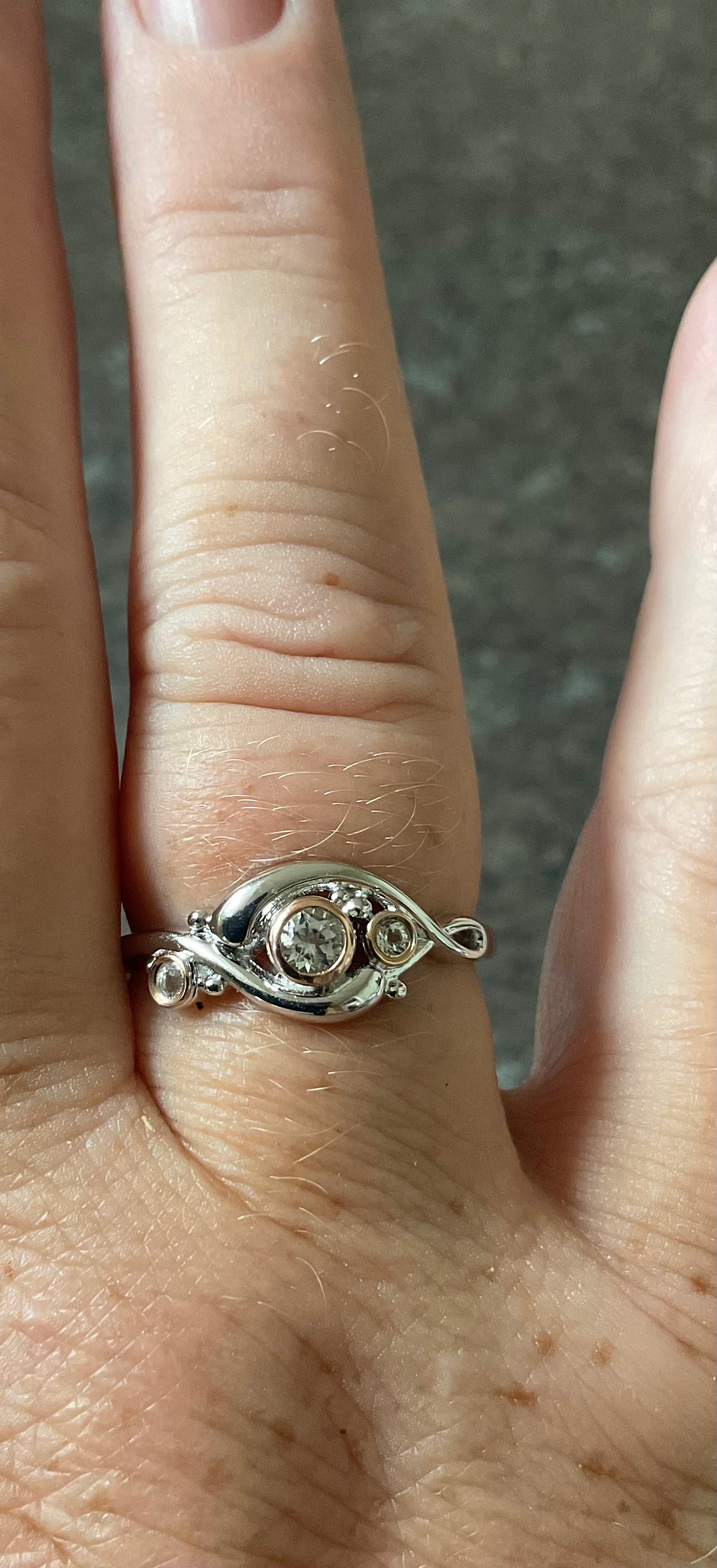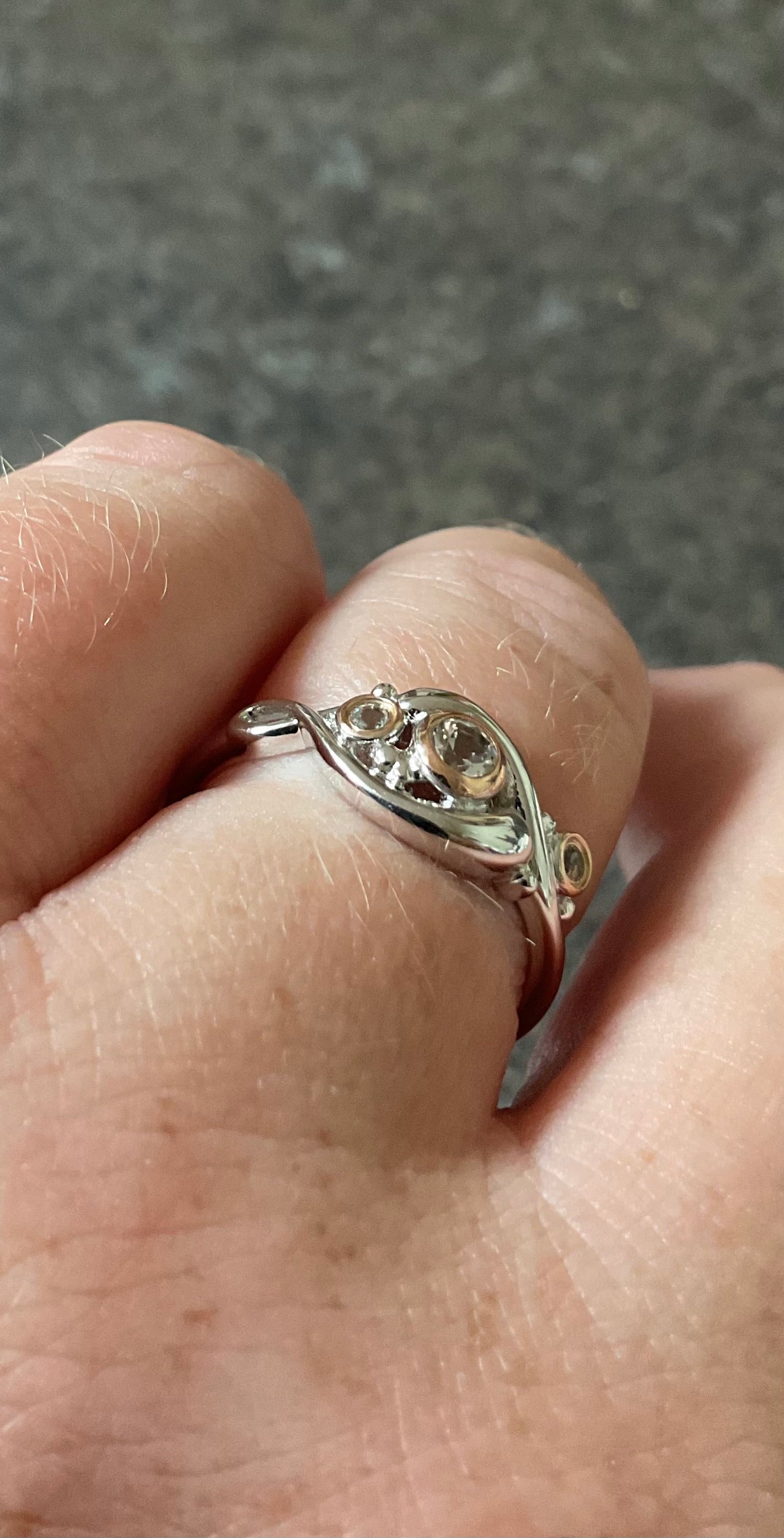 This is a stunning Clogau ring, that looks even prettier in real life! Its design is based on Wales’s highest waterfall at Pistyll Rhaeadr and features 3 round cut white topaz stones, wrapped in rose gold. The rest of the ring is sterling silver and stamped Clogau, with the 925 hallmark on the inner band. This is a size T and has only been worn for these photos, so is in excellent condition. It comes in the box shown with a Clogau cleaning cloth. This is what Clogau has to say: