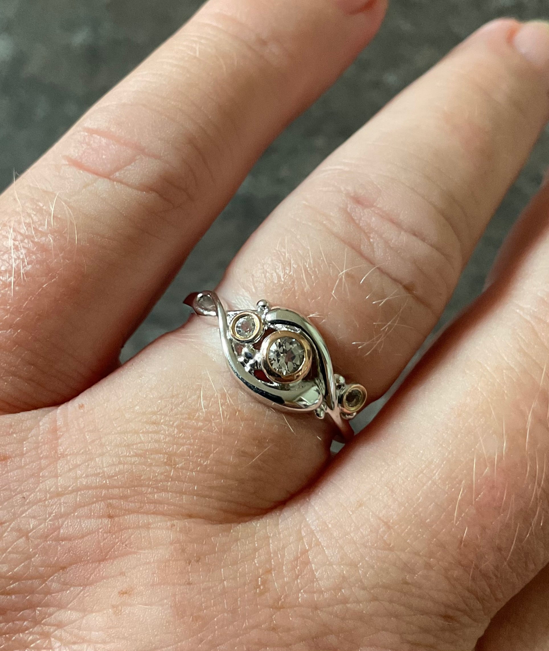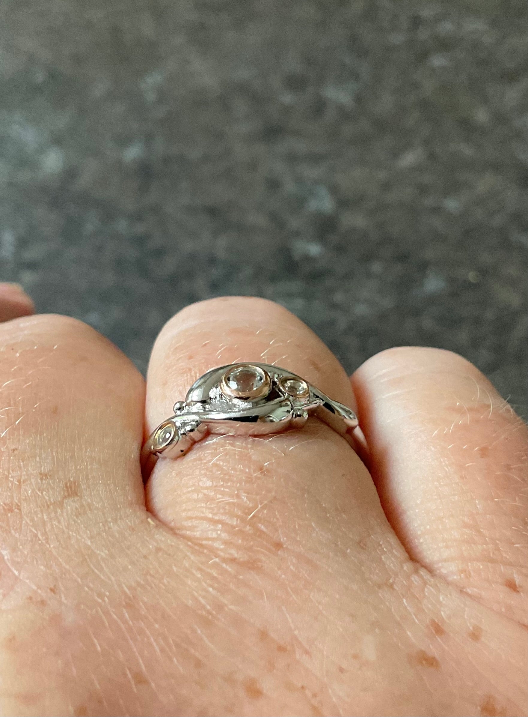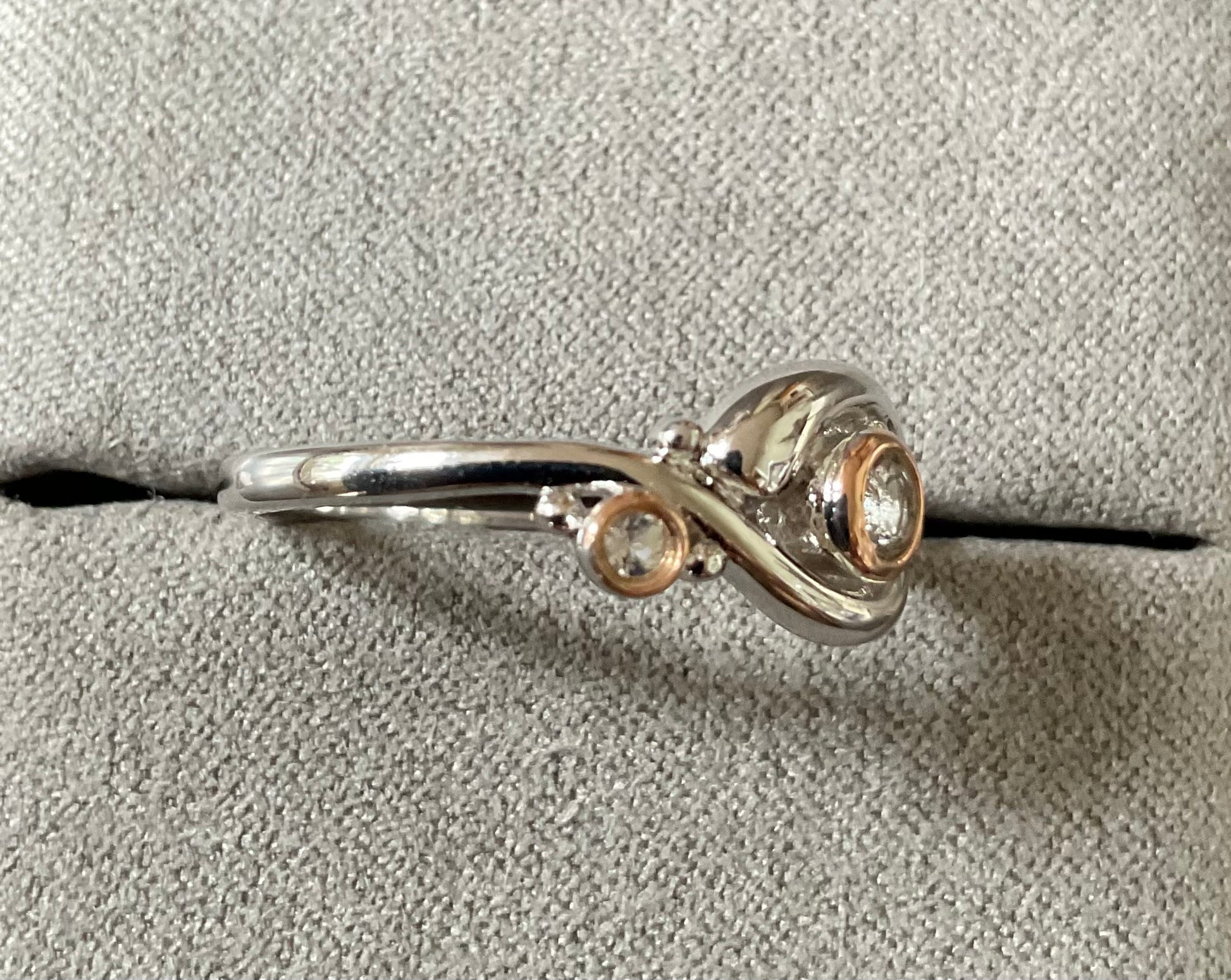 Wales's highest waterfall at Pistyll Rhaeadr evokes a sense of calm and wonder. Our Pistyll Rhaeadr Silver Ring reflects those emotions through flowing waves of sterling silver adorned with 9ct rose gold. The design is completed with dazzling white topaz gemstones representing light playing on the rippling waters. A sparkling choice for all nature-lovers.