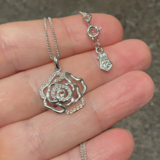 This lovely Clogau Royal Roses White Topaz necklace is in good preloved condition with imperfections visible on close inspection. This necklace features the beautiful Royal Rose, in sterling silver, with a touch of rose gold along the edge of one of the outer petals. There are small white topaz stones scattered across the surface, to give that pretty bit of sparkle. The necklace has a Clogau silver chain with Clogau tag and can be worn at 18, 20 or 22” and the pendant measures 2.2cm from the top of the bale and 1.7cm wide. The back of the pendant has the Clogau stamps on and the silver tag has further Clogau stamps and the hallmark. This necklace will come in Clogau packaging. I have the matching earrings for sale in my other items and I am happy to place them in the same box and combine postage.