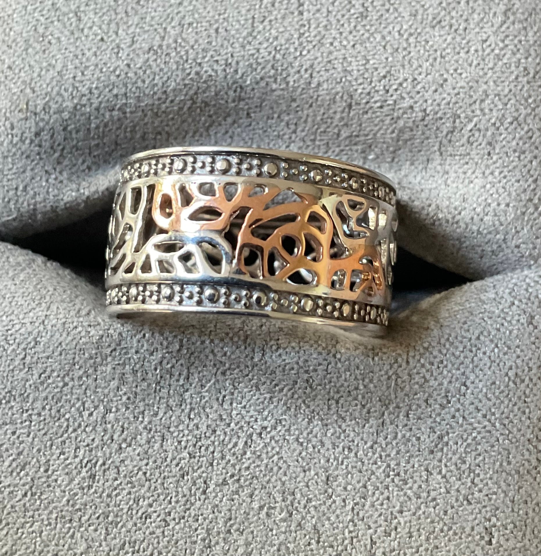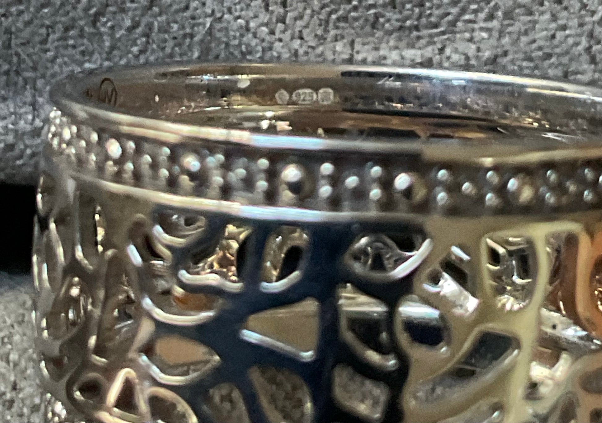 This is a very eye catching Clogau ring, with a wide band measuring 1cm across. It features the Royal Roses design running all the way around the ring in 925 sterling silver, with a touch of rose gold. It has all the expected Clogau stamps and hallmarks and hasn’t been worn, other than for these photos, so is in excellent condition. It comes in the Clogau box shown, with a Clogau cleaning cloth.