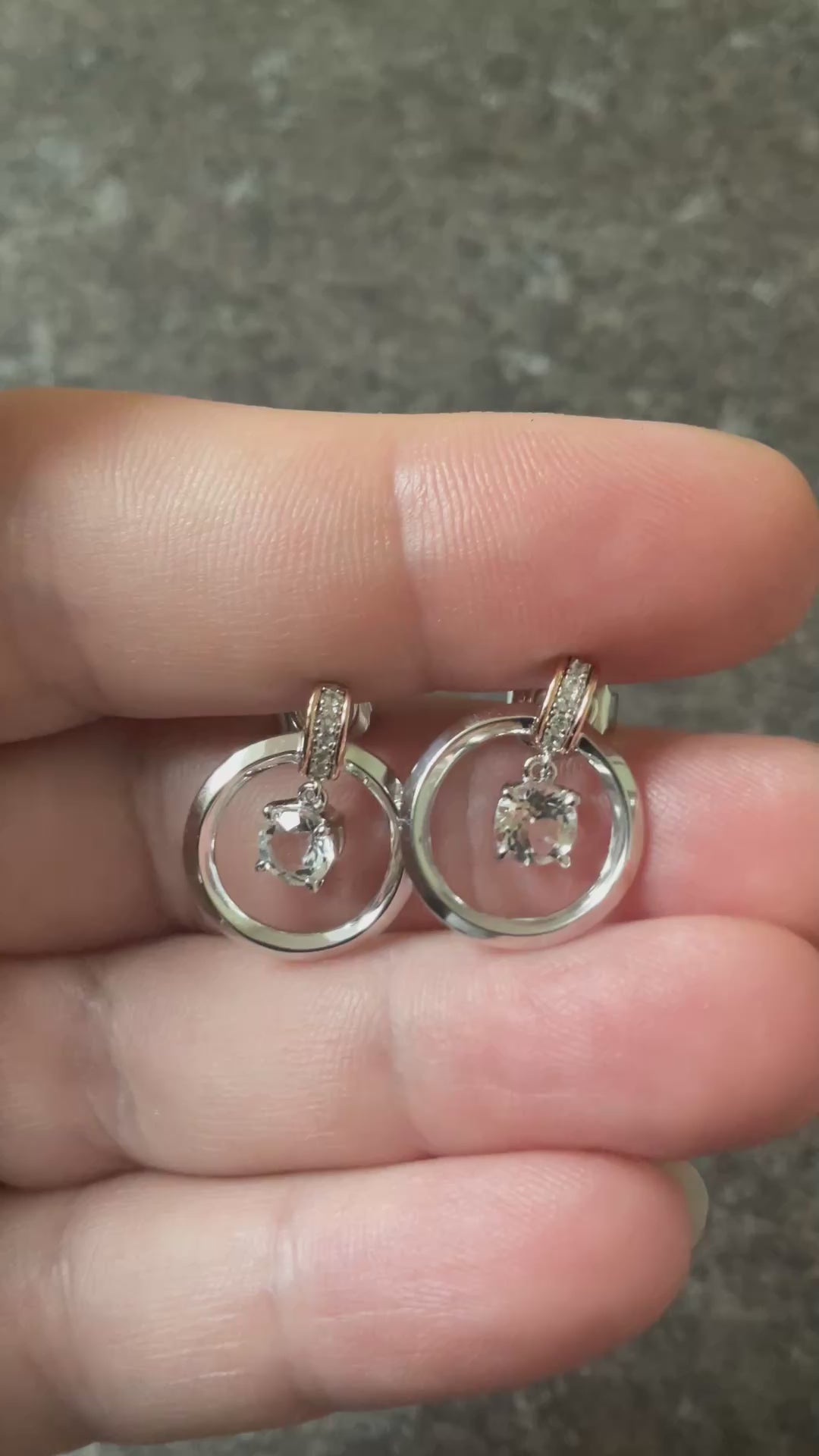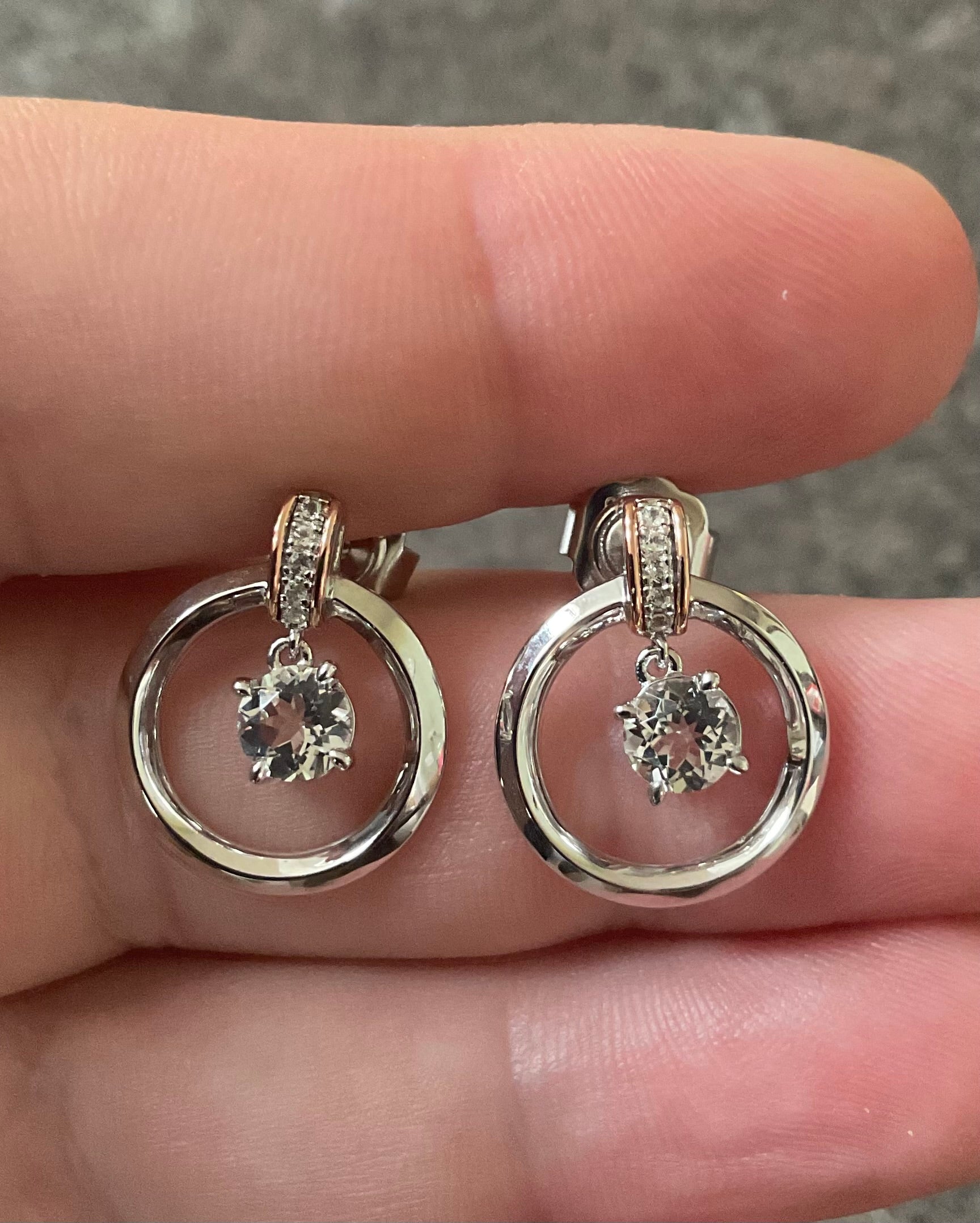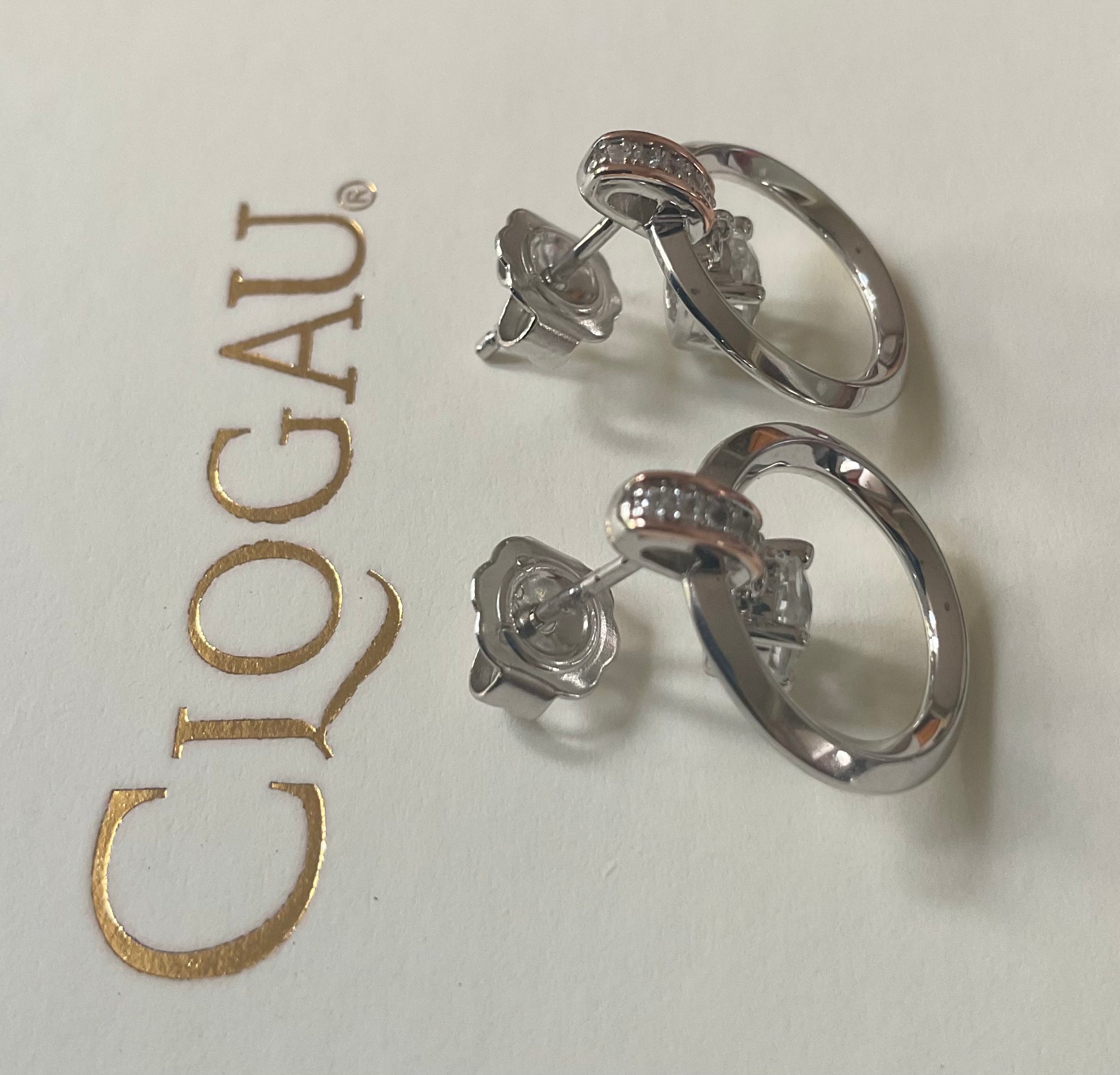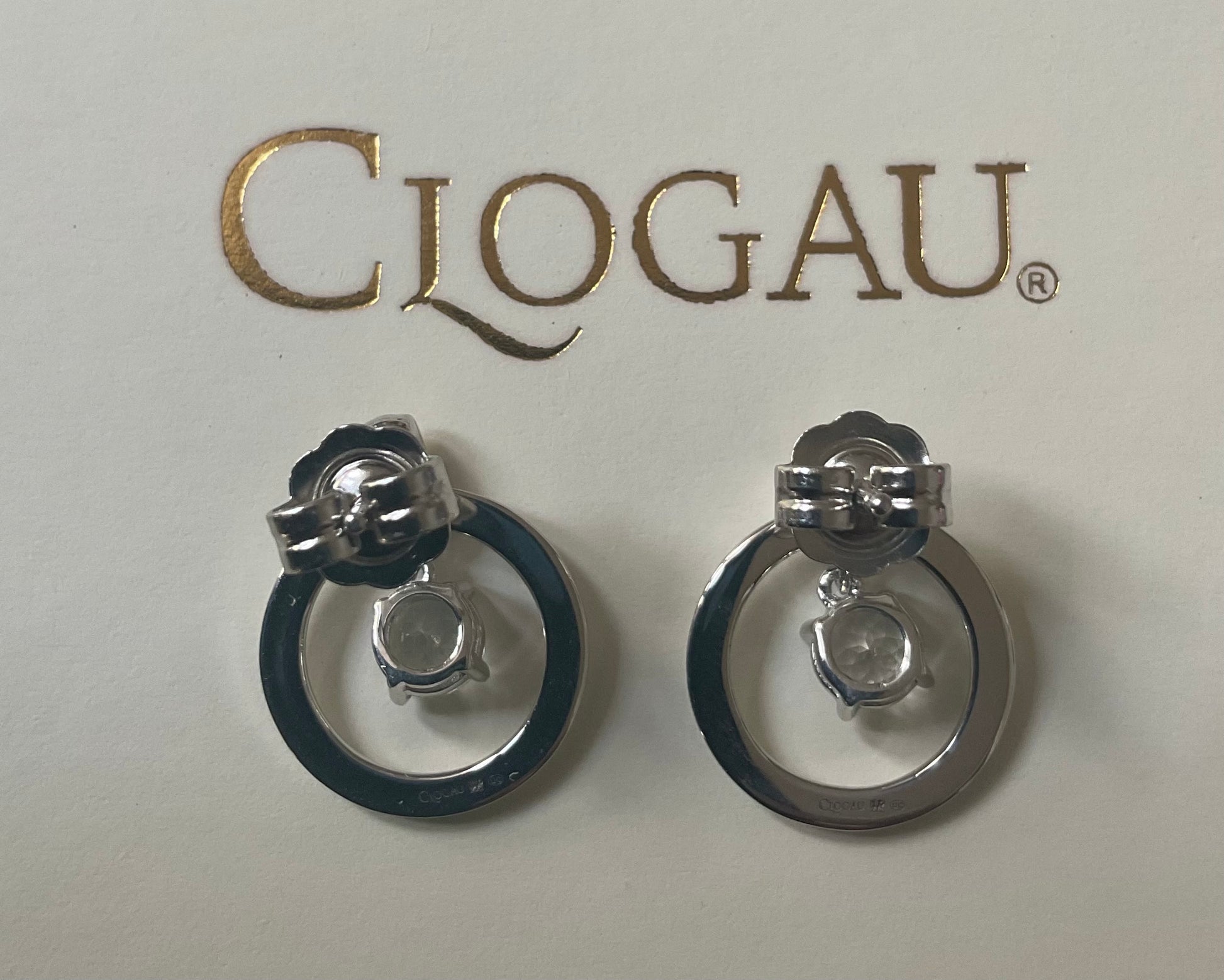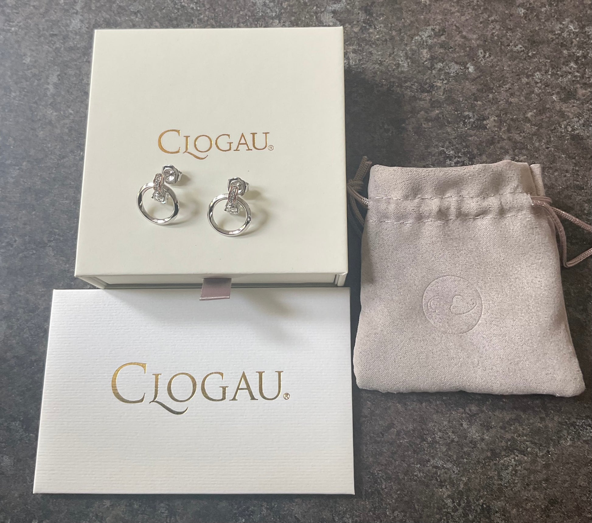 These earrings are just beautiful! Within a ring of 925 sterling silver is a 5mm round cut shining white topaz stone, dangling freely to catch the light and sparkle away. Above this is a little strip of small white topaz stones edged in rose gold. The earrings have a drop of around 1.8cm and are 1.5cm wide. The posts, back of the earrings and the butterflies have all the expected Clogau stamps and silver hallmarks. They are in excellent, new condition as they have never been worn. They come in the Clogau box and specially designed earring pouch with a divide to prevent the earrings from rubbing together. They also have a Clogau cleaning cloth.