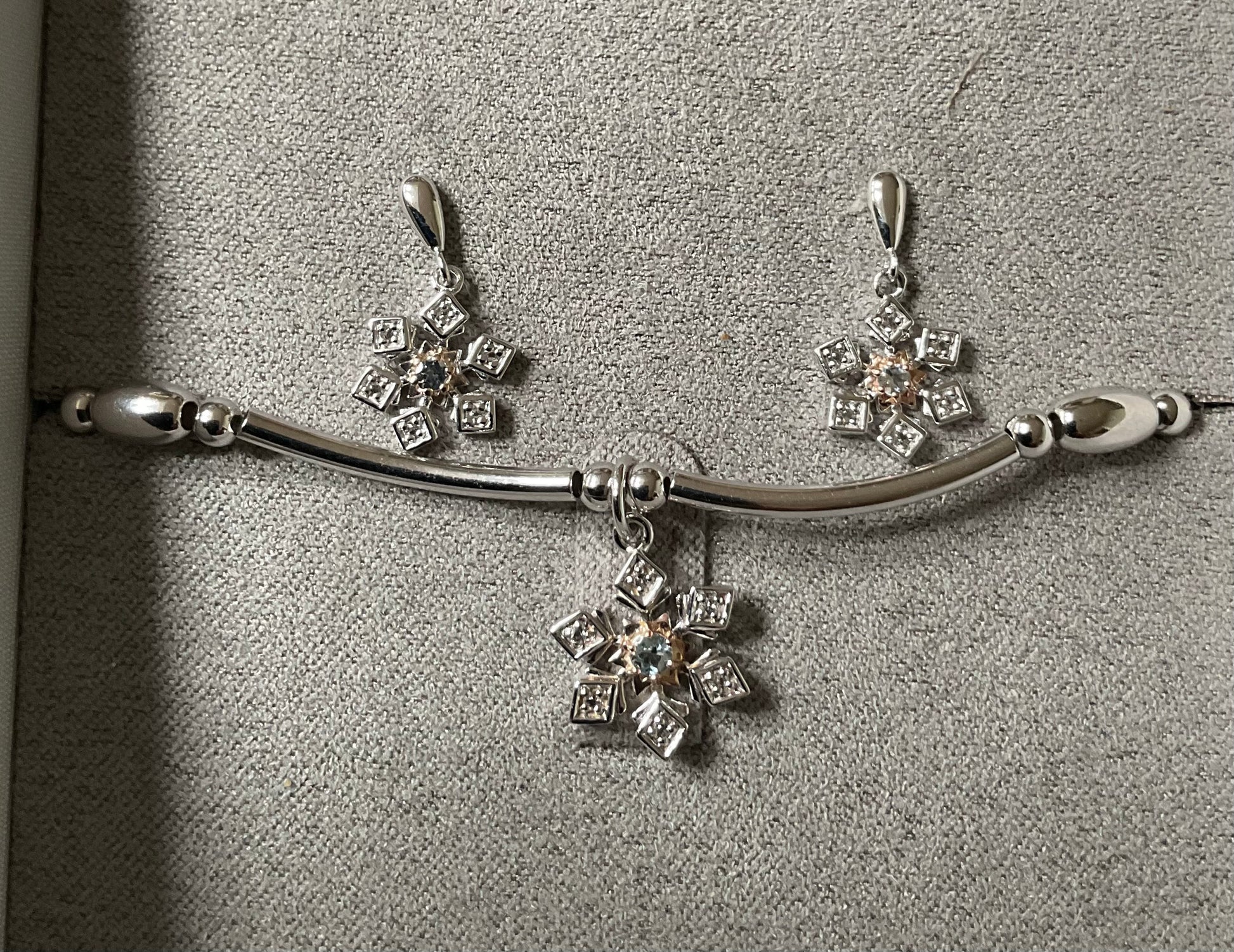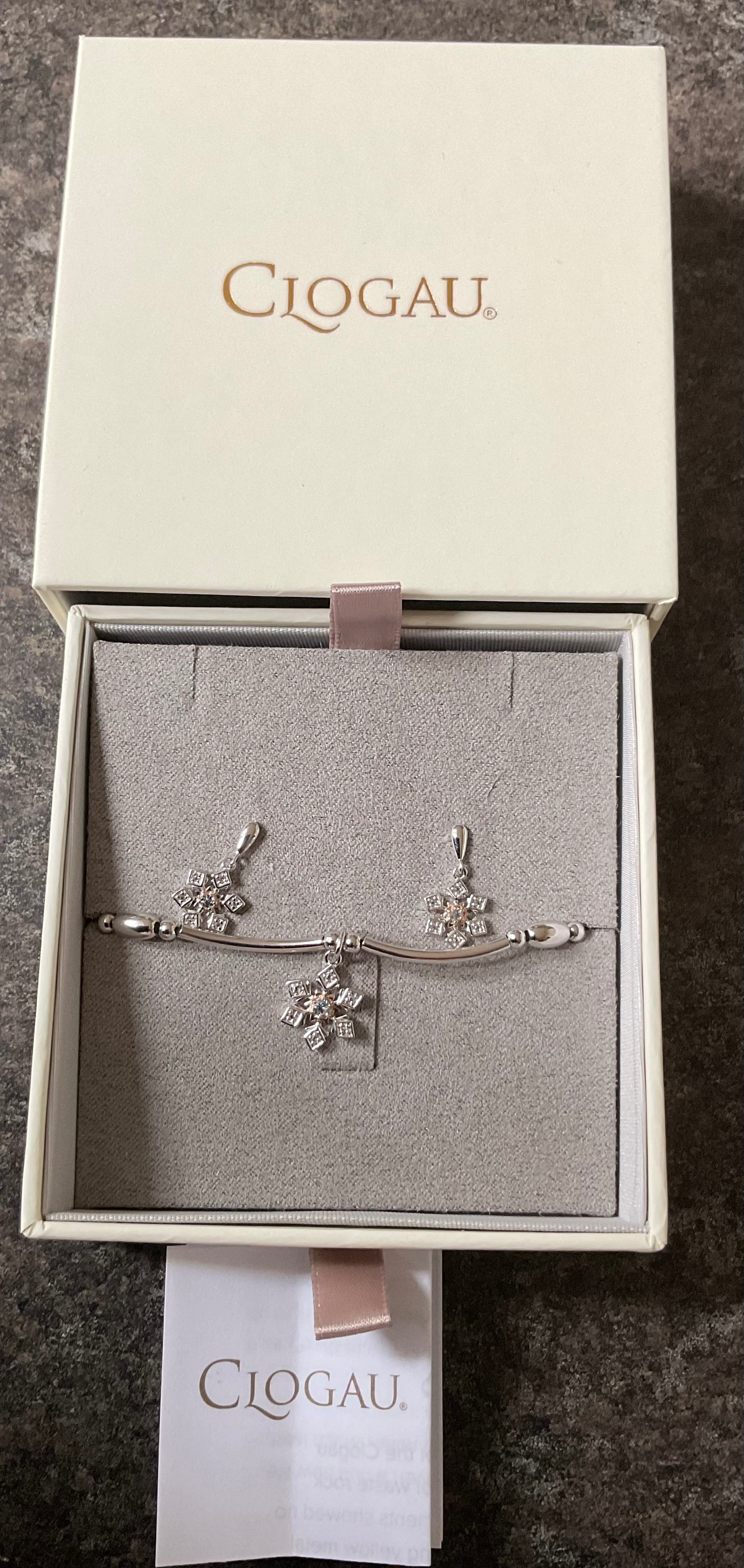 This beautiful set is brand new and hasn’t even been taken out of the box. The little snowflakes feature sparkling topaz stones set into sterling silver with a touch of rose gold The earrings have a drop of 1.8cm and the bracelet looks to be 18cm. They will come in the box shown with a Clogau cleaning cloth.