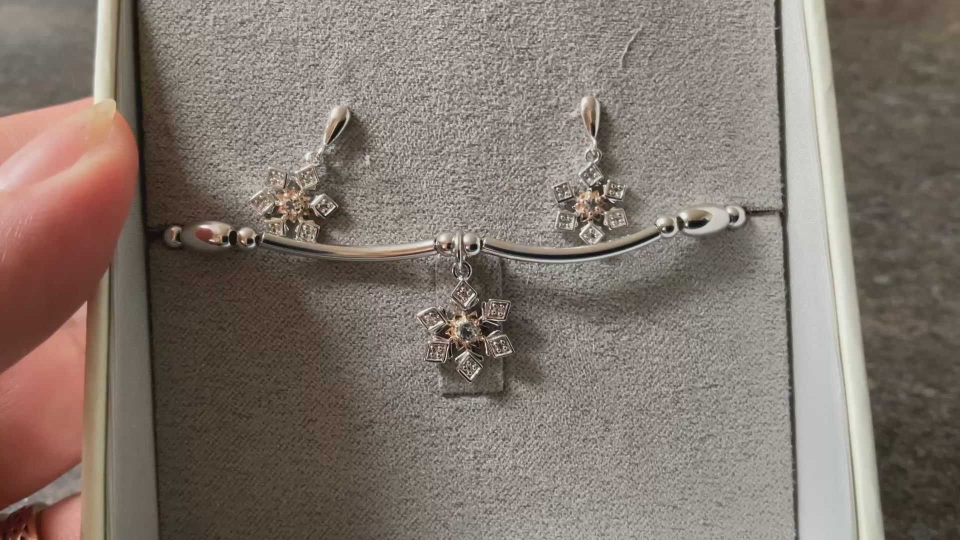 Clogau Snowflake drop earrings and Snowflake affinity stacking bracelet in silver and rose gold with topaz