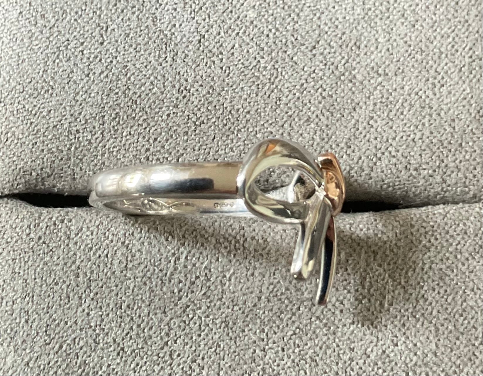 This is a really pretty ring that has been worn before but looking around it by eye, I can’t see any signs of wear, it’s in excellent condition. The silver bow has a central rose gold leaf and one of the tails has 3 small sparkling diamonds. The ring is a size L and the bow measures about 12mm from top to bottom. It is stamped Clogau and has a silver hallmark. The ring weighs 2.34g. I will put it in a Clogau box but it might be one with a Clogau pouch rather than a ring box. Please let me know if this is a problem.