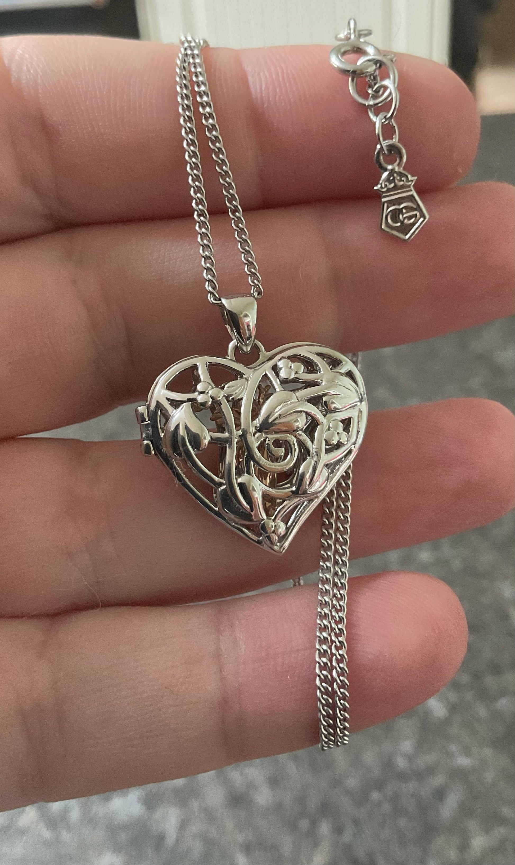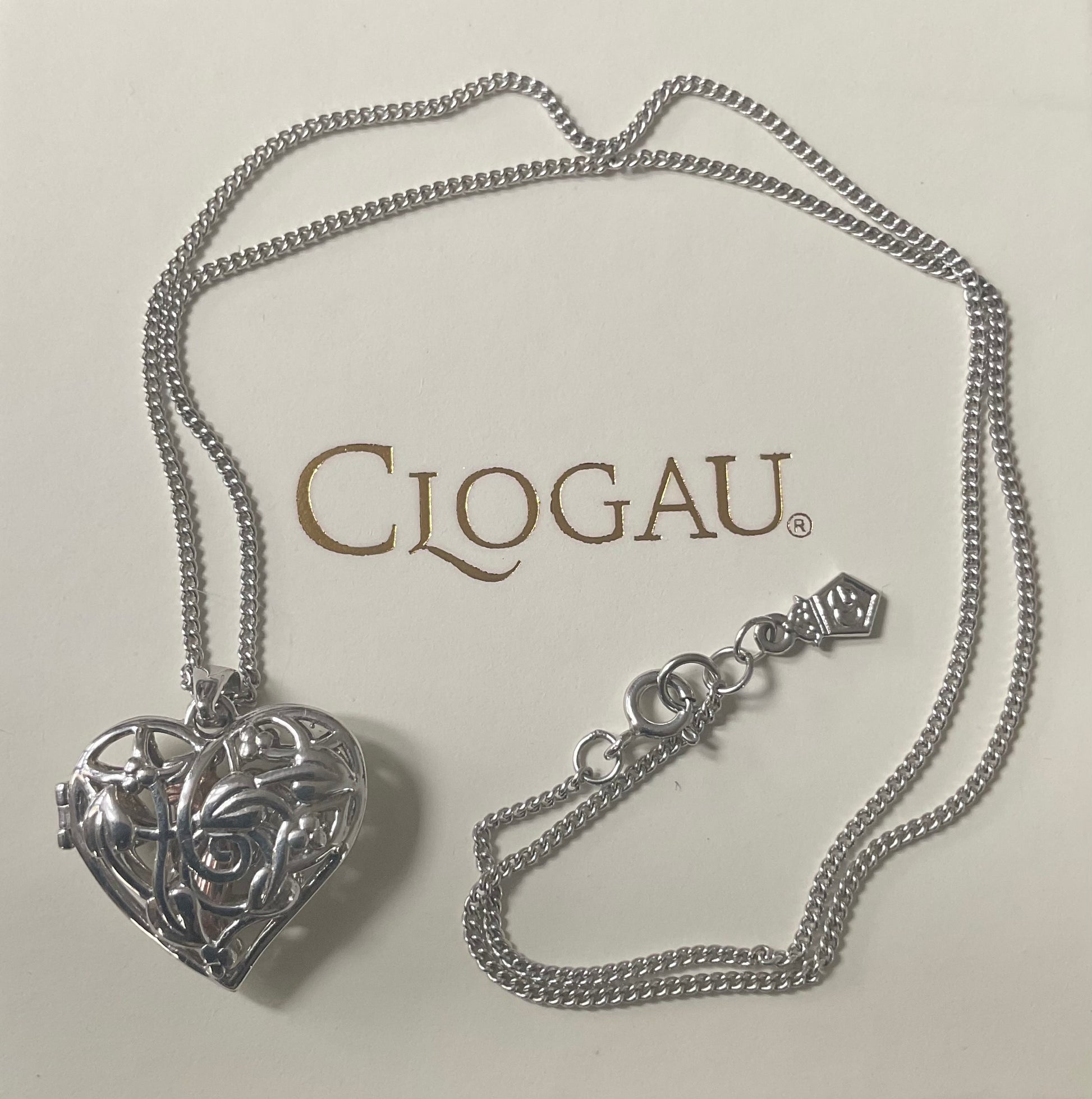 This is a beautiful necklace featuring a silver heart locket covered front and back in the lovely, trailing leaves and vines of the Tree of Life design. Inside the locket is a 1.4cm rose gold fairy charm, although I like to think of her as a guardian angel. The pendant measures 2.5cm from the top of the bale and 2.3cm wide. The Clogau silver chain is 18” in length with the silver Clogau tag at the end. The clasp of the locket snaps shut securely (although as with a lot of these lockets, the hinge isn’t tight, so you align the front and back of the locket before clipping it shut) and the necklace is in great preloved condition, you’d have to look closely for any signs of wear. I have spotted a tiny area of the chain where one link seems possibly a little bigger than the others, so makes it not quite lay flat (feels like a little bump as you run it through your fingers). I’ve shown it to 3 people and they didn’t spot it until I pointed it out and told me I was being too picky but anyone who knows me knows that I try to be 100% honest with my descriptions. It will come in a Clogau White Necklace box. I am selling the matching earrings and am happy to combine postage on request.