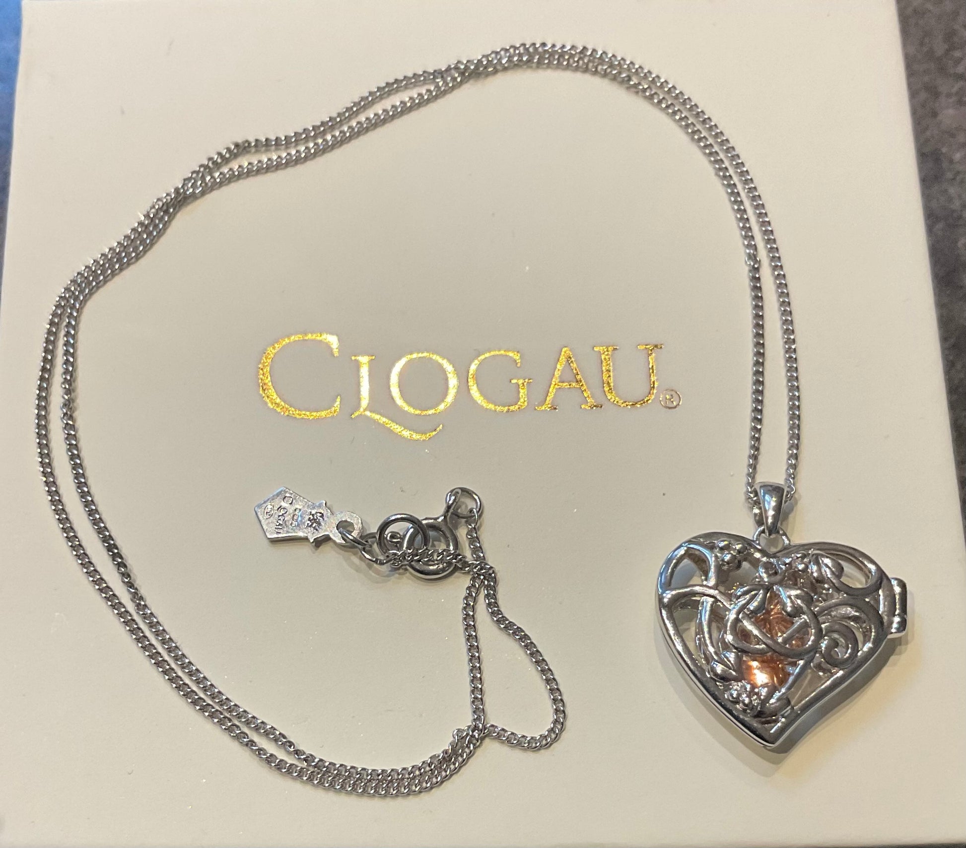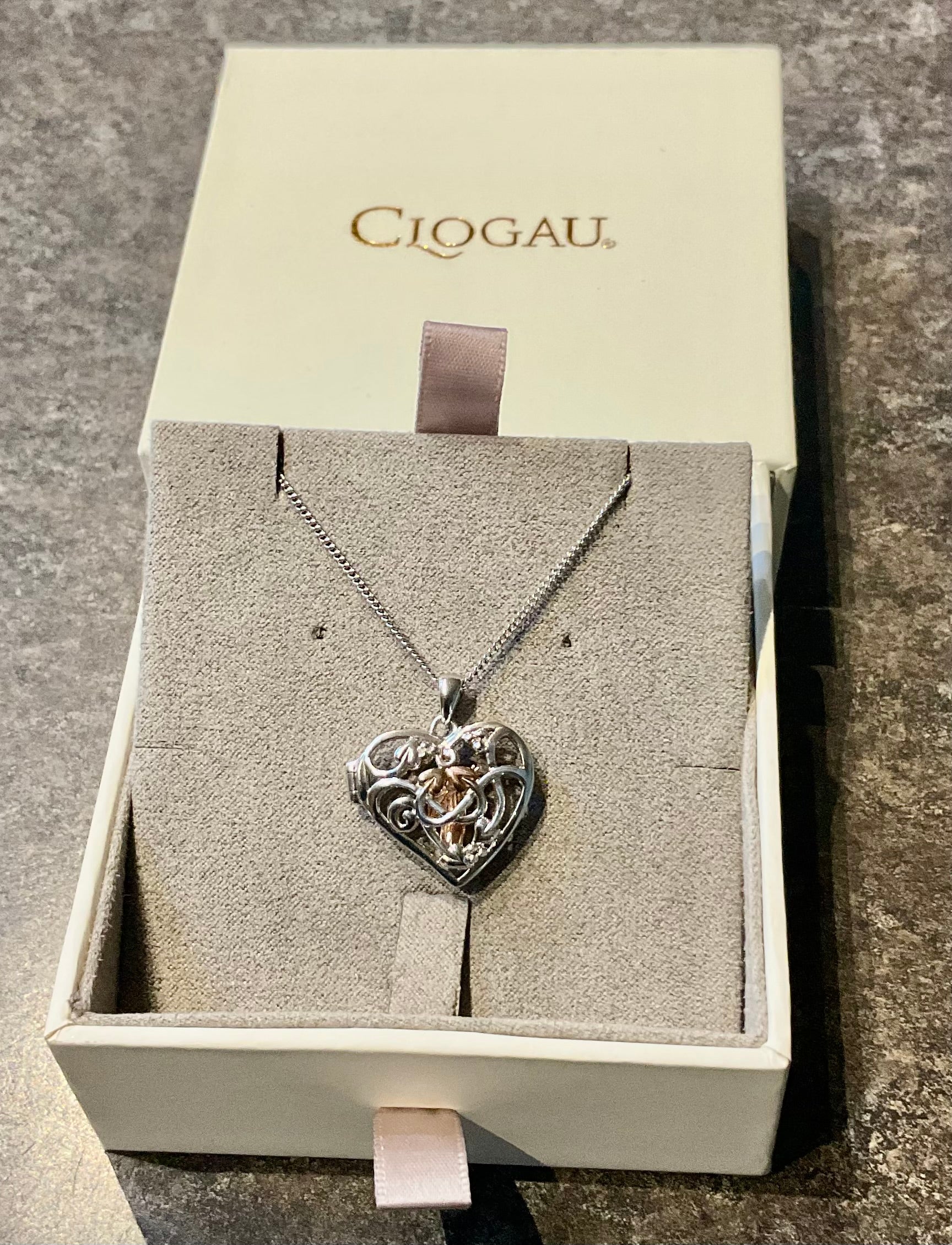Clogau Fairy Heart Locket pendant necklace in silver and rose gold in excellent preloved condition, I can’t see any notable signs of wear. The beautiful sterling silver heart pendant is covered in the Tree of Life pattern on both sides and opens to reveal a rose gold fairy or as I call her, a guardian angel. The pendant measures 2.5cm from the top of the bale and 2.3cm wide and the clasp shuts nicely with a satisfying snap! The Clogau silver chain measures 18” in length and the silver tag has the Clogau stamps and hallmarks on. It will come in a White Clogau box.