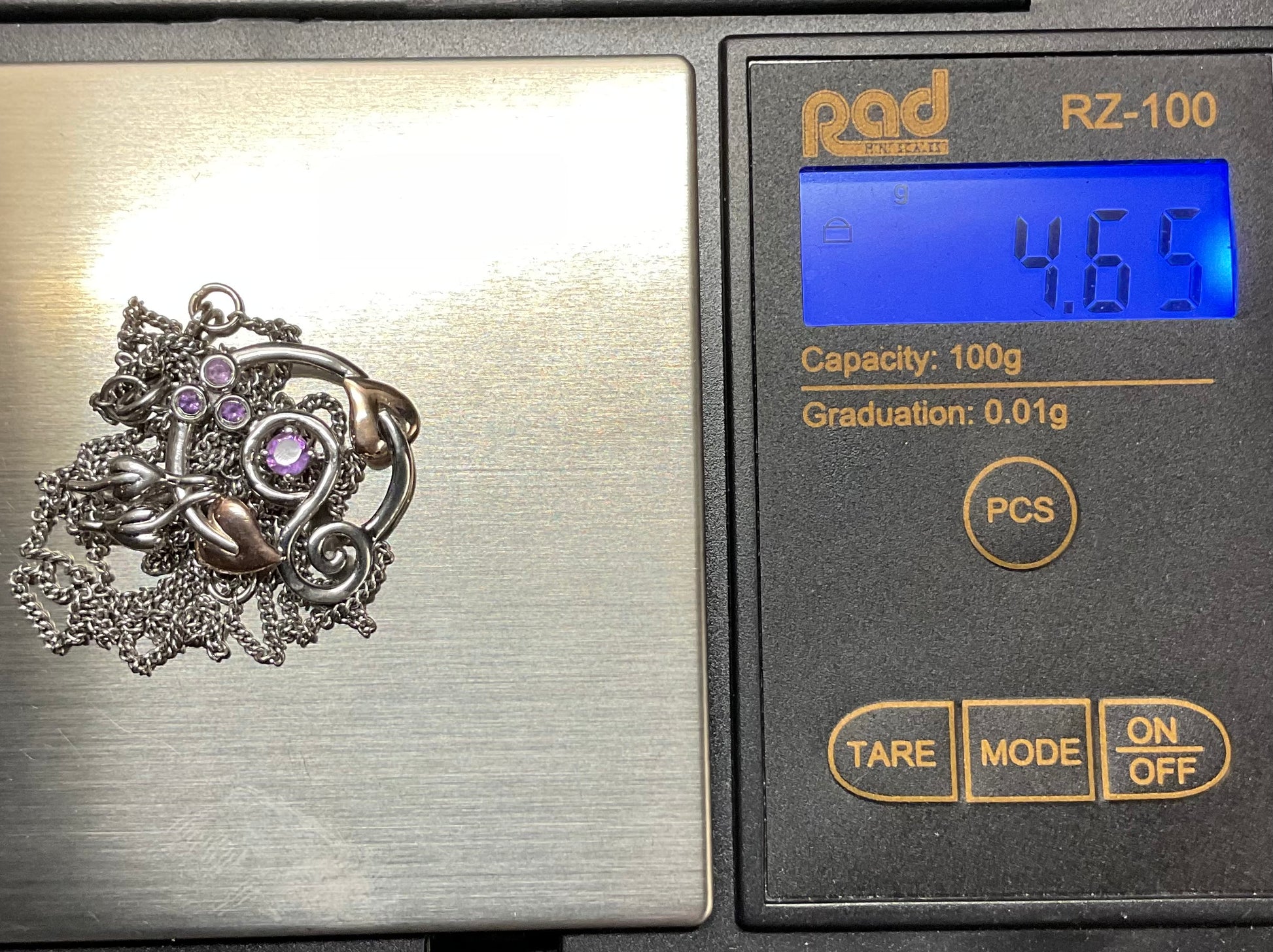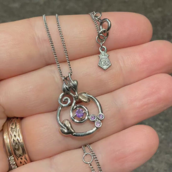 This lovely Clogau necklace isn’t seen very often. The pendant features the Tree of Life Origins design, of silver and rose gold vines and leaves but this version has beautiful purple round cut Amethysts, instead of the more usual white topaz stones. Also, the silver of this necklace has been oxidised which means it’s a darker shade of silver, giving it a slightly more gothic appearance. The pendant measures 2.4cm from the top of the bale and 1.8cm across. The back of the leaf has the Clogau stamps on. The Clogau silver chain can be worn at 18, 20 or 22” and the little silver tag has the Clogau stamps and hallmarks on. This necklace is in good, preowned condition with small signs of wear. It will come in a Clogau box.