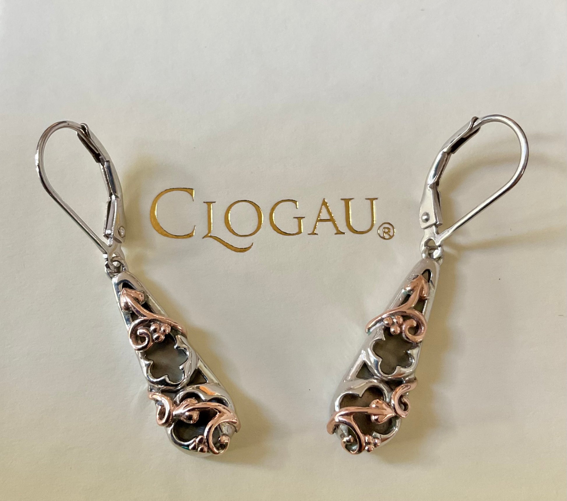 Clogau Tudor Court Black Mother of Pearl drop earrings in silver and rose gold