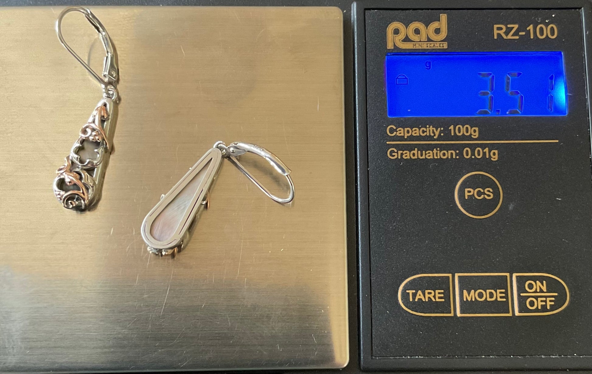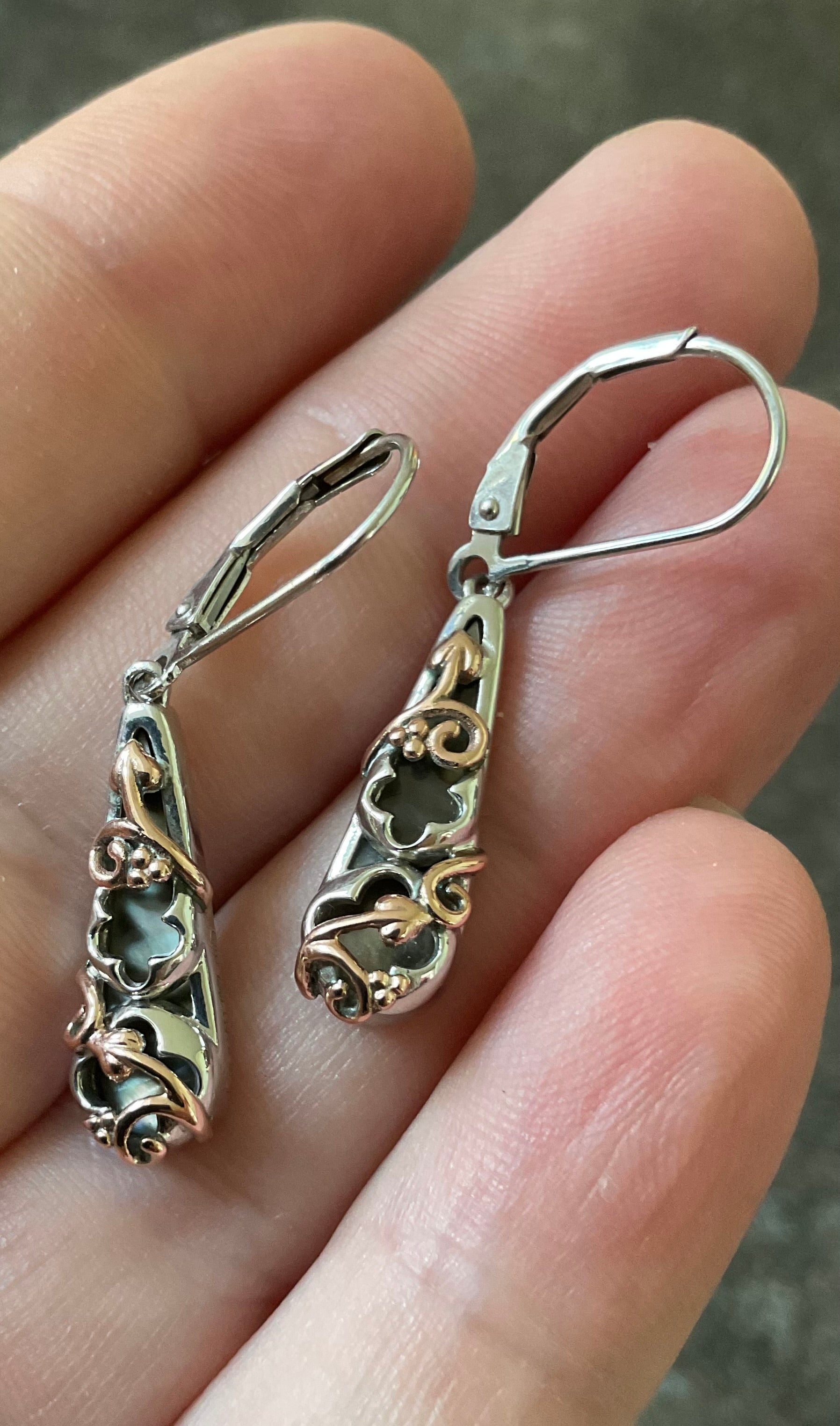 These beautiful teardrop shaped earrings feature a silver and rose gold, intricate Tudor Court design in the foreground but set behind this, is a lovely black mother of pearl layer, giving little peaks of peacock colours as the light hits it. They measure 3.5cm from the top of the hook and 7mm at their widest. They have all the expected Clogau stamps and hallmarks and are in good preloved condition, with only small signs of wear on closer inspection. The lever back clasps are very secure. They will come in a Clogau box and grey pouch.