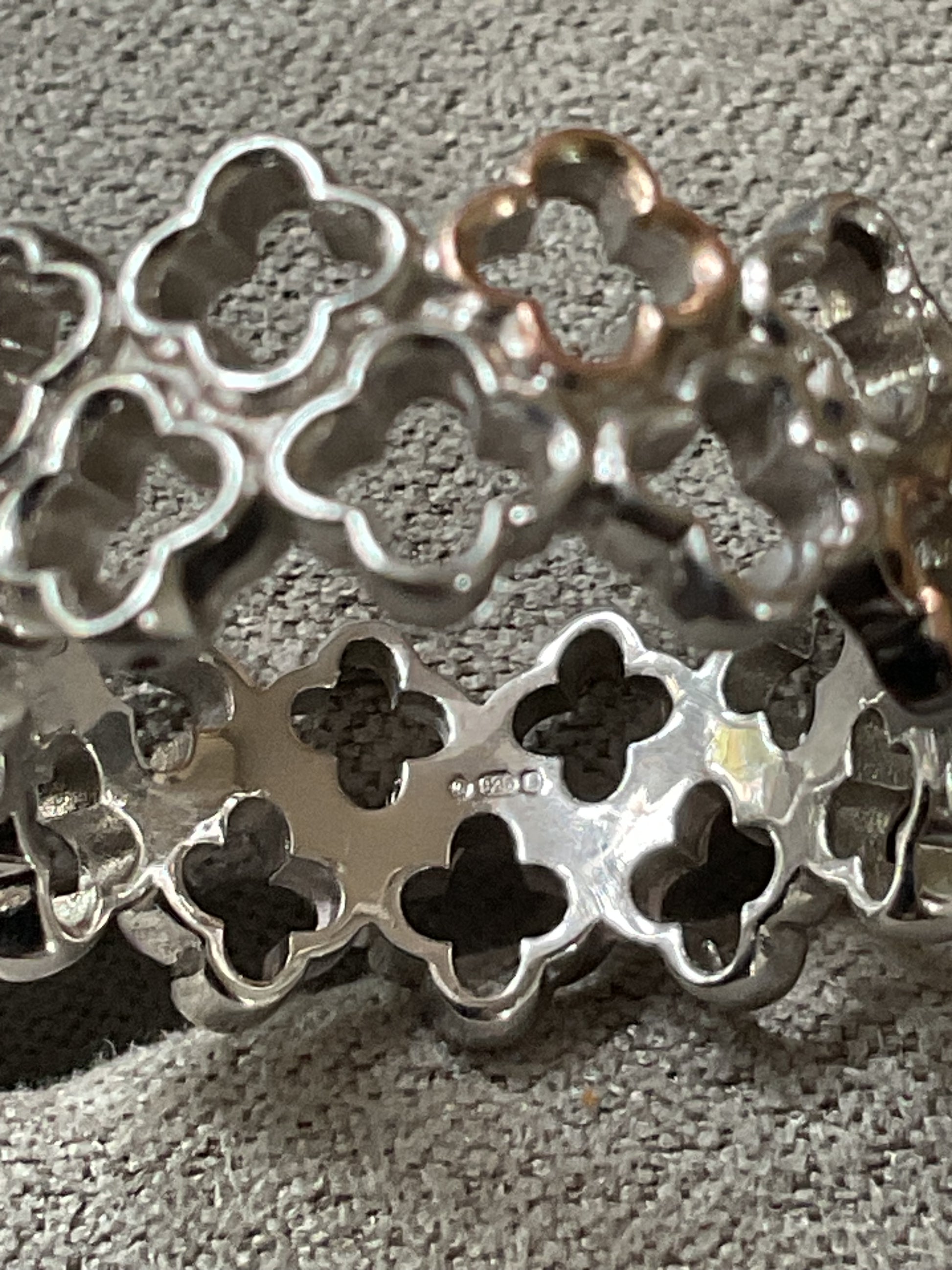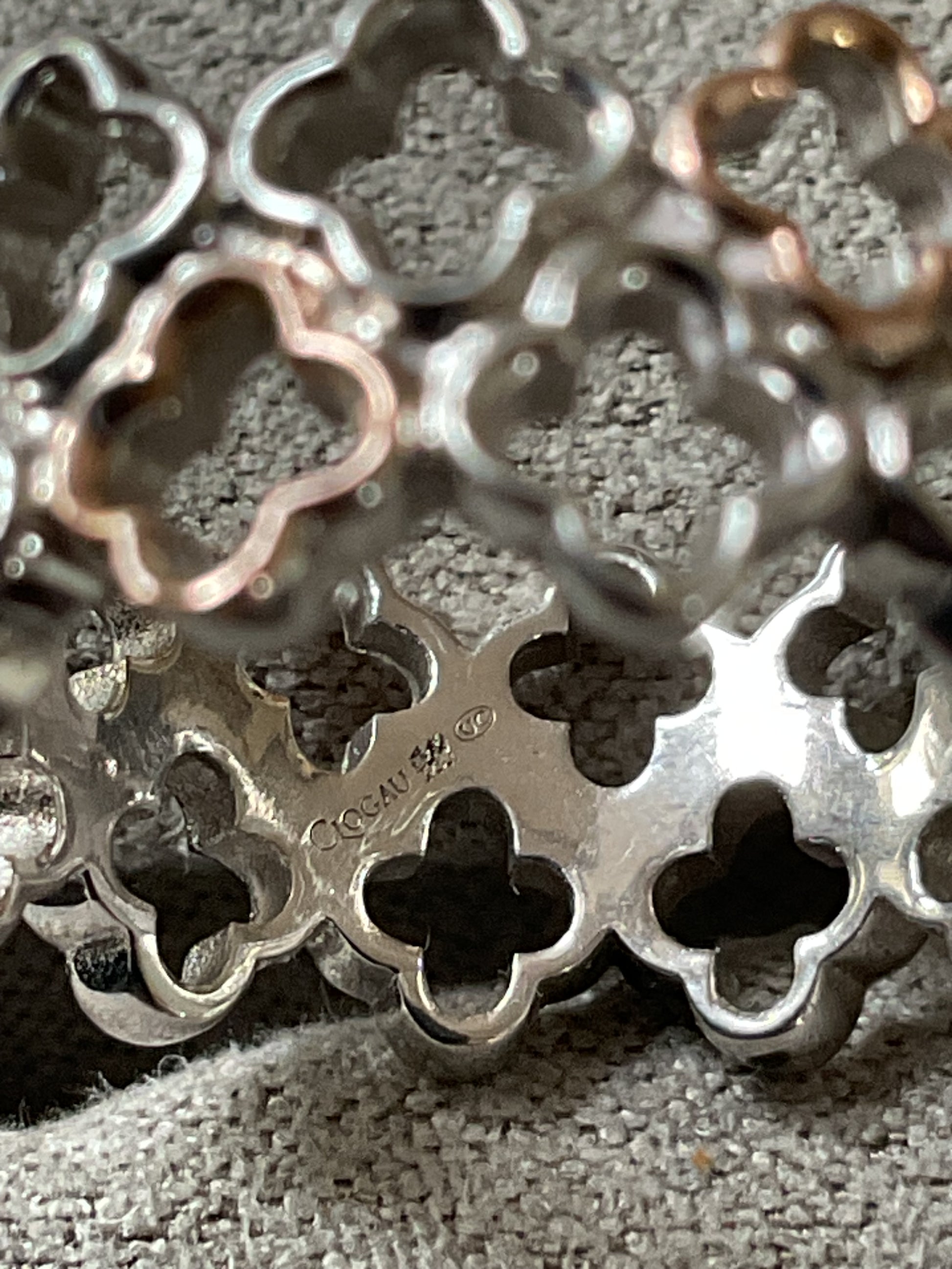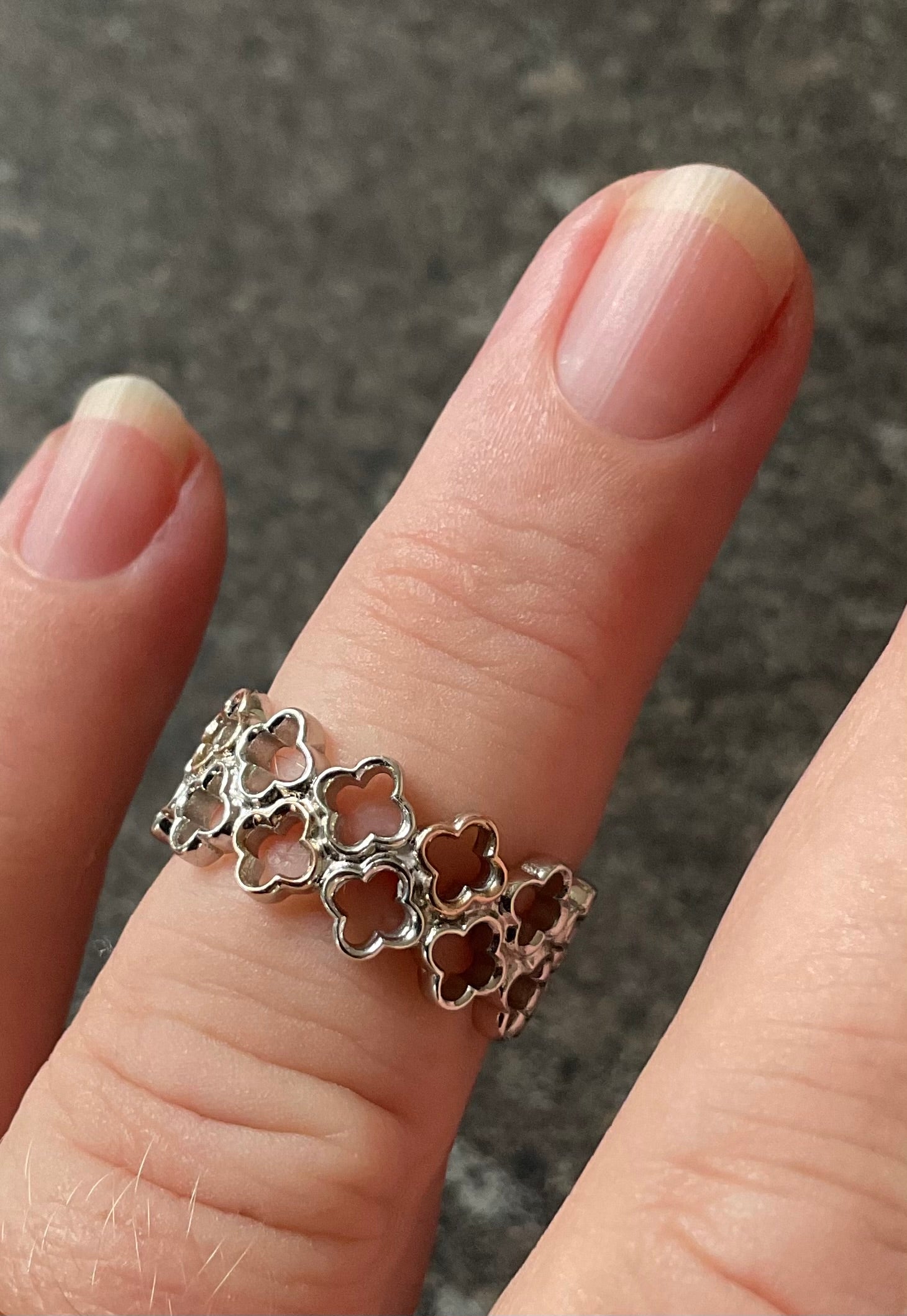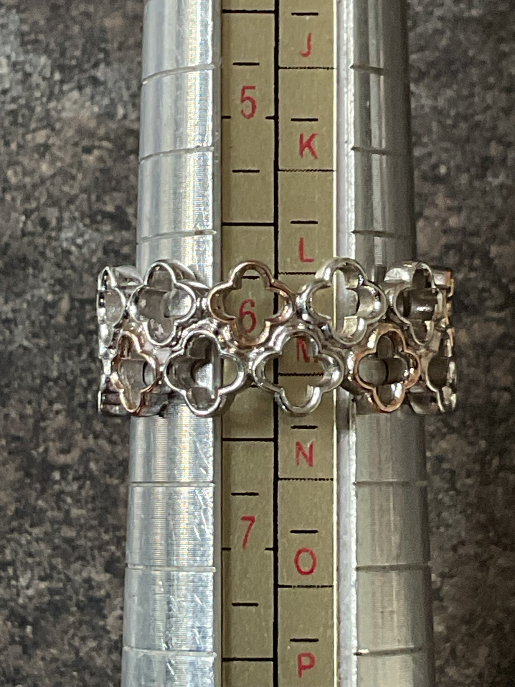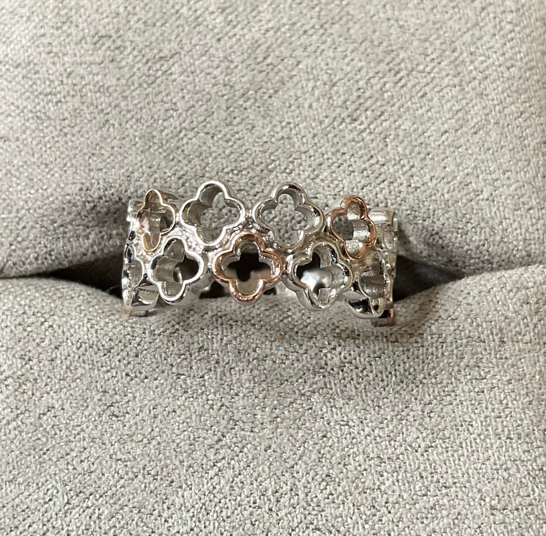 This is a very pretty Clogau Tudor Court ring, created in association with Historic Royal Palaces. It takes its inspiration from Anne Boleyn’s Gateway at Hampton Court Palace and features a double row of 925 sterling silver floral outlines with 5 of the alternate front ones having a rose gold outline. The centre line of the ring sits around an L1/2, as you can see on the ring sizer and the band is approximately 9mm wide. It is preowned but in good condition with small signs of wear on close inspection. It will come in a Clogau box.