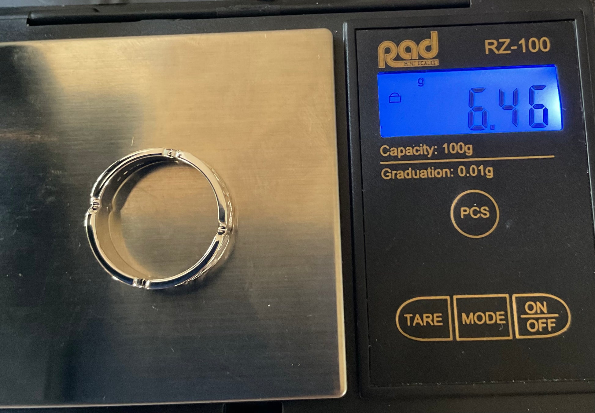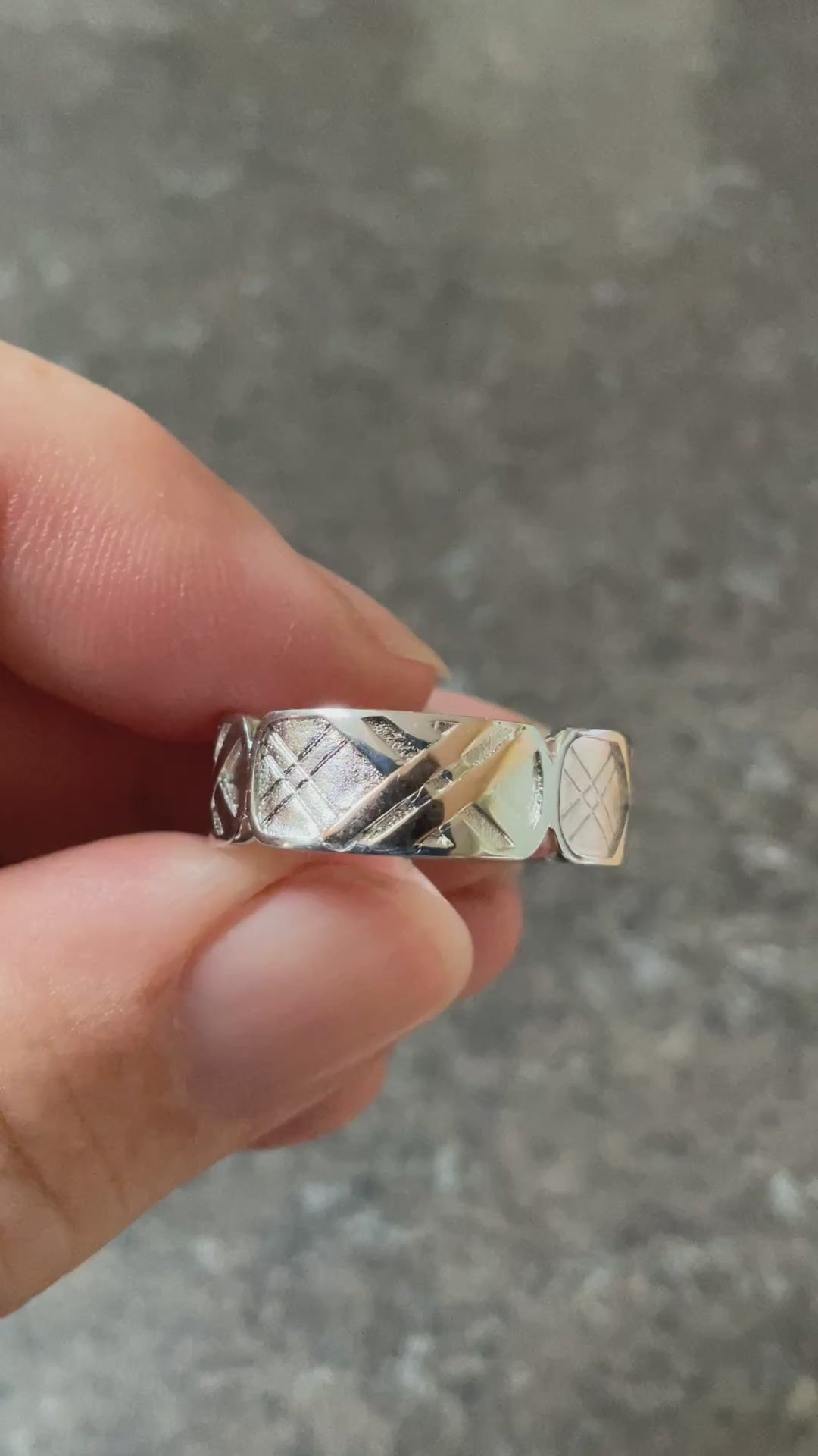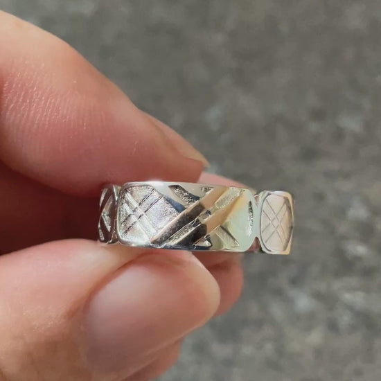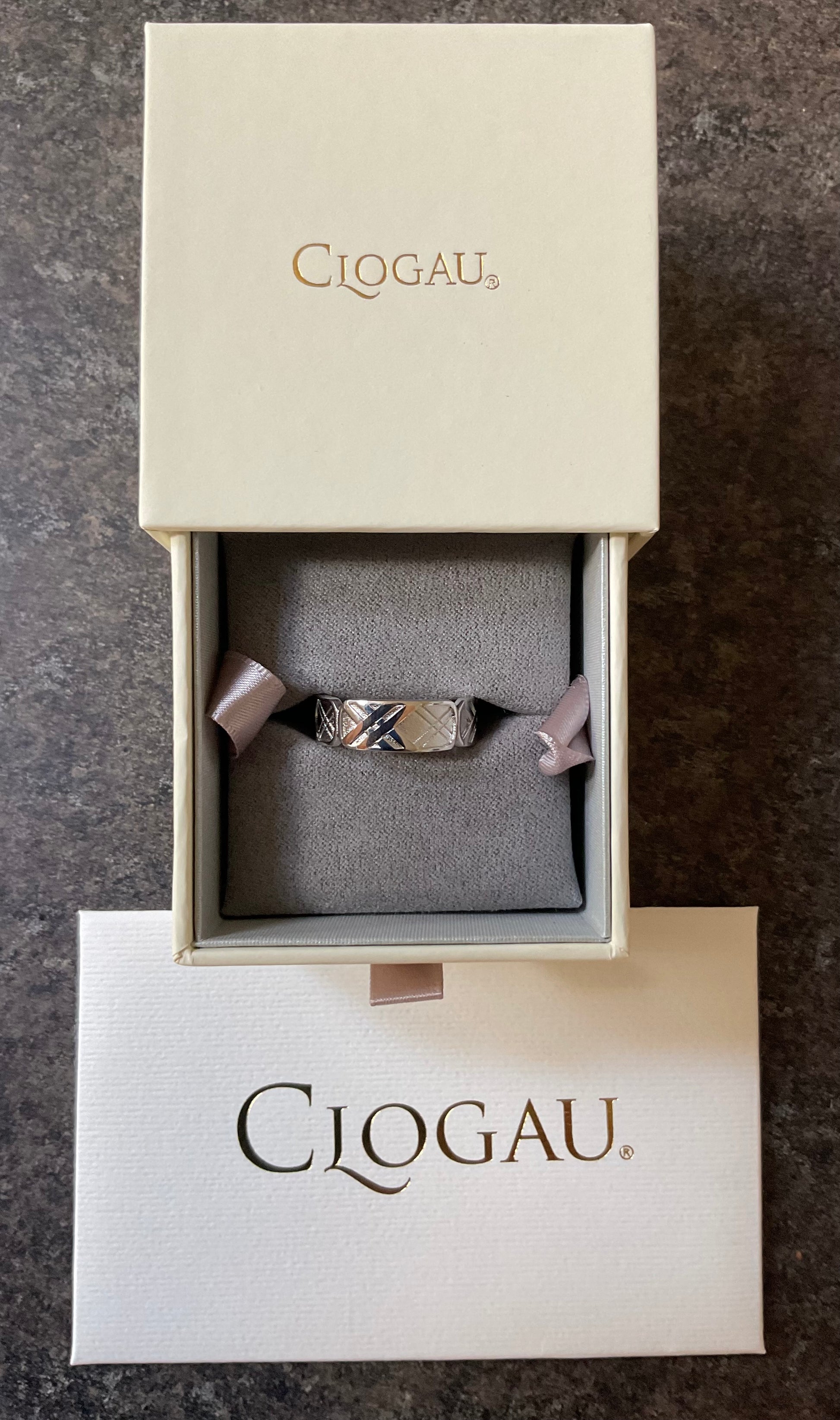 This is a really attractive Clogau ring that I believe is suitable for ladies and gentlemen alike. It features 4 rectangular panels, each containing a Welsh Tartan design. In one of the panels, 2 of the lines of the pattern have a rose gold accent. The ring is 7mm wide and has all the expected Clogau stamps and hallmarks. This ring is in excellent condition, having only been taken out of its box for these photos. It comes in a white Clogau ring box with a Clogau cleaning cloth. I have this ring in a size T and U.