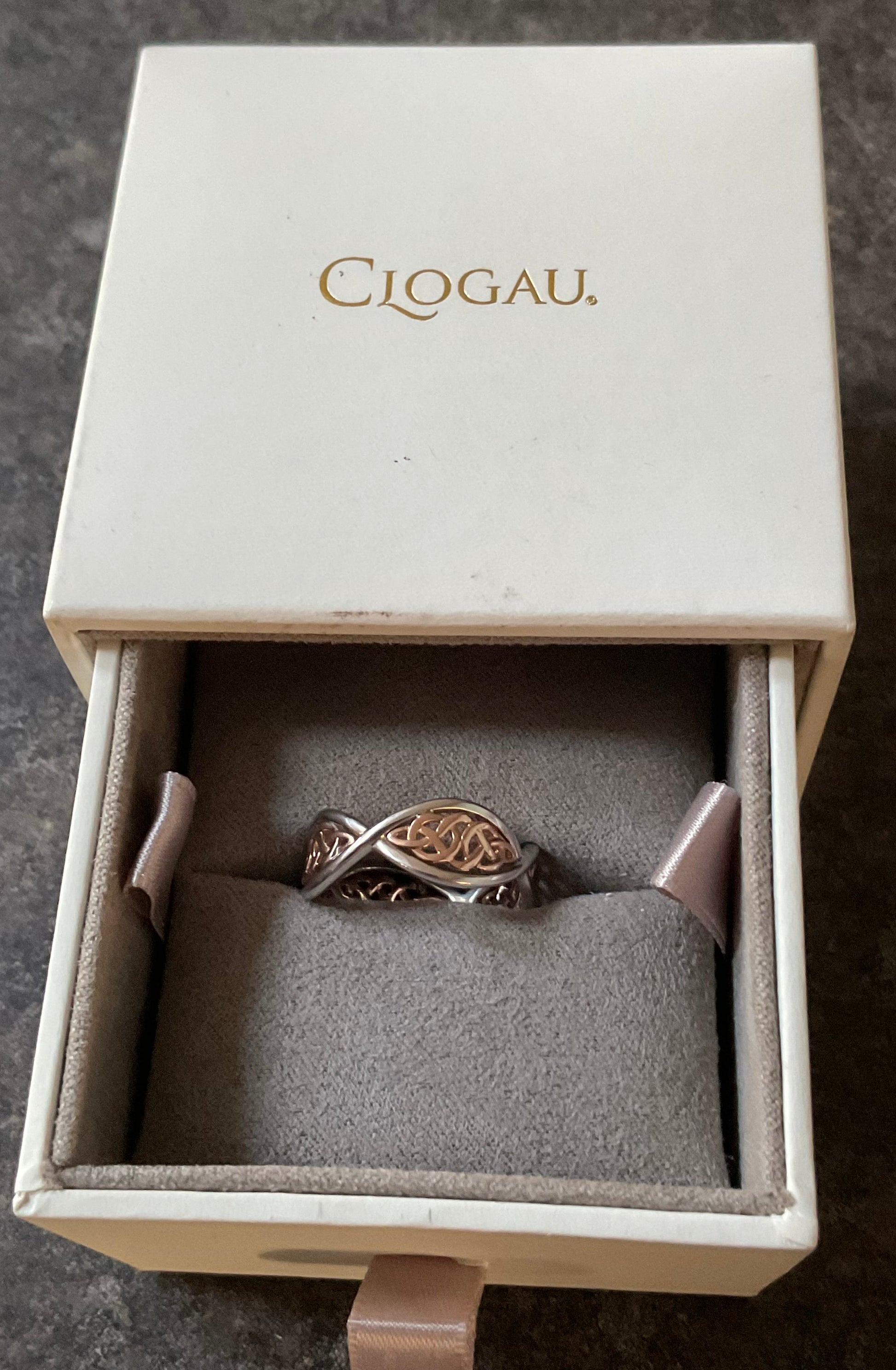Clogau Welsh Royalty ring in silver and rose gold, size P. It is in excellent preloved condition on the outside but there are some scratches on the inner band that I didn’t notice until viewing under the jewellers loupe, and they certainly won’t be noticeable when you are wearing this beautiful ring. It features an infinite pathway of sterling silver waves, bordering stunning rose gold Celtic weave patterns. It measures 8mm across at its widest point and has all the expected Clogau stamps and hallmarks inside. It comes in a white Clogau box (has some small marks).