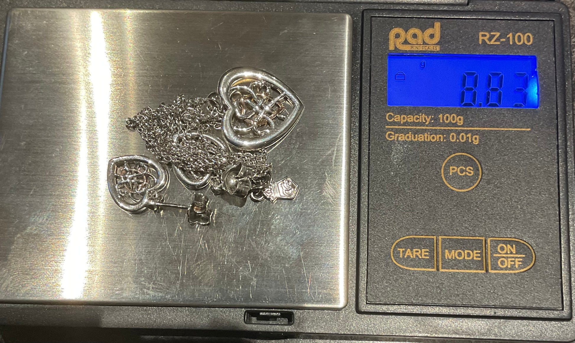 Clogau Welsh Royalty Heart pendant necklace and earrings set in silver and rose gold, in good preloved condition with small wear on closer inspection. The beautiful pendant features a silver heart surround, encompassing a silver and rose gold Celtic weave pattern. This pattern is the same on both sides, so you never have to worry about which way to put the necklace on. It measures 2.2cm from the top of the bale and 1.8cm at its widest point. The Clogau silver chain can be worn at 18, 20 or 22”. The little silver tag has the Clogau stamps and hallmarks on. The lovely earrings measure 1.6cm long and 1.2cm across at their widest point and feature exactly the same design as the pendant. They are Clogau stamped on the bottom edge and the butterfly backs and hallmarked on the posts. The posts may not be 100% straight but this won’t be noticeable when wearing them. They come in a black double Clogau box (small wear). I can sell the necklace and earrings independently or as a set.