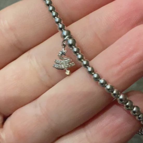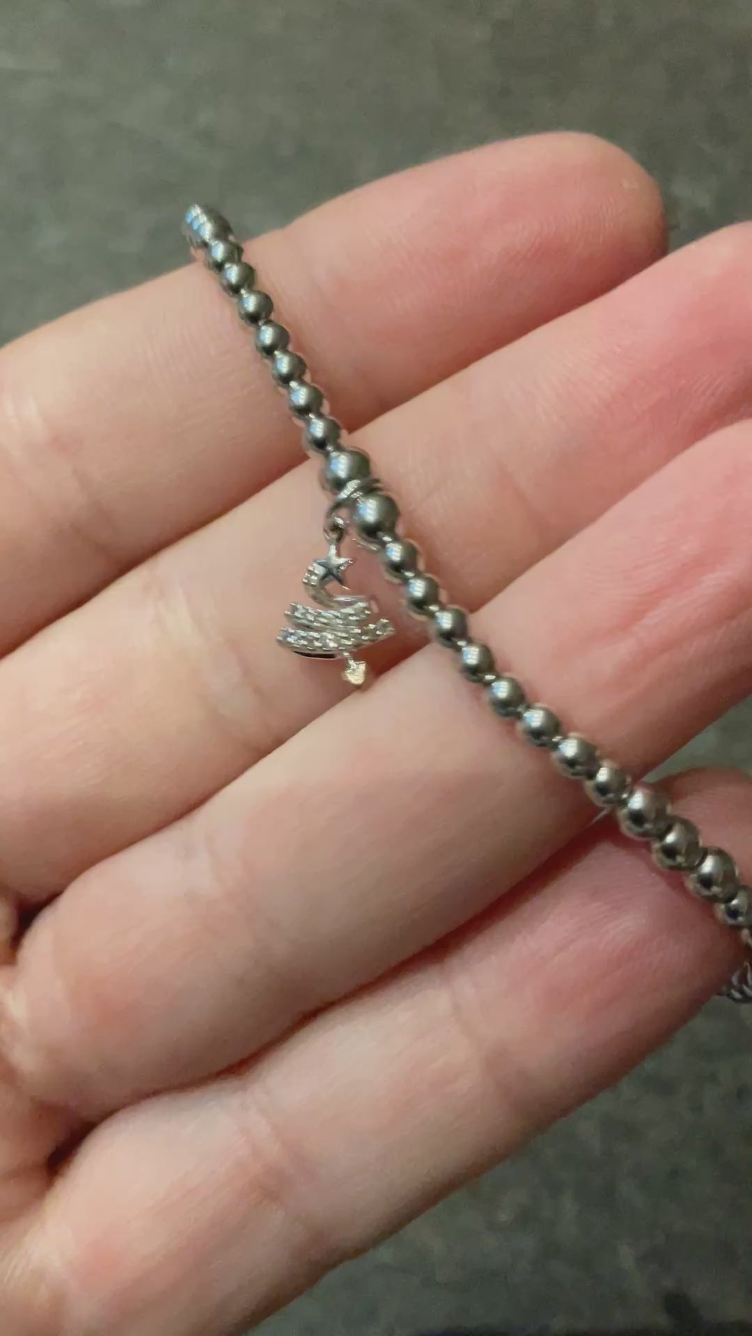 This is a beautiful Clogau bracelet featuring a Christmas Tree charm that measures 1.5cm high and 8mm wide. There is a silver star at the top of the tree, followed by a round cut white topaz stone and then lots of tiny sparkling white topaz stones along the rest of the tree. At the bottom is a little rose gold Tree of Life leaf. The whole band is made up of round silver beads and there is a bit of a stretch to the bracelet. It’s hard to measure how big it is but I’d say it’s about 17-18cm. The little tag has the Clogau stamps and hallmarks on. It’s never been worn, so is in excellent condition and comes in a Clogau box with Clogau cleaning cloth.
